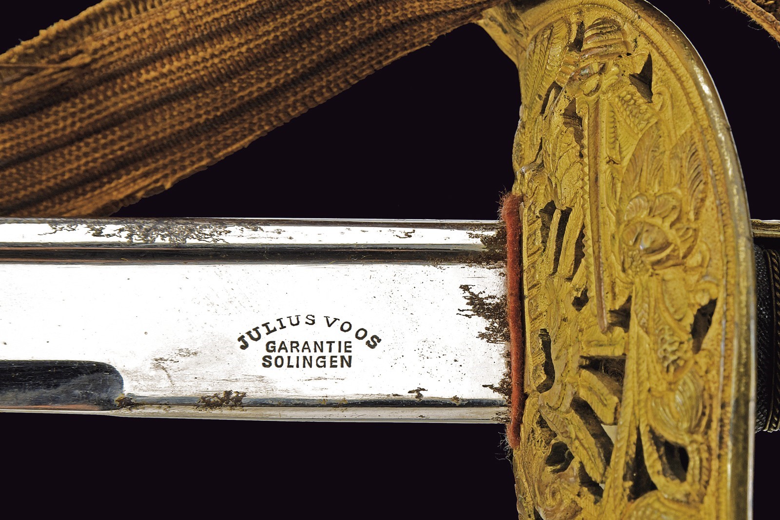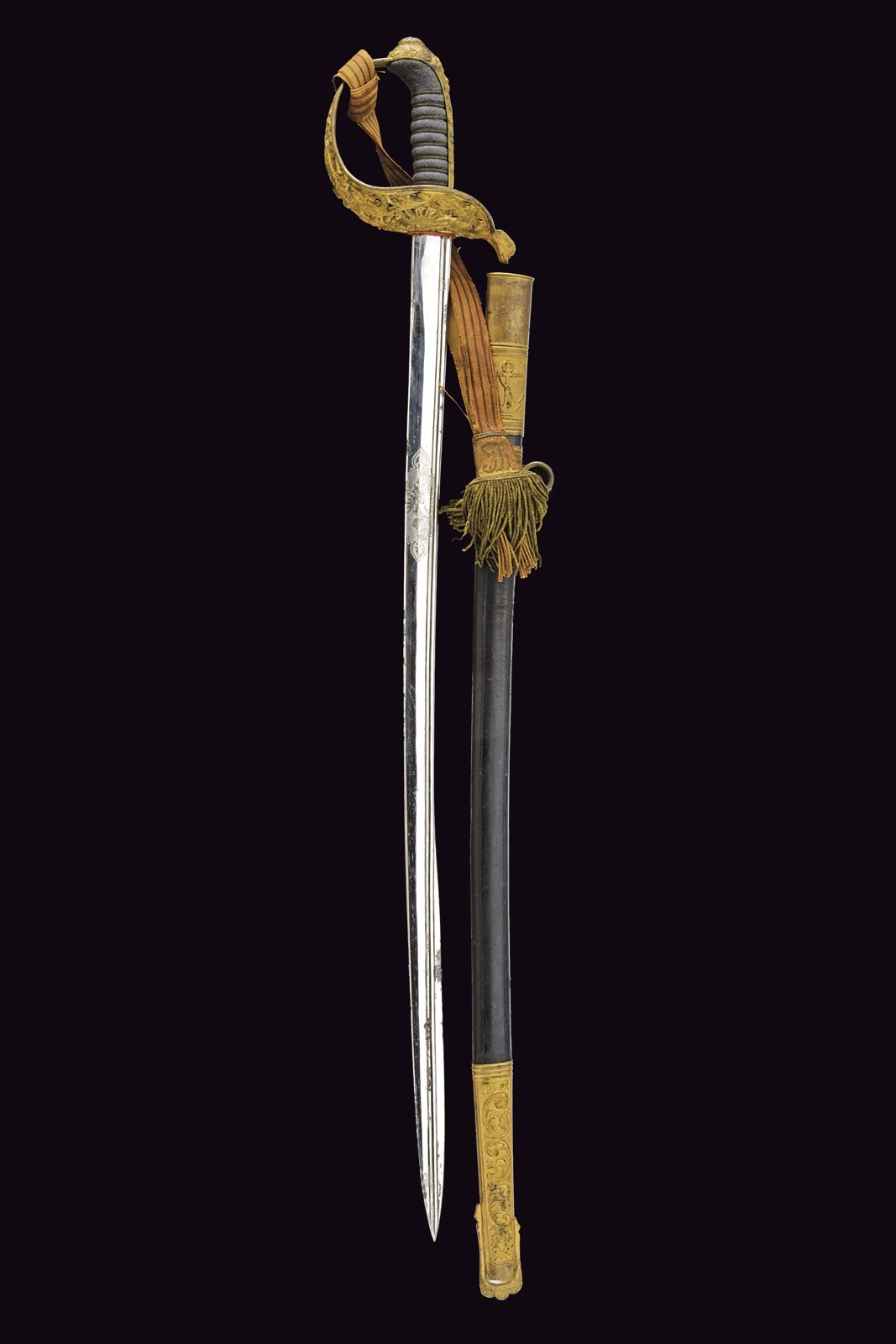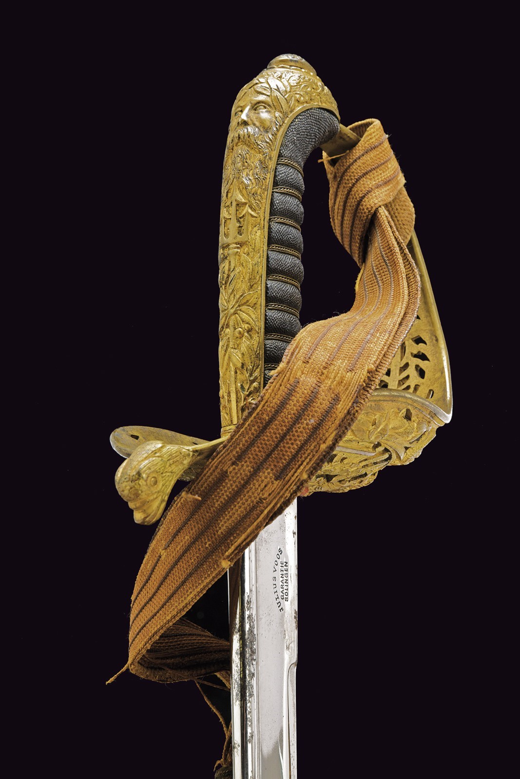 Slightly curved, single-and-a-half-edged blade, with thickened back, engraved on the right side with the Austrian imperial eagle and on the left side with the crowned anchor; on the tang: “JULIUS VOOS GARANTIE SOLINGEN.” Beautiful nickel finishing still present at about 80-90% with some stains due to pitting. Beautiful bronze hilt in typical Austrian style, with a large guard richly decorated in relief and openwork on the back, with the imperial eagle surmounted by mermaids holding an anchor, with corals and other nautical and maritime decorations. Short parry quillon with a dolphin head. Long cap with the face of Neptune and a trident in relief. Beautiful gilding preserved at about 70%. Handle with fish-skin covering and with brass wire binding. With its leather scabbard and mounts with relief decorations featuring remains of gilding. A fixed lug and a loop. Together with a sword-knot with obvious signs of use and age; the tassel with Austrian eagle and monogram “FJI.” The sword is in good/very good condition, with small signs of time.