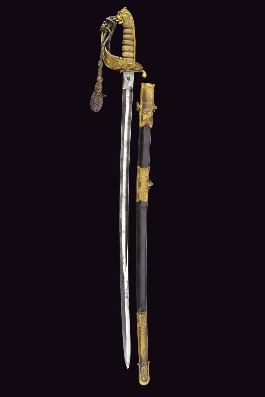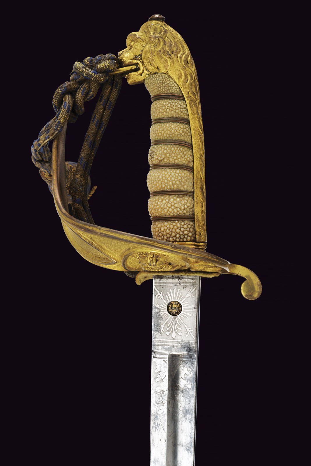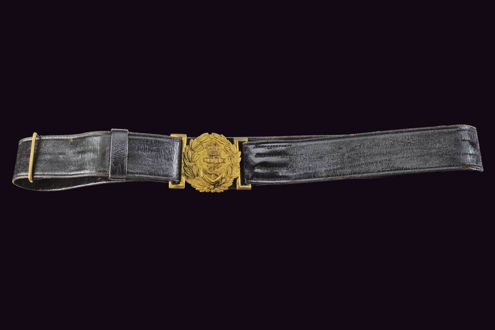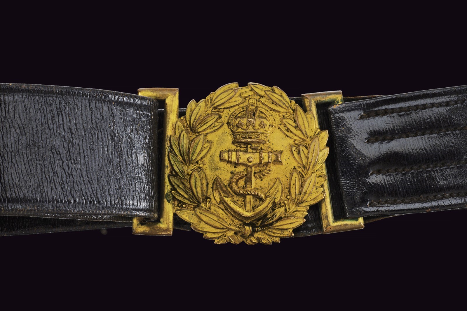 Slightly curved, single-and false-edged blade, a broad central fuller, and a medial rib toward the weak; the forte finely burin-engraved with a royal coat of arms, a crowned anchor, floral motifs, and the maker’s name “SELBY HIGH ST. PORTSMOUTH.” The tang bears a brass-inlaid proof mark and engraved with floral and geometric motifs. Gilt-bronze hilt with rain guard bearing a crowned anchor, folding rear valve, and lion’s-head pommel; wooden grip covered in fish skin with wire binding. Officer’s sword knot. Leather scabbard with gilt-bronze mounts (gilding with missin parts), the locket marked with the same maker. Together with a leather belt fitted with a buckle bearing a crowned anchor amid laurel fronds.