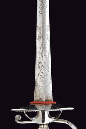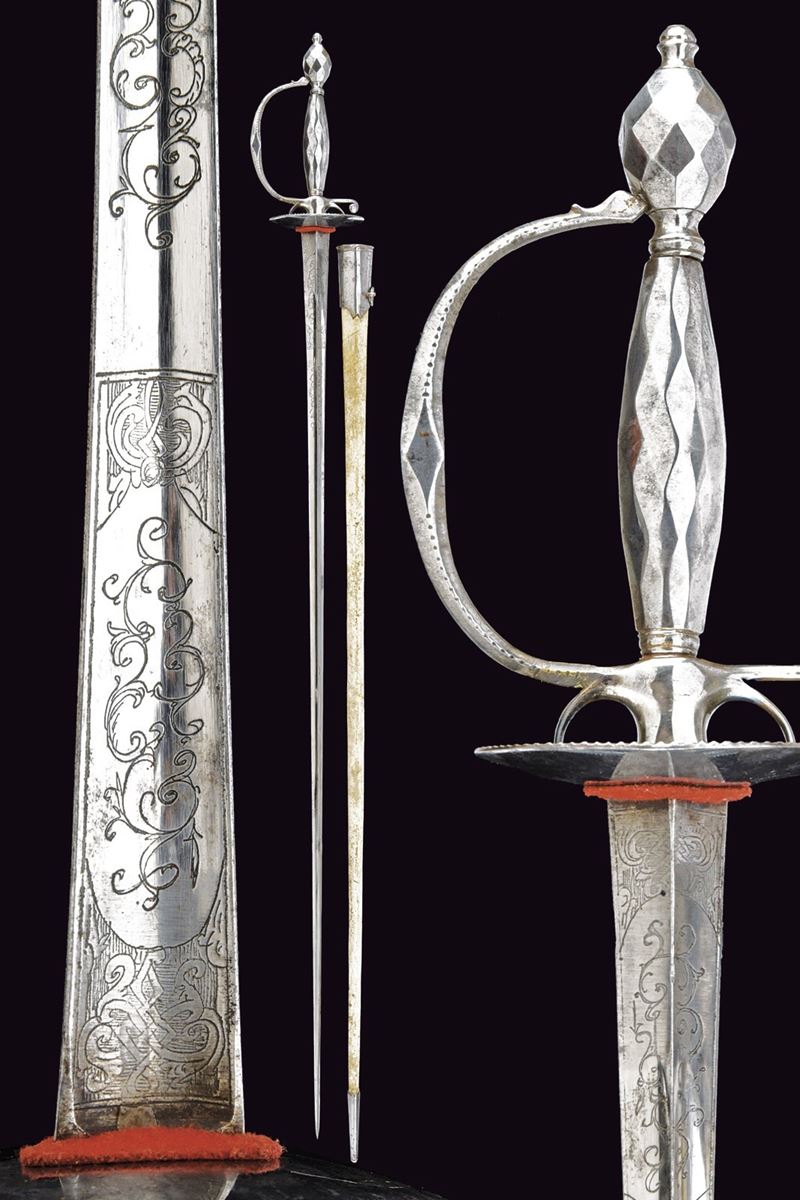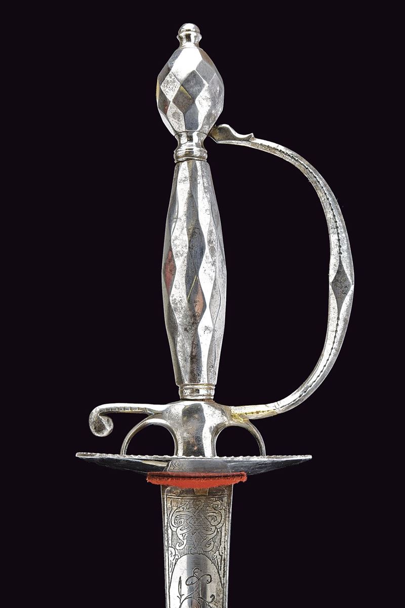Straight blade with triangular section and hollowed sides, engraved with racemes on the forte. Iron hilt with elliptical quillon. Handle and guard decorated with notches. Handle and pommel with diamond decoration. Small old repair to the loop guard. Old scabbard with white parchment lining, featuring iron mounts with a lug. English style, much appreciated at the end of the 18th century.