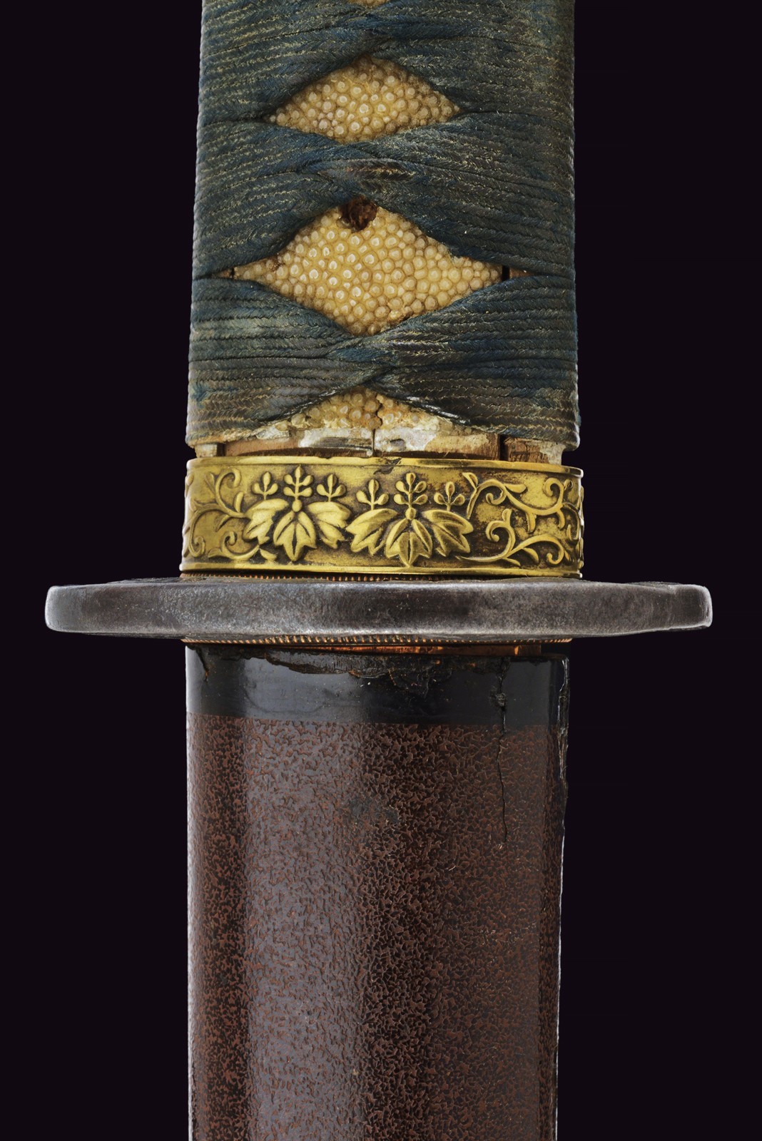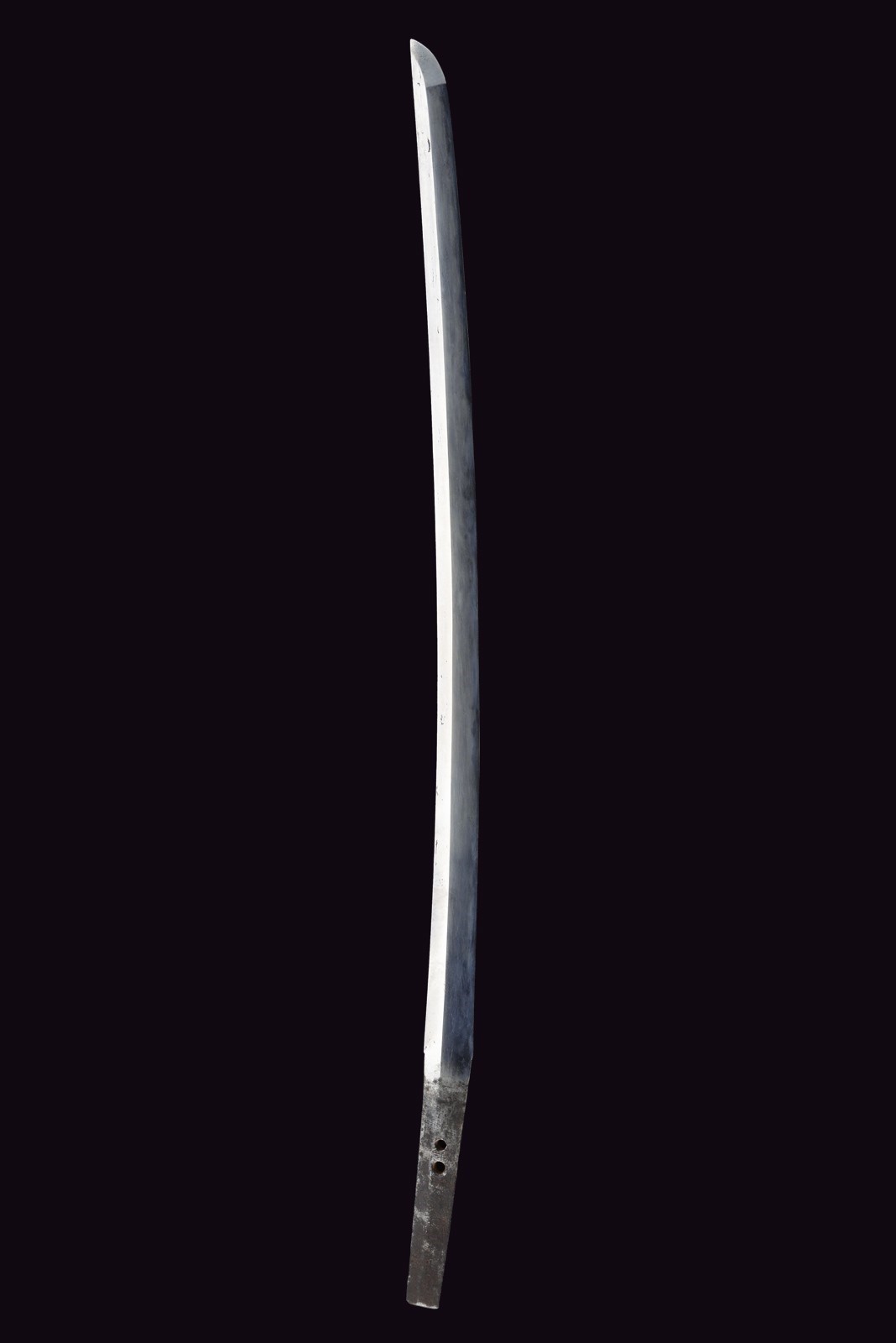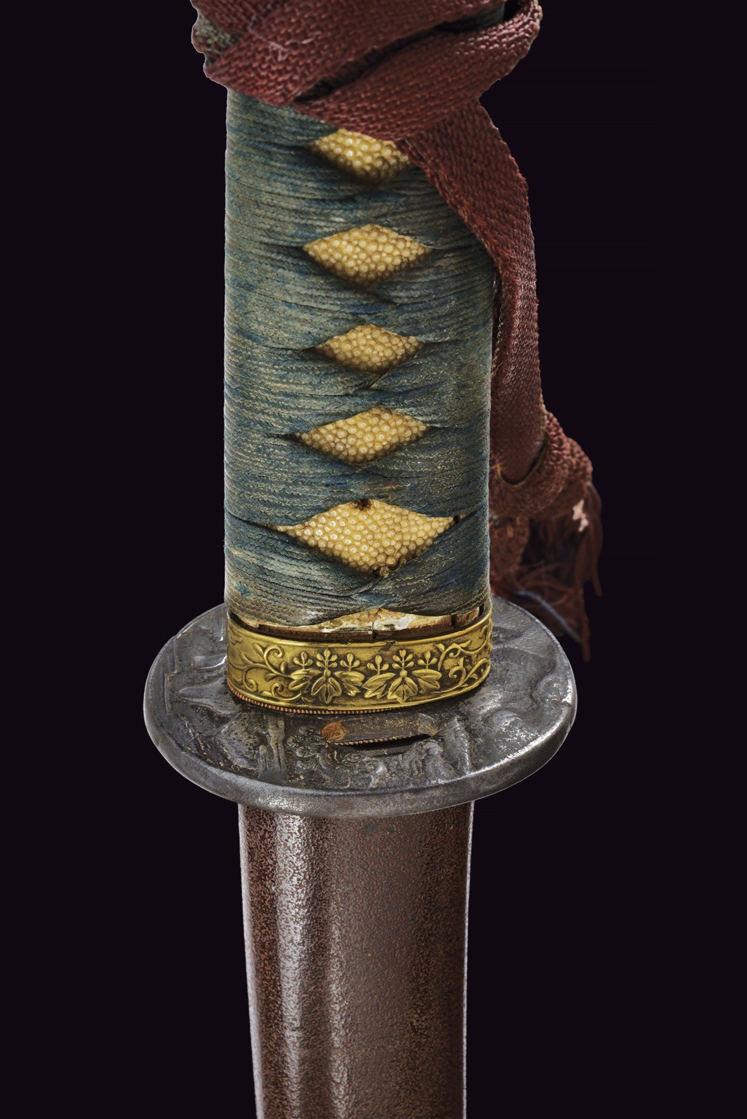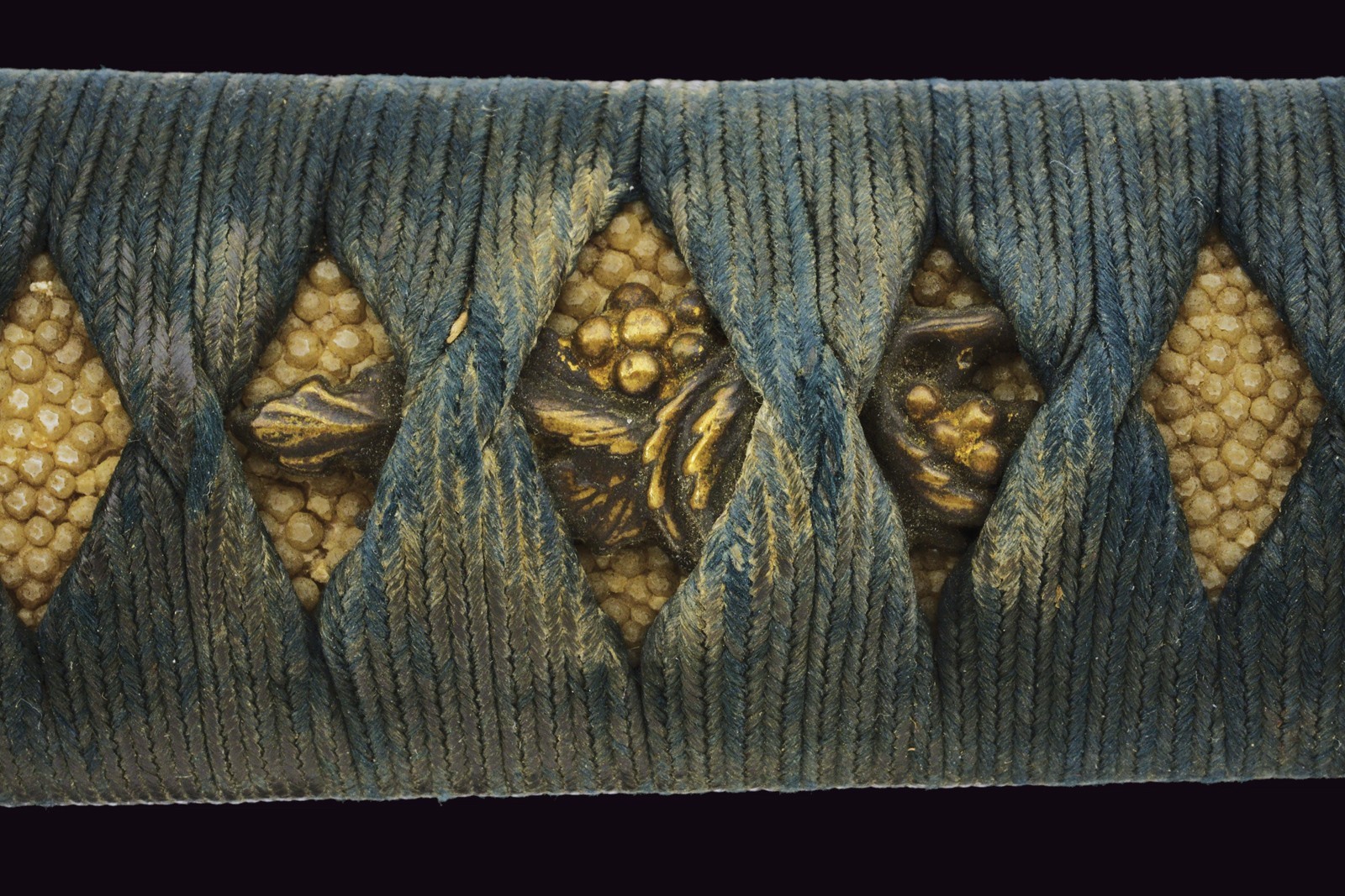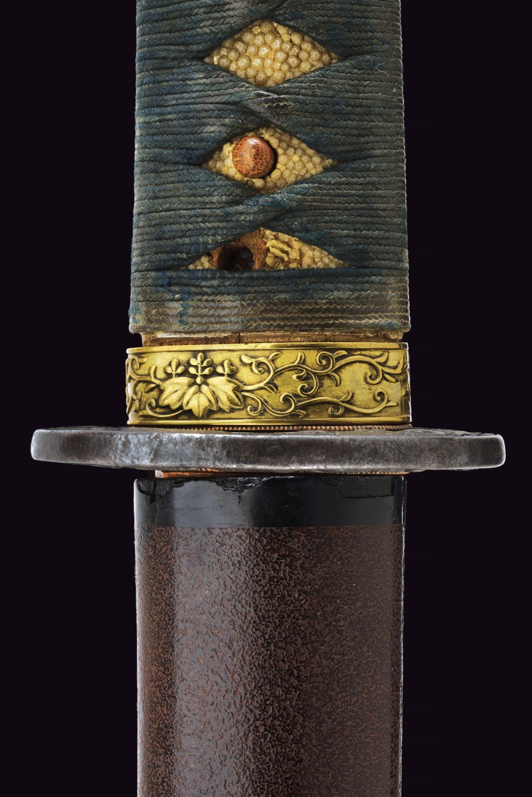 Shinogi-zukuri blade, Iori-mune (Nagasa 57.4 cm) with hamon and hada that cannot be identified. Some Kizu and pitting. Nakago with two Mekugi-ana. Traces of Mei. Copper-coloured metal Habaki. Composite Koshirae, partly nineteenth-century and probably with later elements (twentieth century). Maru Gata Tsuba made of iron with sea landscape in relief, possibly slight traces of Mei inside. Fuchi-kashira in copper-coloured irogane with leaves and Mon in relief. Tsuka-ito in green fabric with signs of use and time. Tsuka with Samè made of stingray leather. Bronze-coloured Menuki worked with flowers. Saya made of lacquer with a rusty effect.