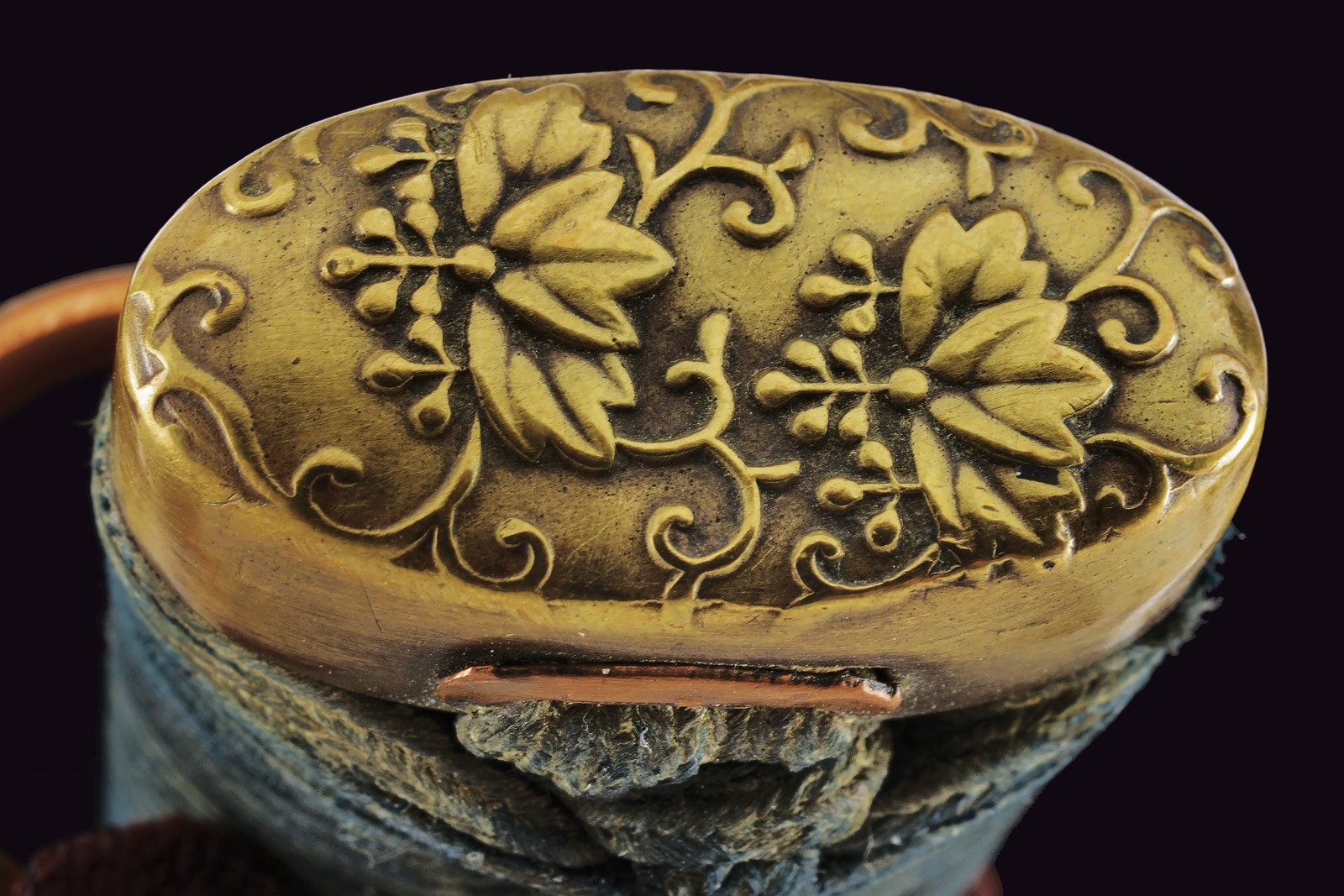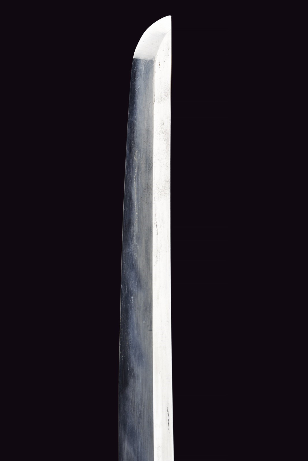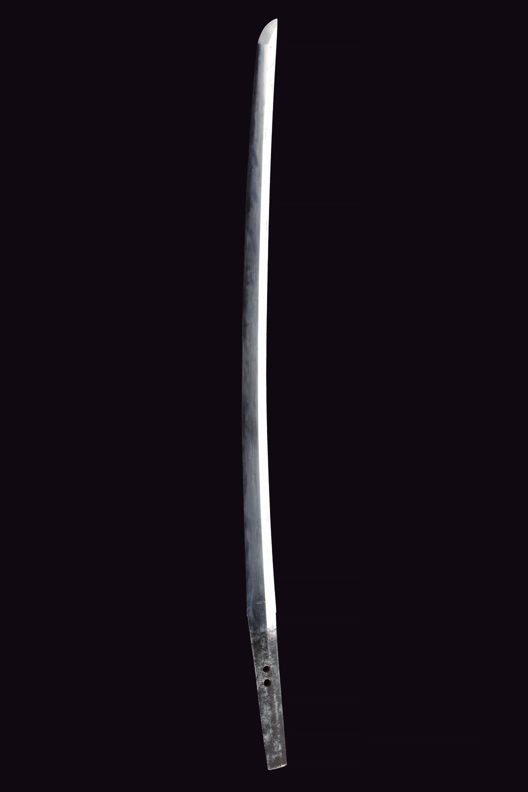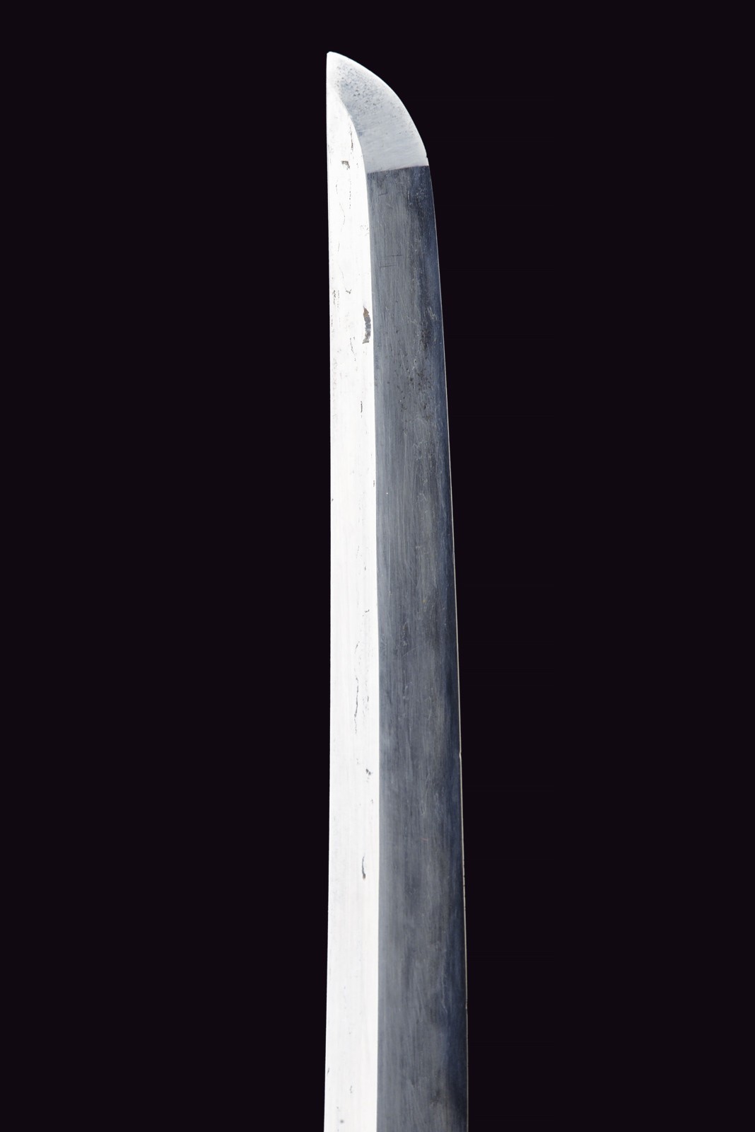 Shinogi-zukuri blade, Iori-mune (Nagasa 57.4 cm) with hamon and hada that cannot be identified. Some Kizu and pitting. Nakago with two Mekugi-ana. Traces of Mei. Copper-coloured metal Habaki. Composite Koshirae, partly nineteenth-century and probably with later elements (twentieth century). Maru Gata Tsuba made of iron with sea landscape in relief, possibly slight traces of Mei inside. Fuchi-kashira in copper-coloured irogane with leaves and Mon in relief. Tsuka-ito in green fabric with signs of use and time. Tsuka with Samè made of stingray leather. Bronze-coloured Menuki worked with flowers. Saya made of lacquer with a rusty effect.