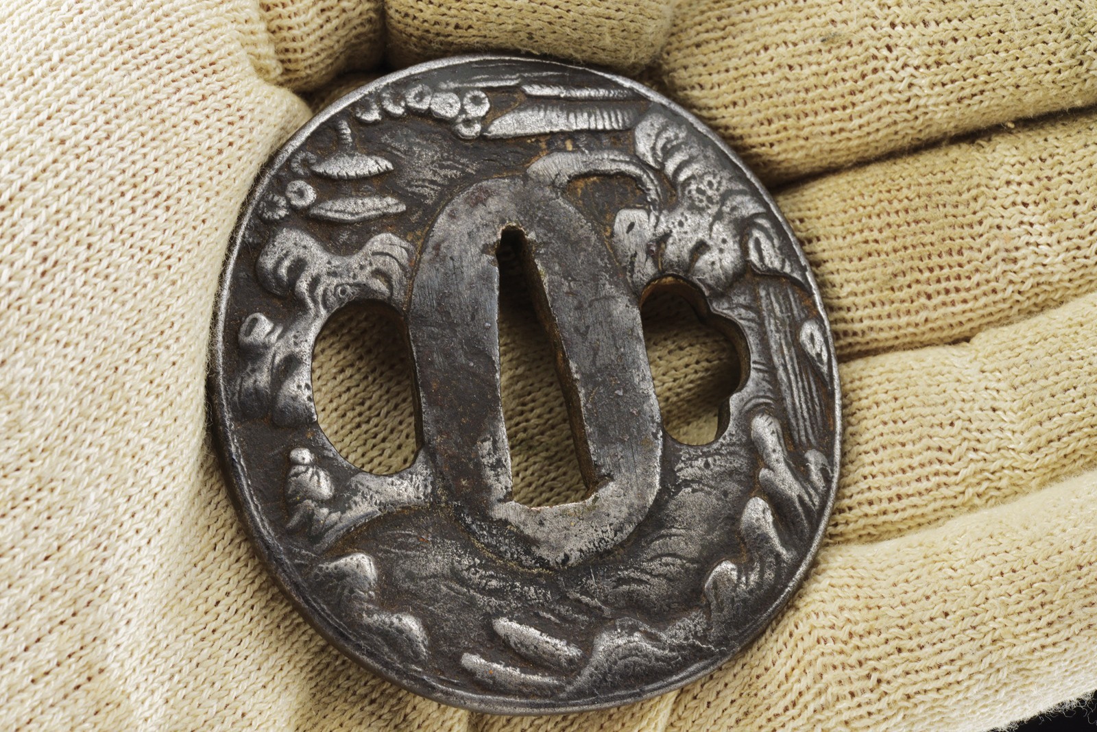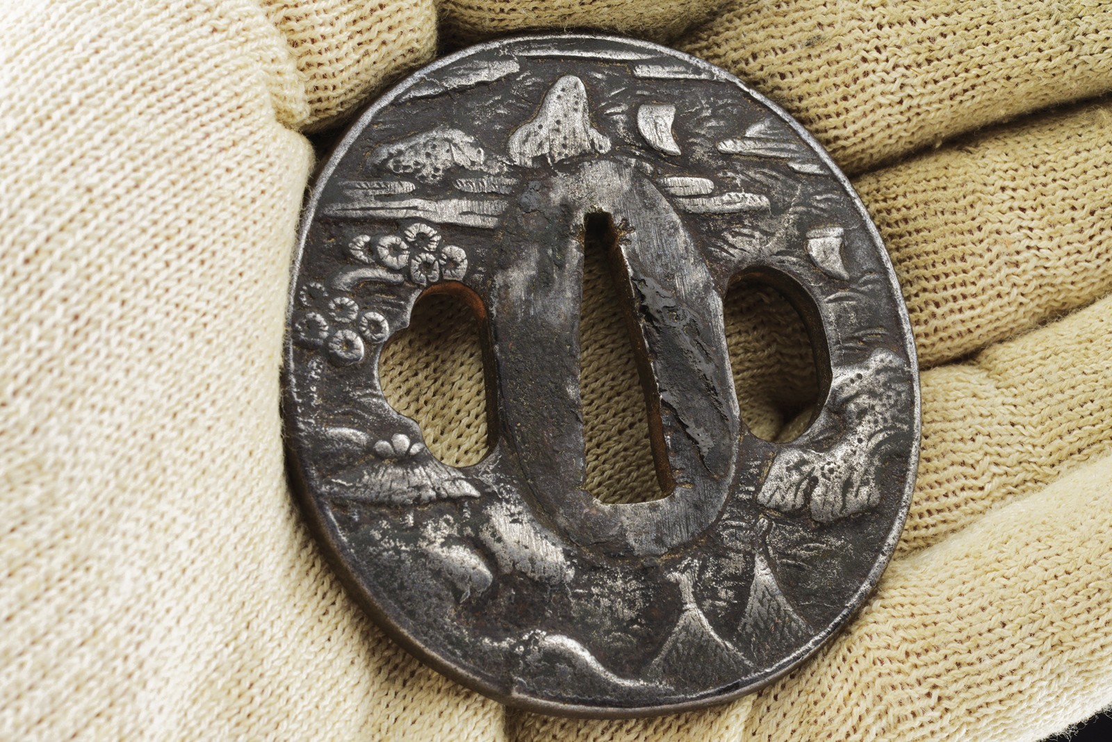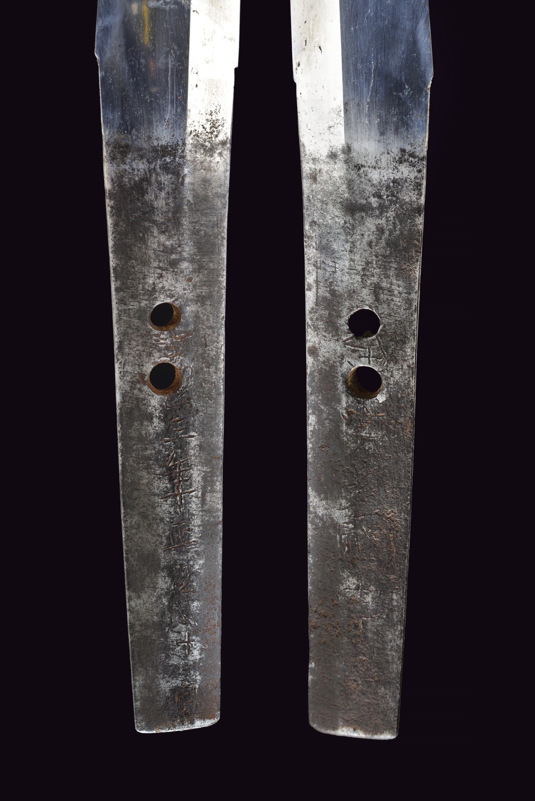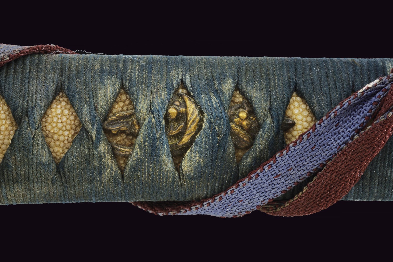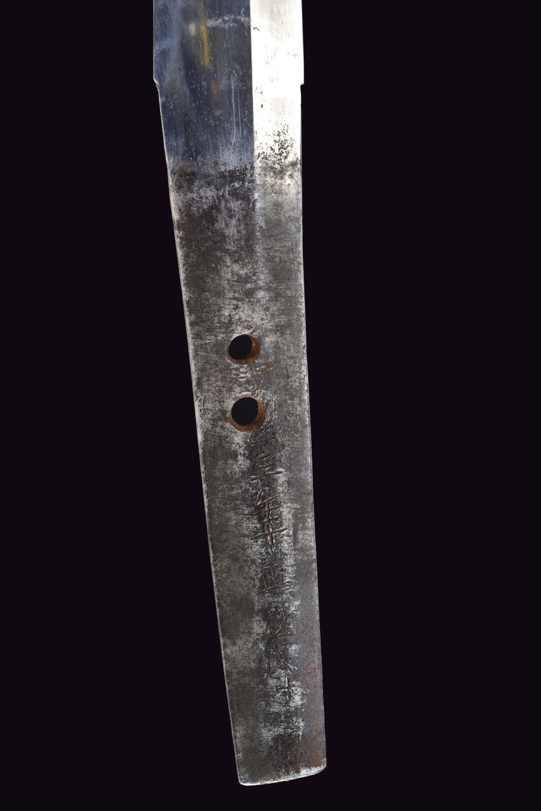 Shinogi-zukuri blade, Iori-mune (Nagasa 57.4 cm) with hamon and hada that cannot be identified. Some Kizu and pitting. Nakago with two Mekugi-ana. Traces of Mei. Copper-coloured metal Habaki. Composite Koshirae, partly nineteenth-century and probably with later elements (twentieth century). Maru Gata Tsuba made of iron with sea landscape in relief, possibly slight traces of Mei inside. Fuchi-kashira in copper-coloured irogane with leaves and Mon in relief. Tsuka-ito in green fabric with signs of use and time. Tsuka with Samè made of stingray leather. Bronze-coloured Menuki worked with flowers. Saya made of lacquer with a rusty effect.
