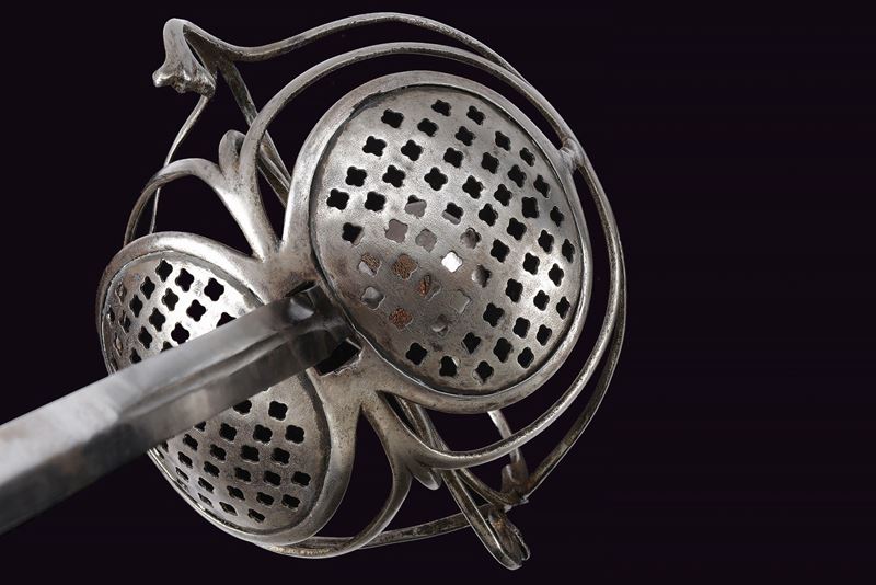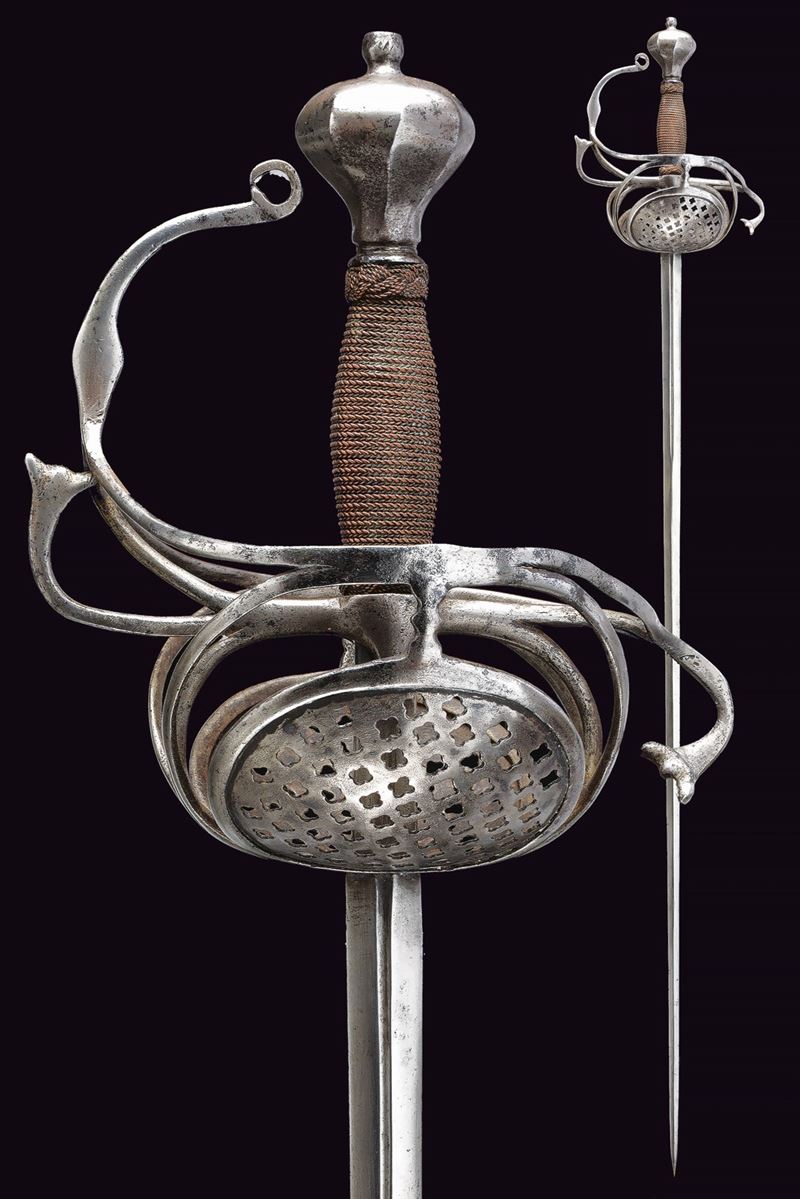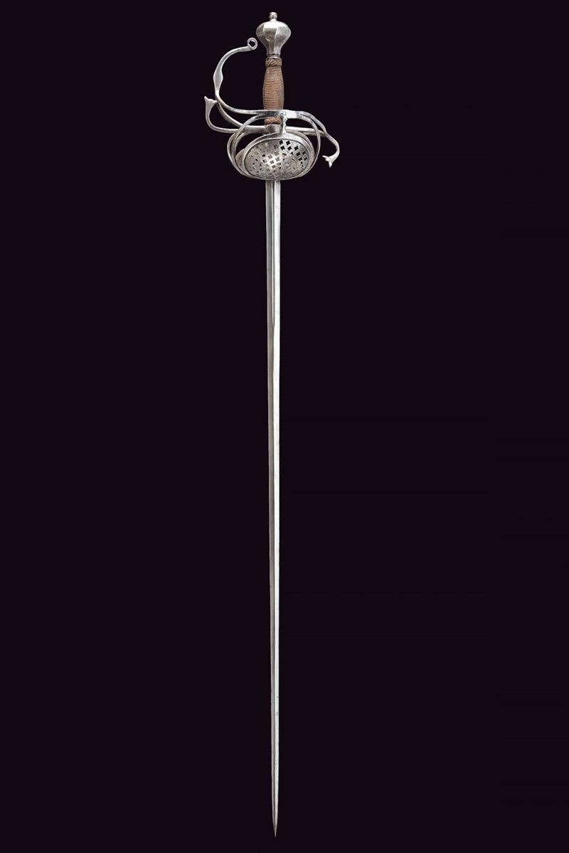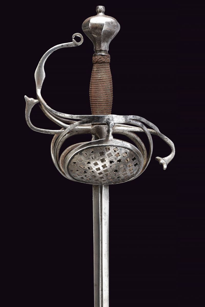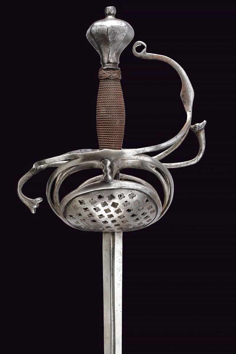 Long, straight blade of diamond-shaped cross-section, grooved in the centre at the first part, tang with a wider groove; iron hilt with two large oval valves pierced with stars, S-shaped quillon enlarged at the ends, loop guard with curl and diamond-shaped centre, beautiful faceted pommel; wooden grip covered with copper wire binding and Moor's heads, probably of a later period.