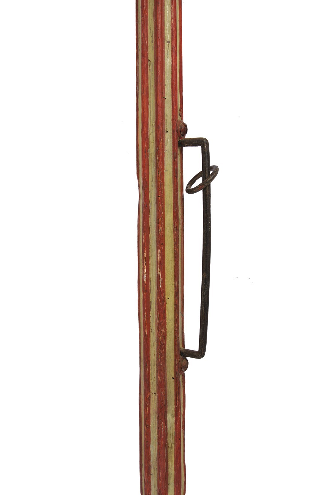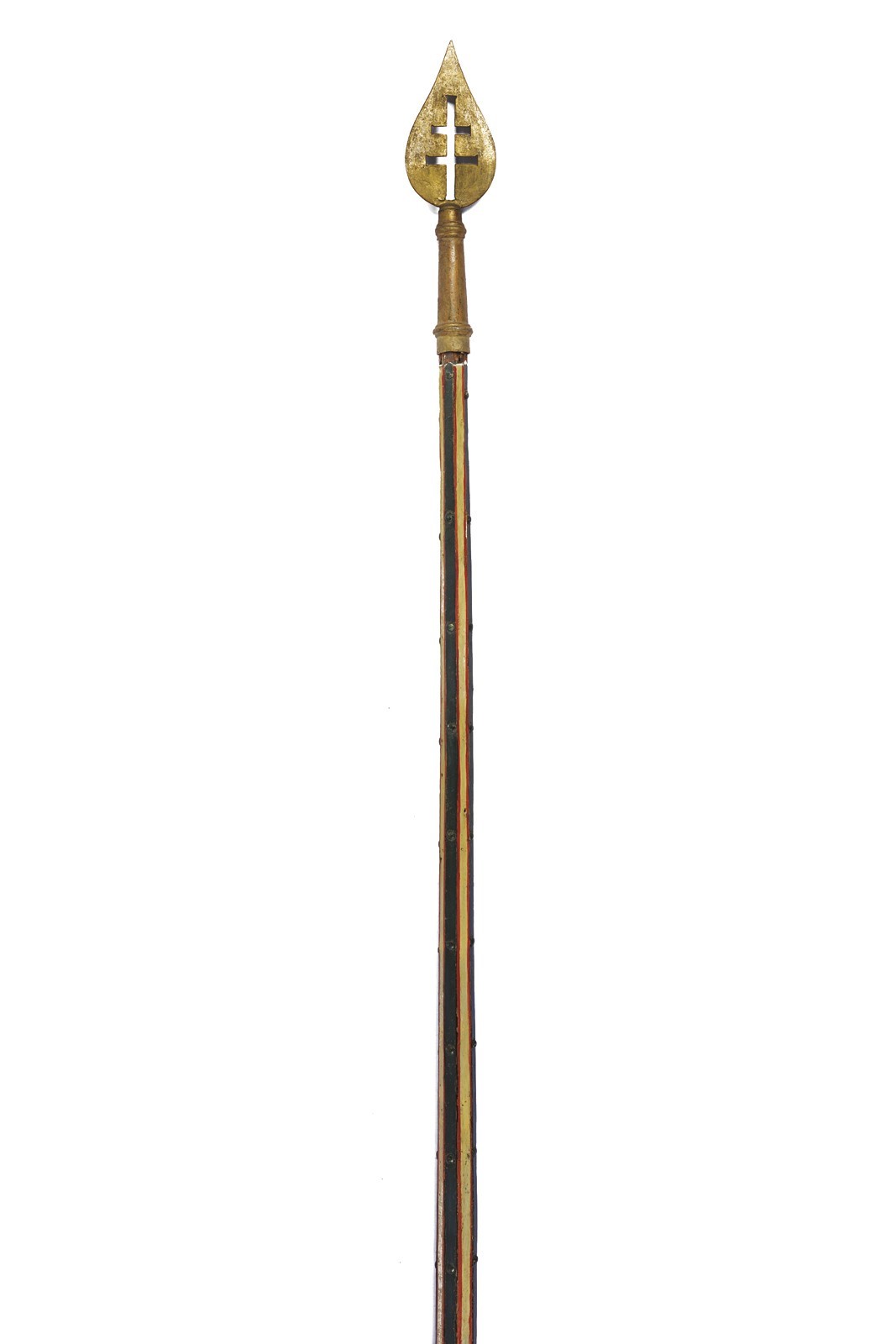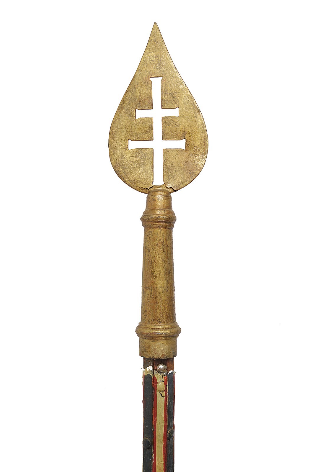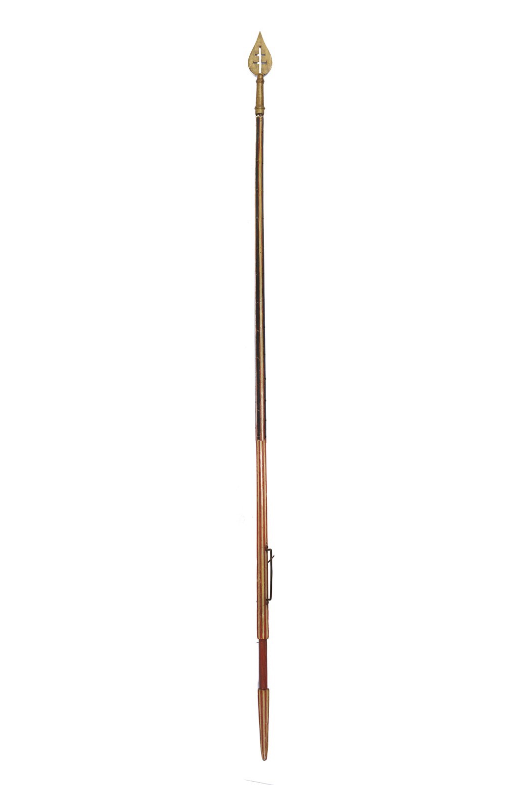Flat, blunt, golden, iron tip, perforated with patriarchal cross. Short, cylindrical ferrule. Long straps and counter-straps with rivets. The wooden shaft is similar to those used in jousting lances, made of wood with long, longitudinal grooves painted white, the rest of the surface is red. Cylindrical and tapered grip. Provided with an iron band with a suspension ring.