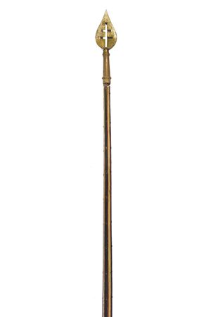 Flat, blunt, golden, iron tip, perforated with patriarchal cross. Short, cylindrical ferrule. Long straps and counter-straps with rivets. The wooden shaft is similar to those used in jousting lances, made of wood with long, longitudinal grooves painted white, the rest of the surface is red. Cylindrical and tapered grip. Provided with an iron band with a suspension ring.
