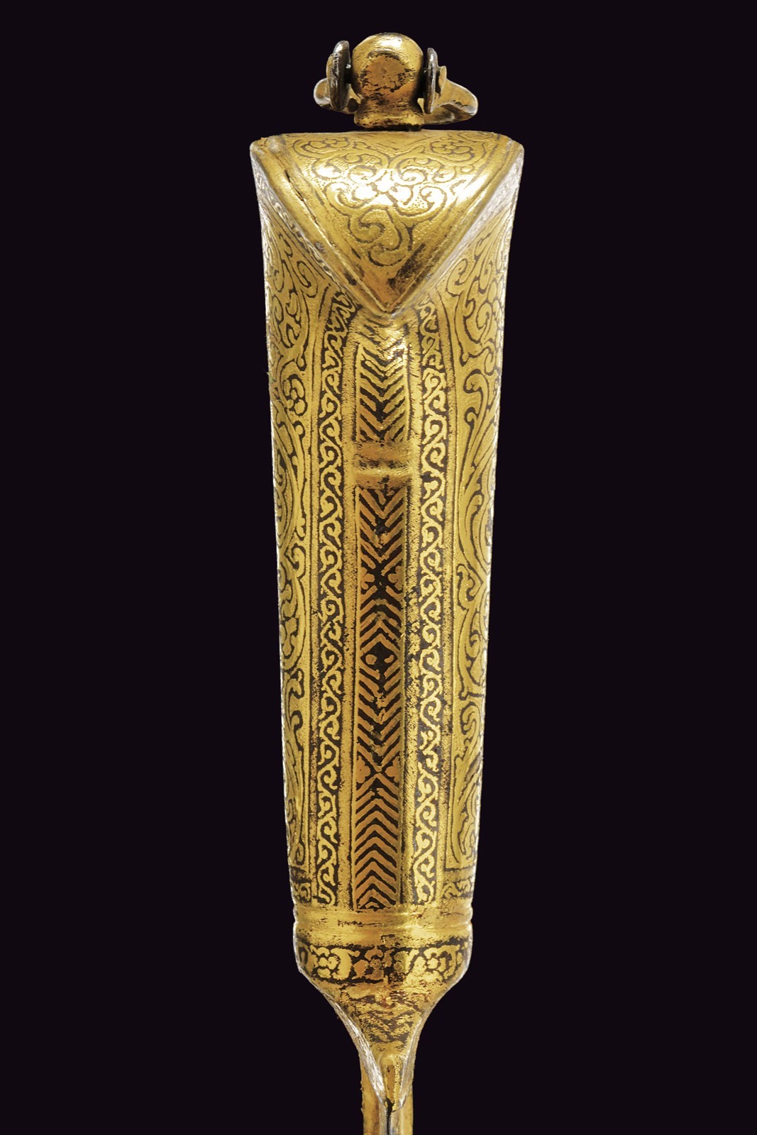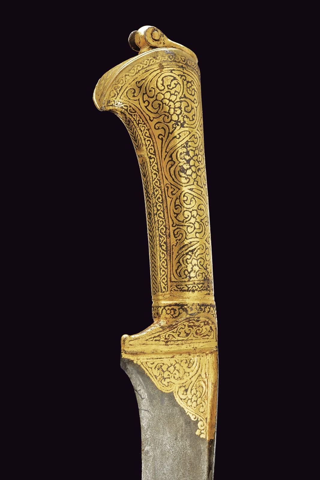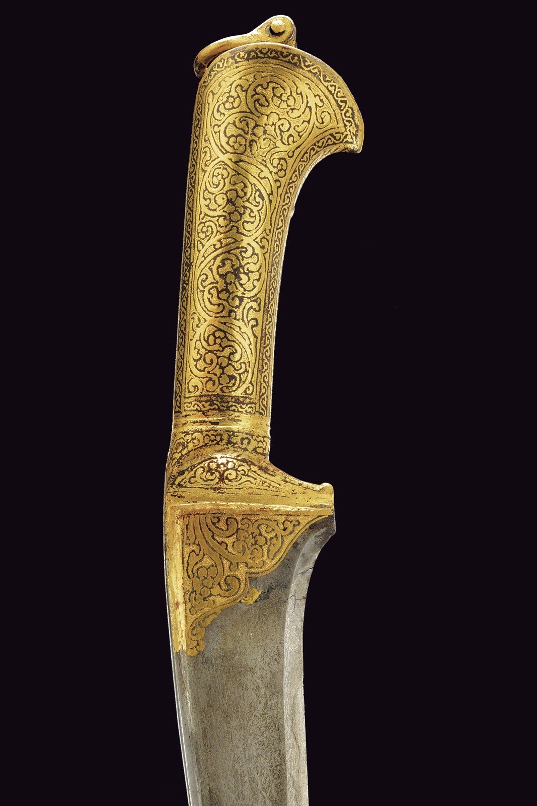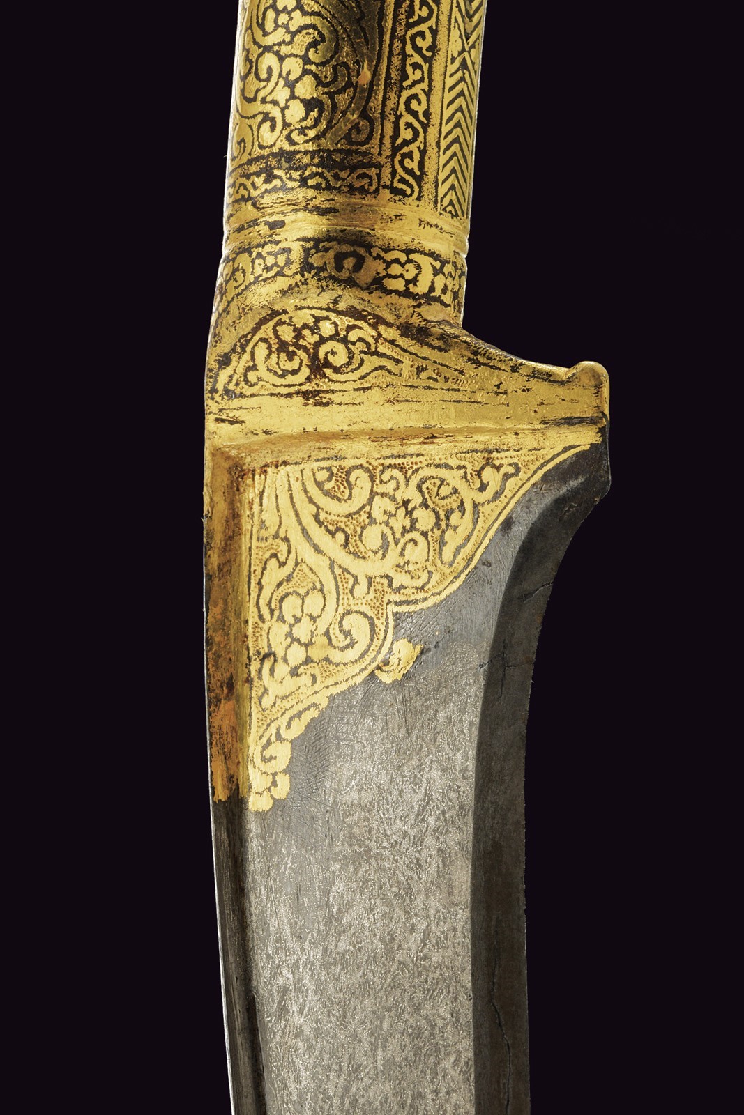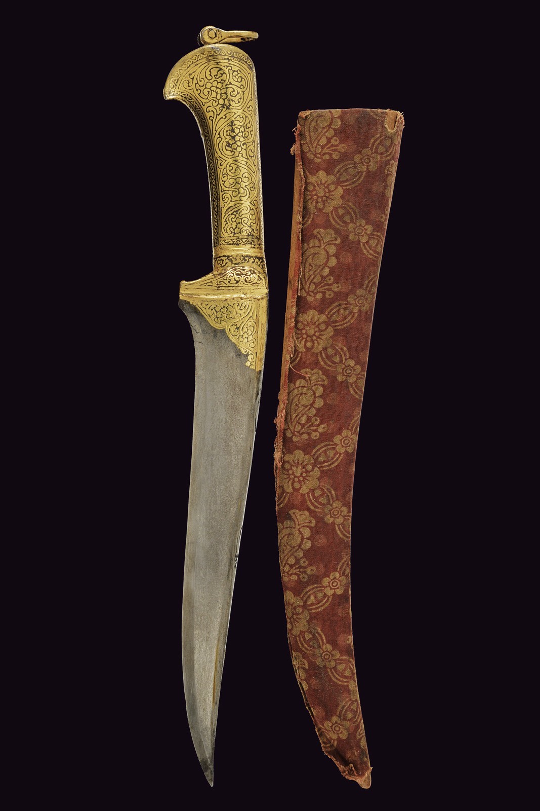 Large, slightly curved, single-edged blade of fine damask, T-shaped on the back, decorated with gold floral motifs at the base. Fully gilded iron grip decorated en suite (small missing parts), the pommel with a suspension ring. Wooden scabbard covered with burgundy fabric with a floral pattern.