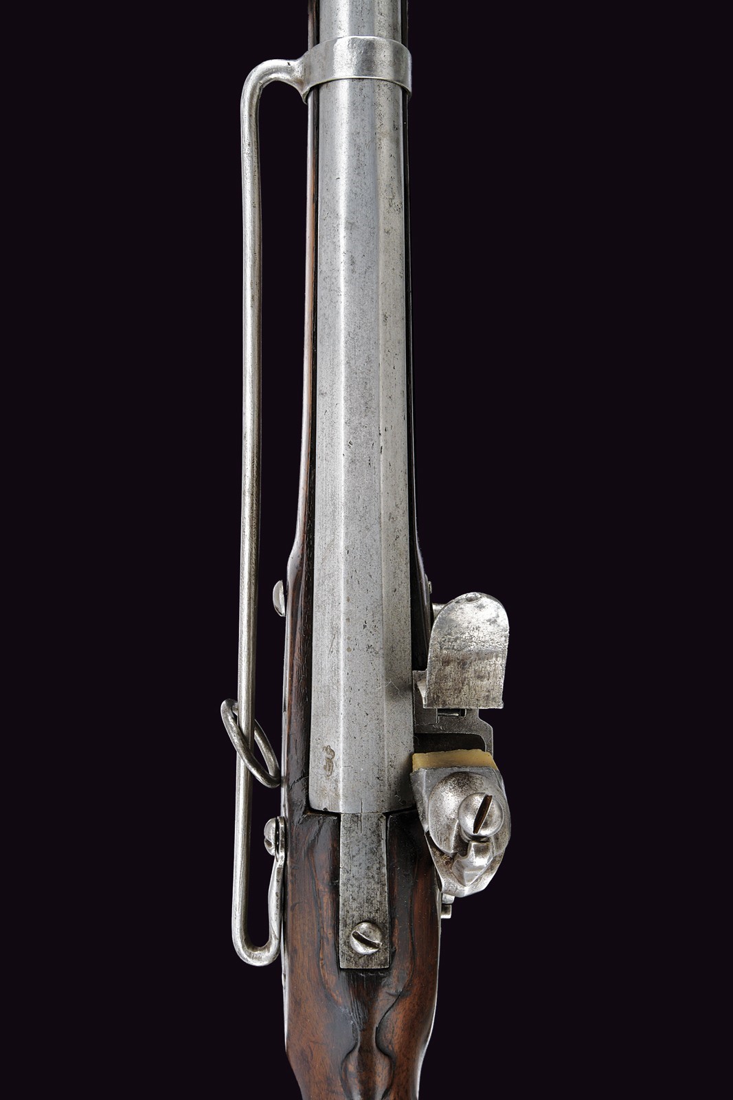 Two-stage, smoothbore, 18.3 mm cal. barrel, octagonal then round at the front, with traces of a mark at the base; foresight. Smooth tang. Entirely iron flintlock. Wooden full stock, slightly sculpted with mounts around the tang, shaft with sling swivel and iron ramrod.