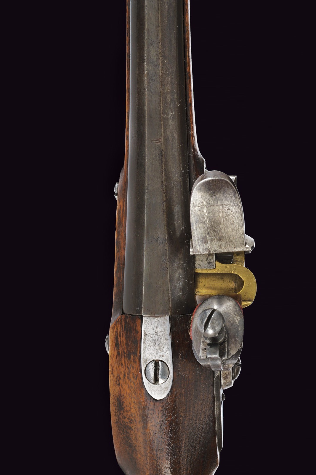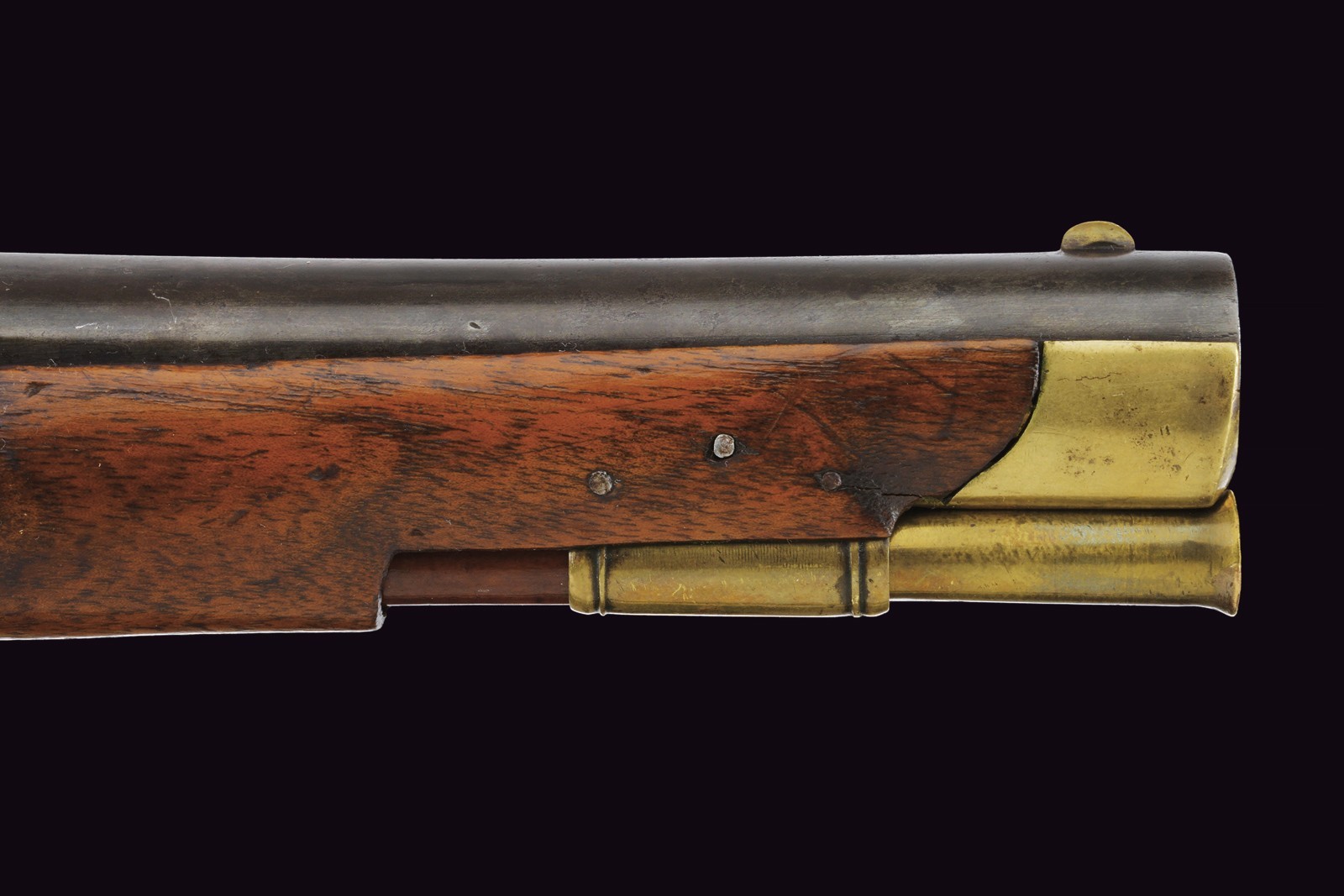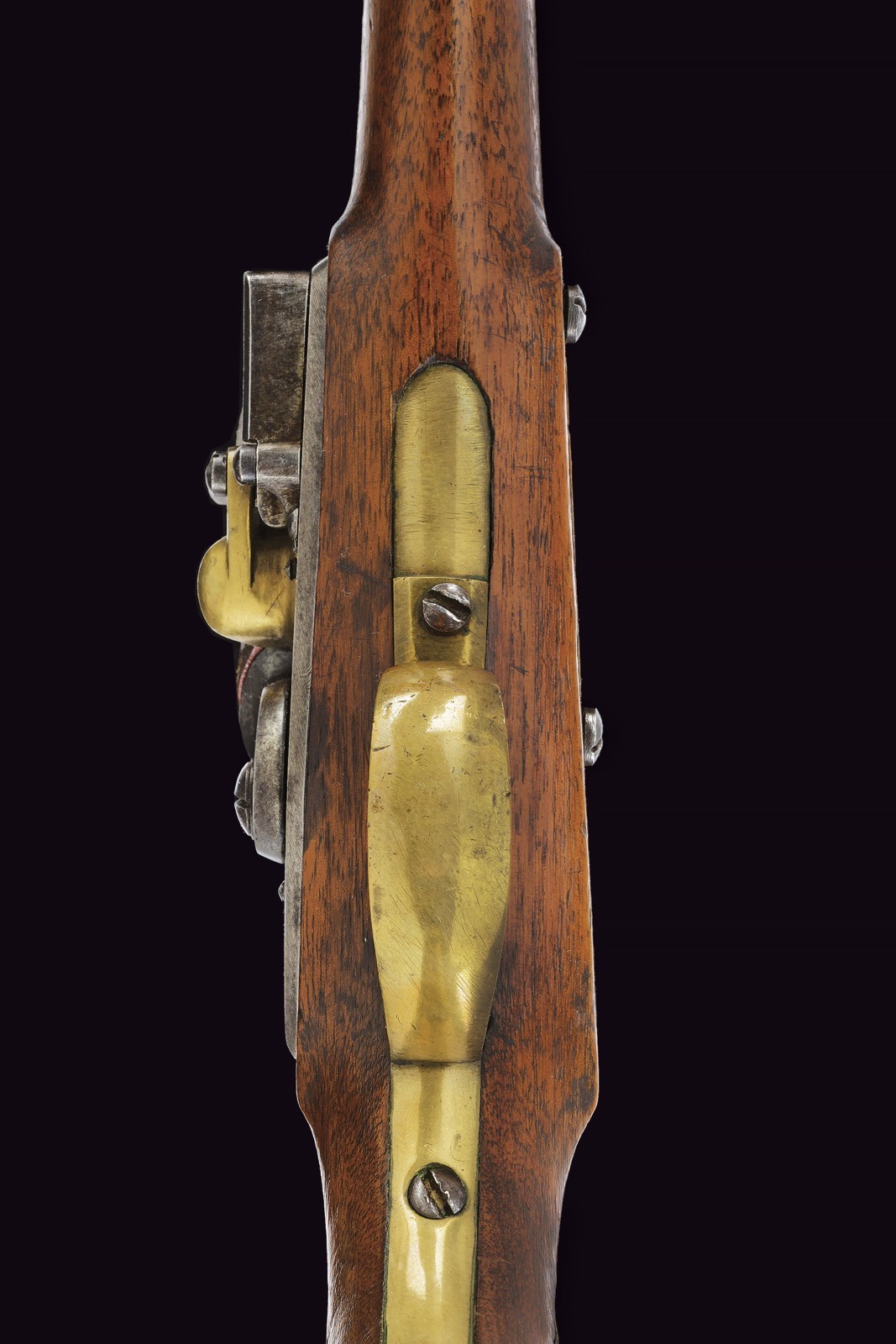Smoothbore, round, 15 mm cal. barrel, square at the base and with full-length barrel rib, brass, foresight, browned, with smooth tang. Flintlock with flat lockplate and brass pan, cock without safety lock, working mechanism with double set triggers.Wooden full stock, brass mounts. Brass-tipped wooden ramrod with brass cartridge extractors. Together with a bullet mould.