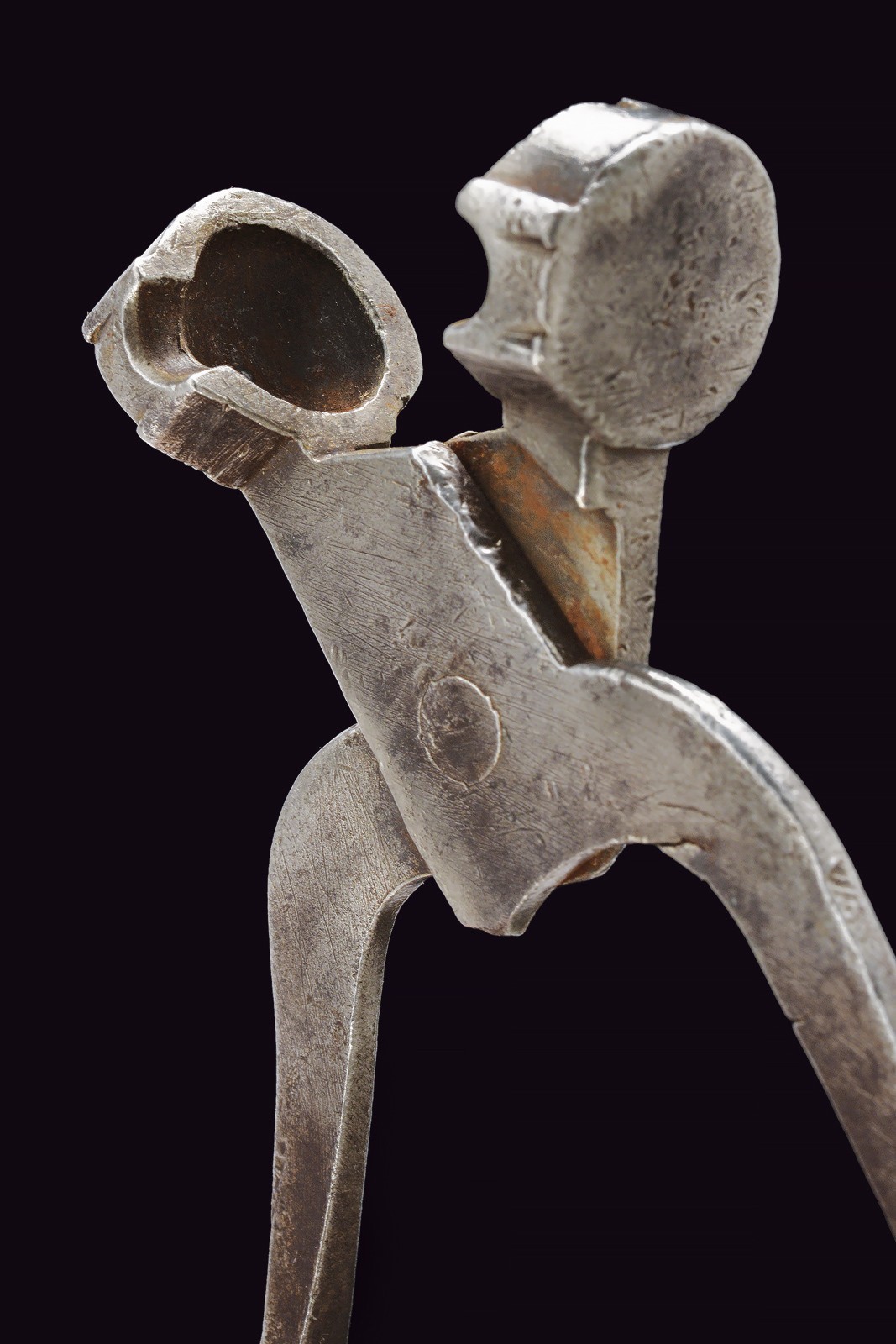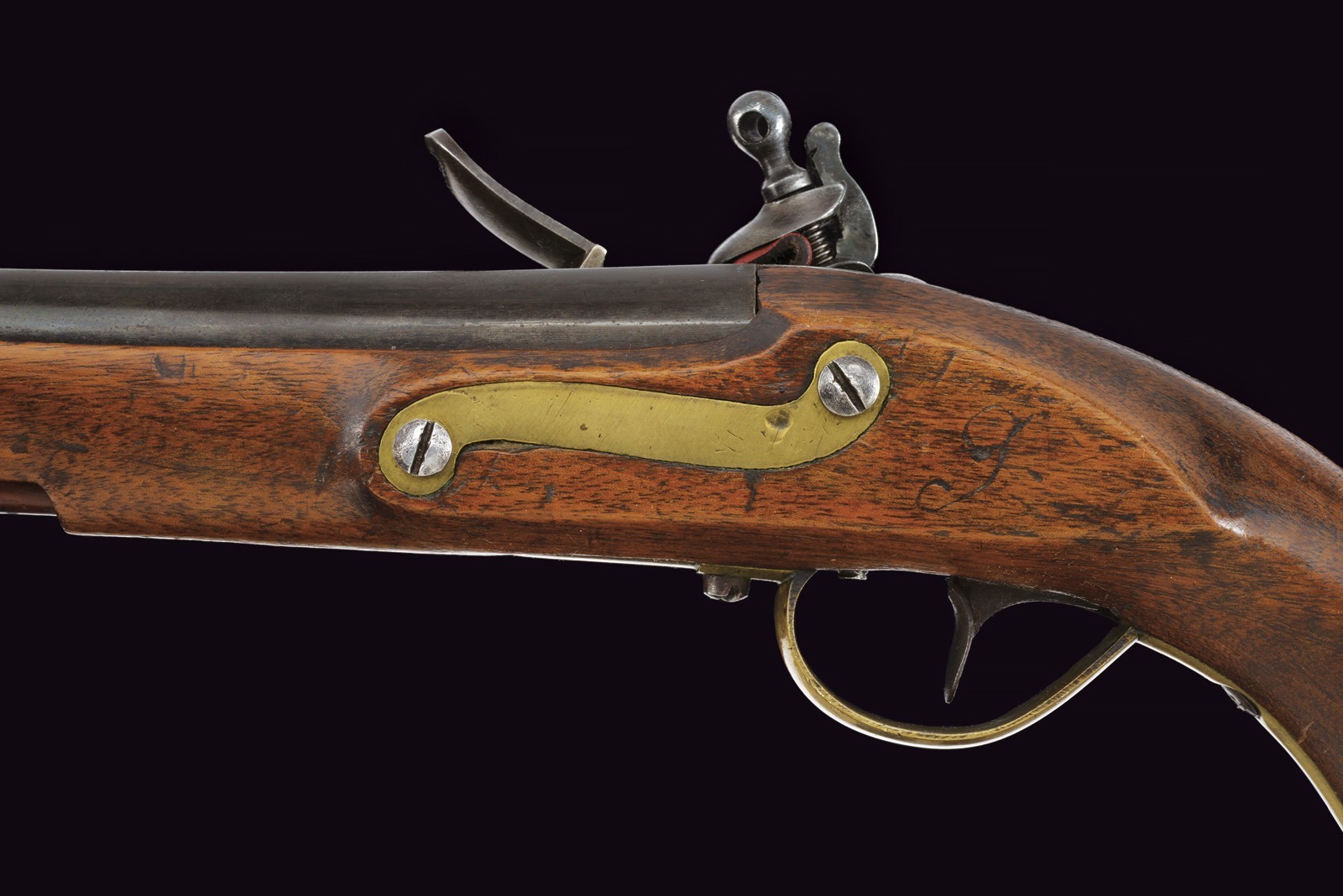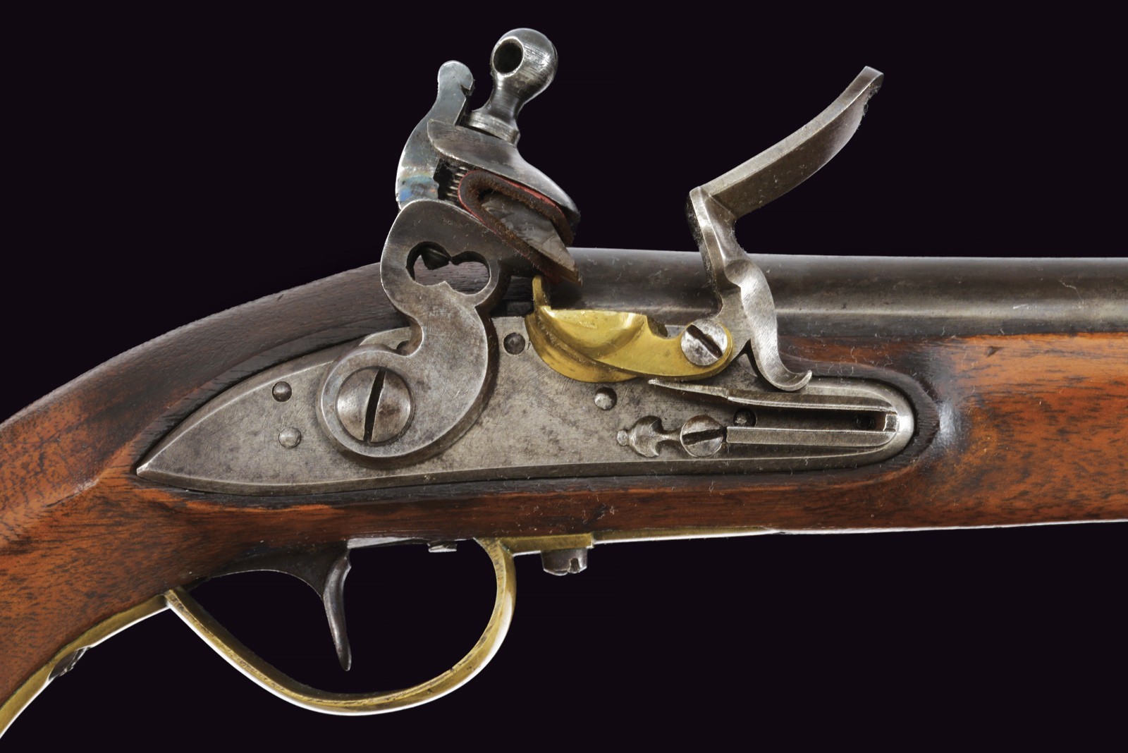 Smoothbore, round, 15 mm cal. barrel, square at the base and with full-length barrel rib, brass, foresight, browned, with smooth tang. Flintlock with flat lockplate and brass pan, cock without safety lock, working mechanism with double set triggers.Wooden full stock, brass mounts. Brass-tipped wooden ramrod with brass cartridge extractors. Together with a bullet mould.