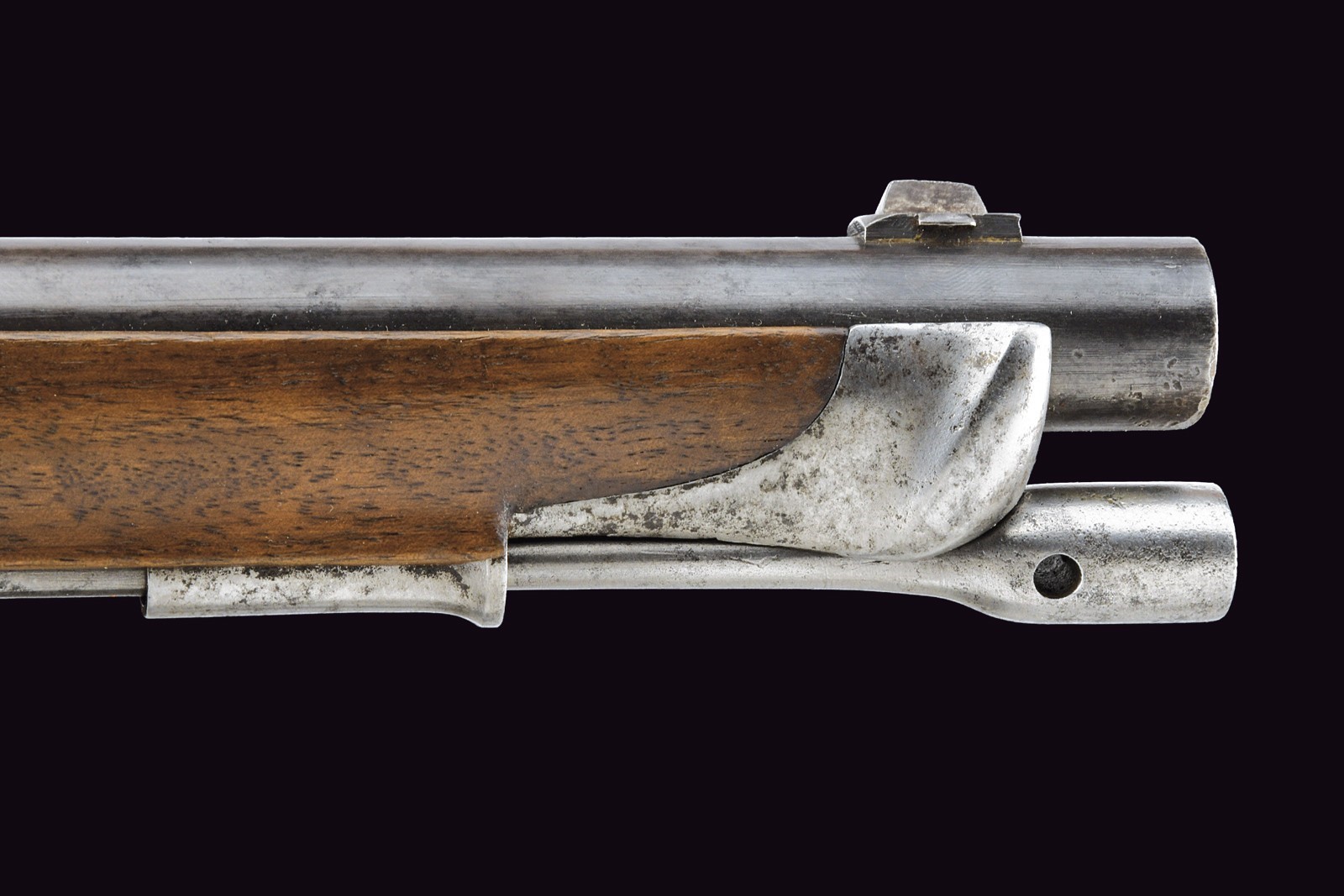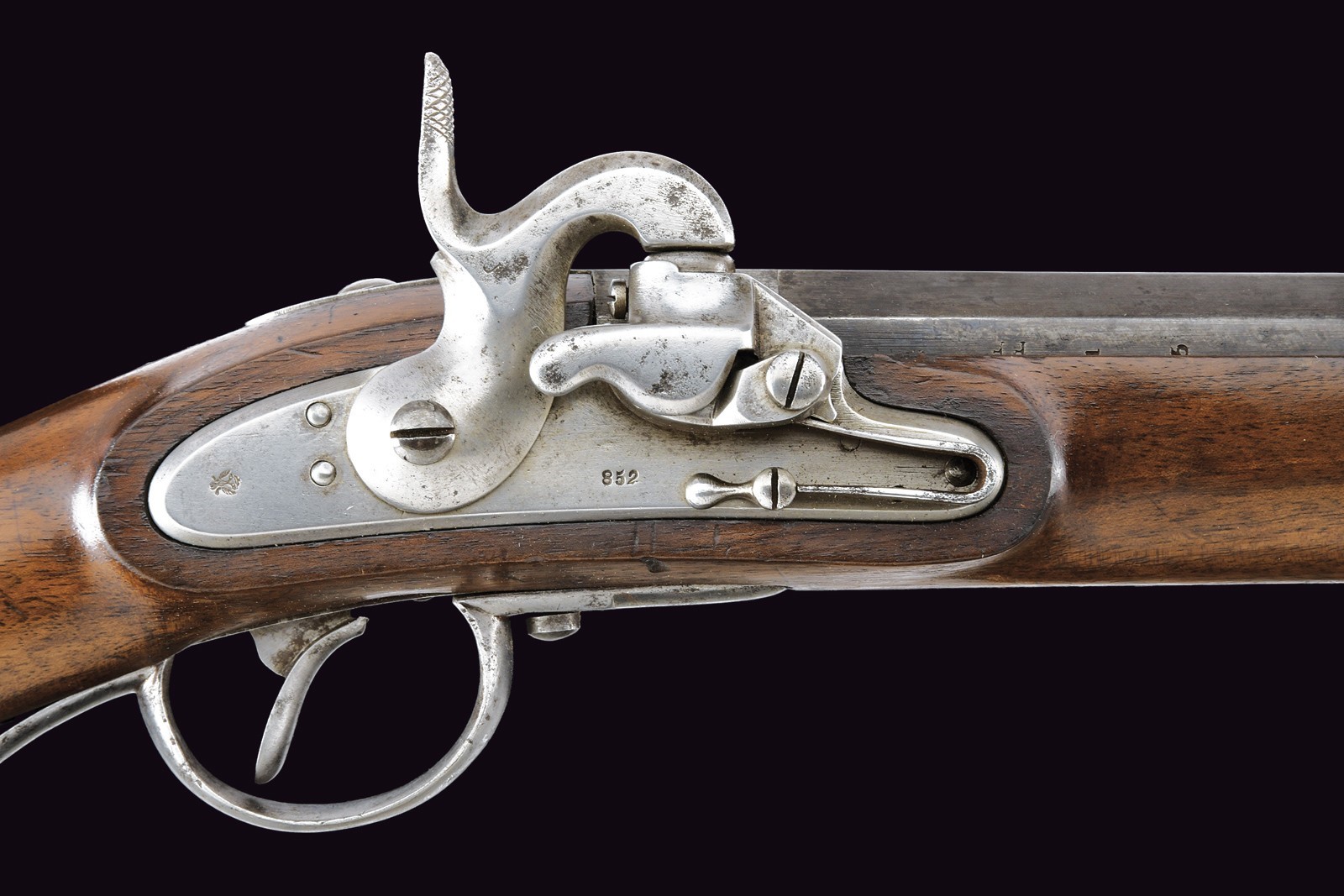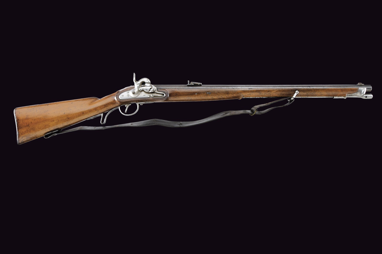 Rifled, 16 mm cal. barrel (bore with some pitting but clearly visible rifling), refreshed browning; octagonal at the first part, signed “FERD. FRUHWIRTH”, with foldaway rear sight, then round with rib and foresight (not prepared for bayonet). Smooth tang. Lock dated “852” and featuring the Imperial eagle. Full stock with iron mounts and ramrod, featuring a rare mouthpiece. Leather shoulder strap. A very interesting item, possibly of naval use.