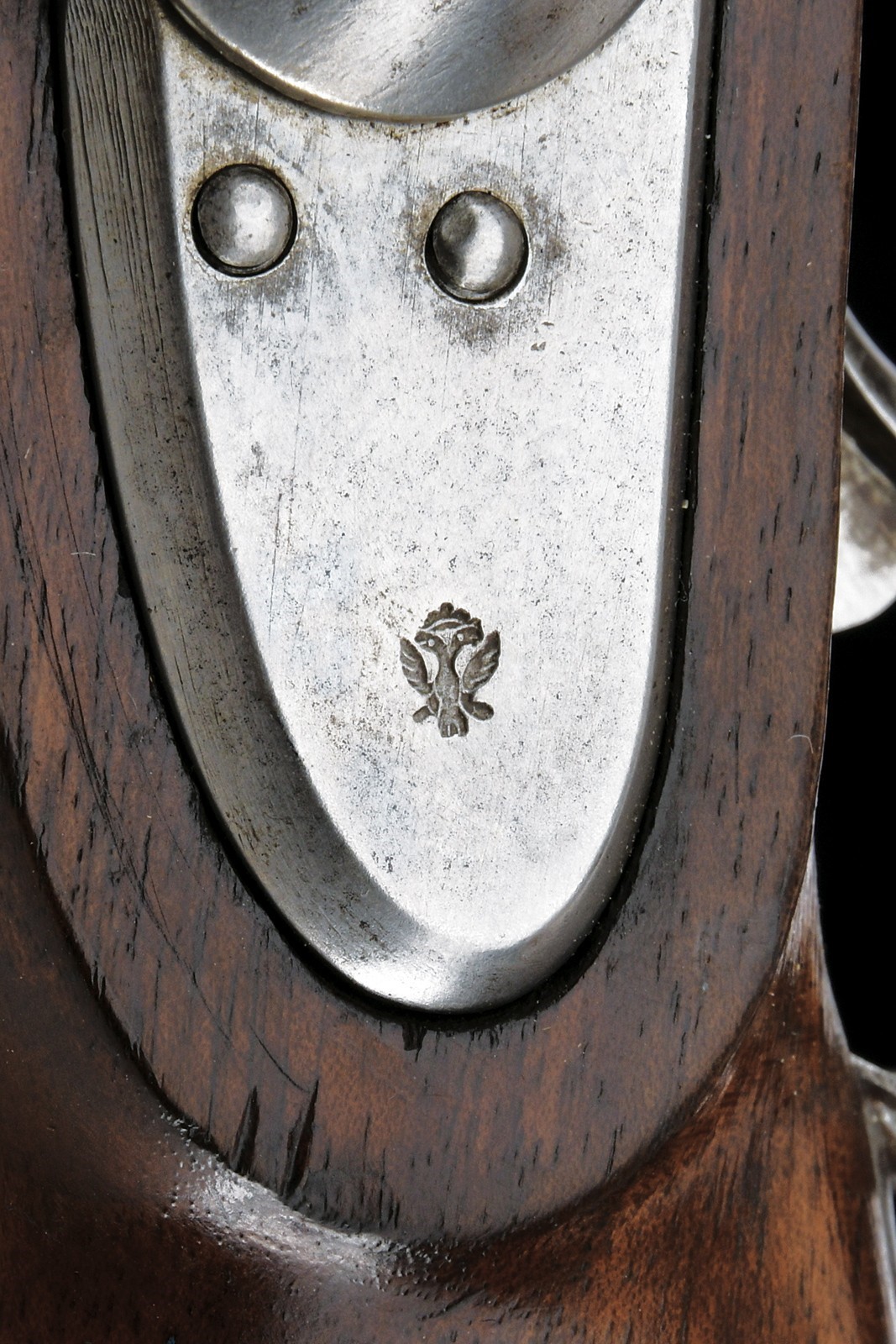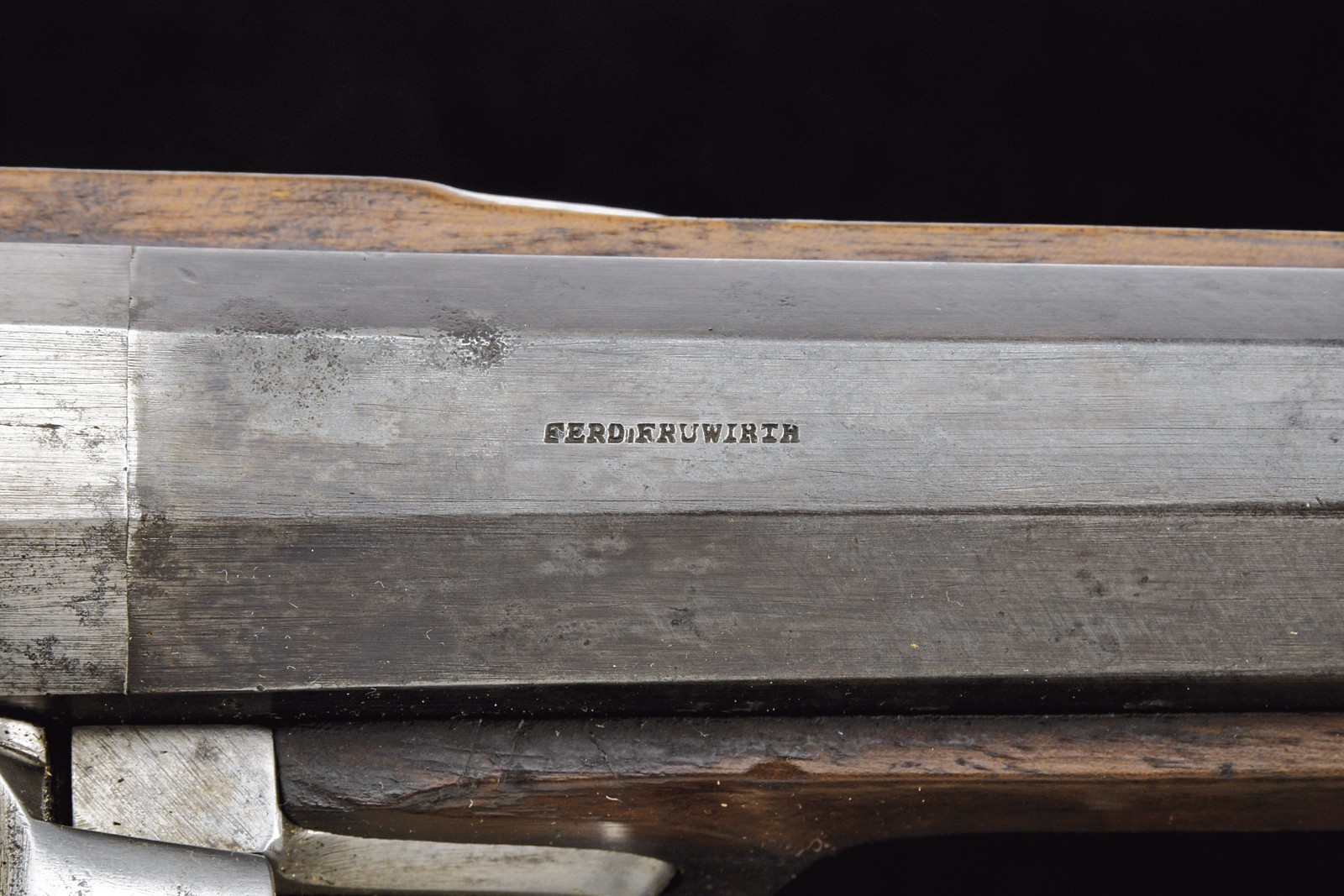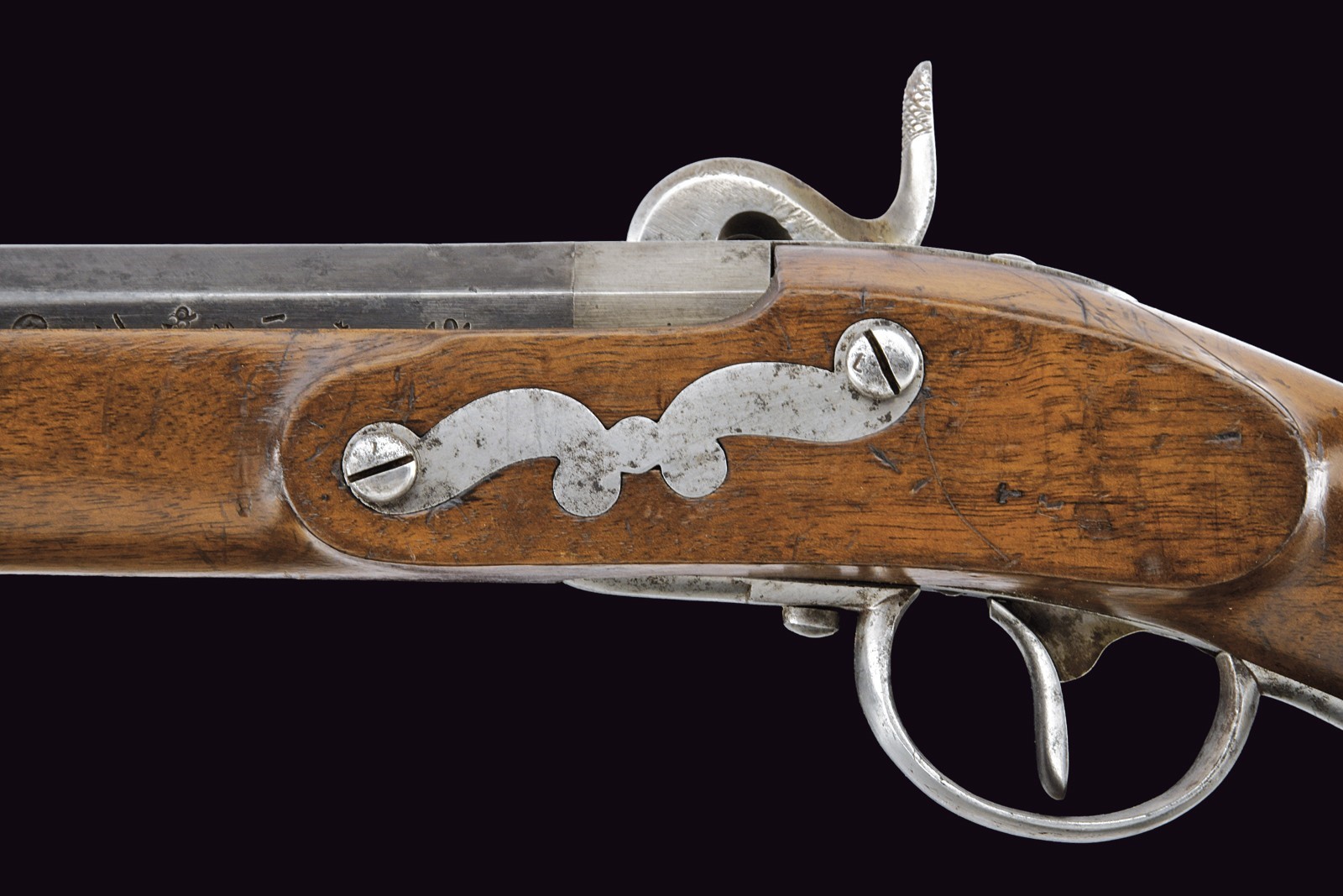Rifled, 16 mm cal. barrel (bore with some pitting but clearly visible rifling), refreshed browning; octagonal at the first part, signed “FERD. FRUHWIRTH”, with foldaway rear sight, then round with rib and foresight (not prepared for bayonet). Smooth tang. Lock dated “852” and featuring the Imperial eagle. Full stock with iron mounts and ramrod, featuring a rare mouthpiece. Leather shoulder strap. A very interesting item, possibly of naval use.