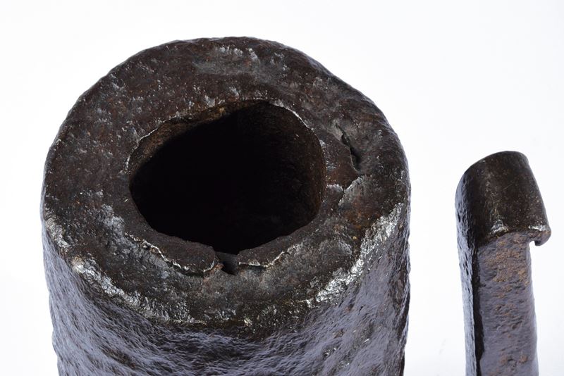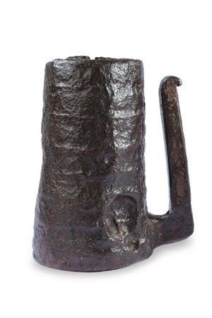 Strong, heavy, twisted structure having the shape of a truncated cone; handle of rectangular section with curled ends. Vent at the bottom.