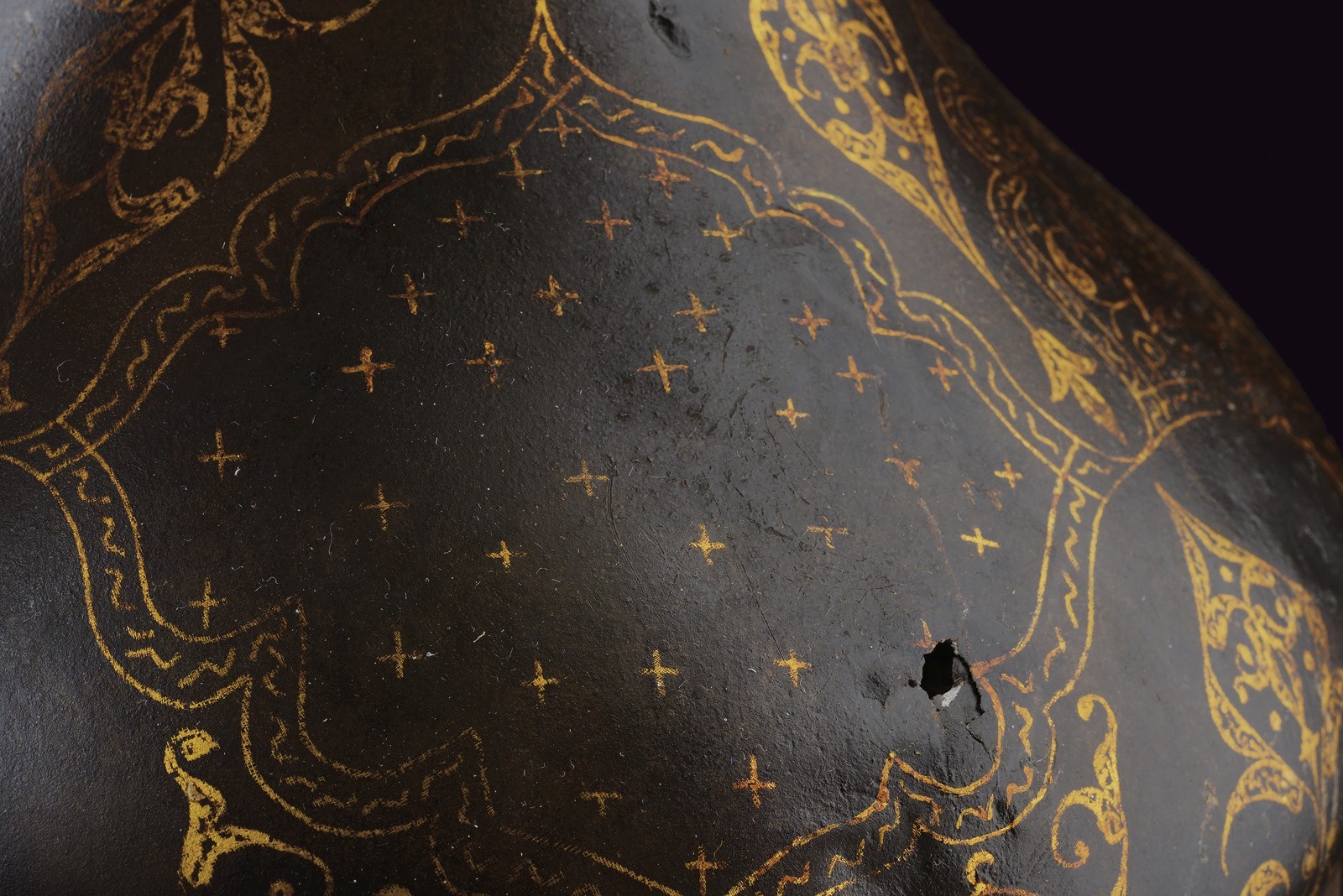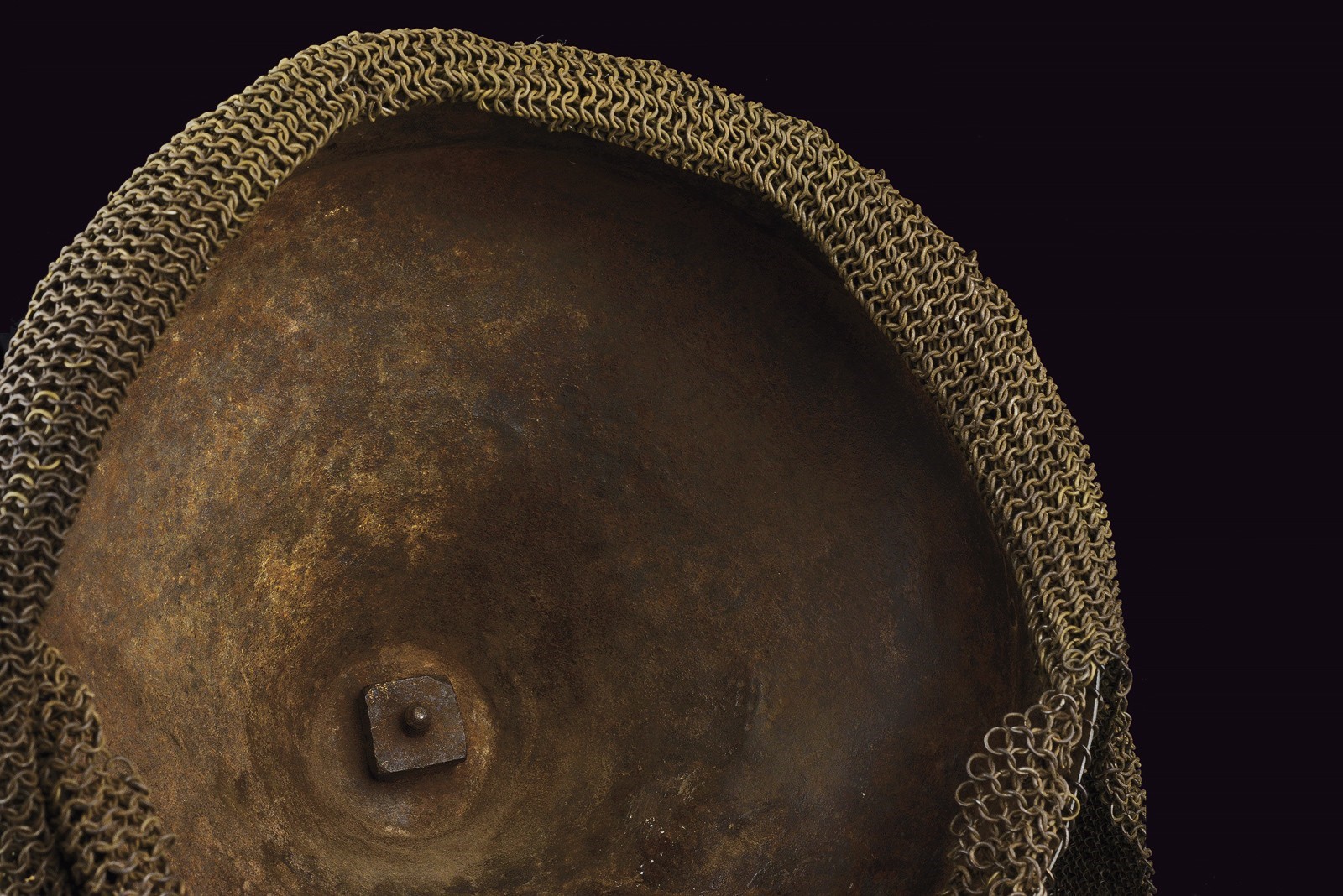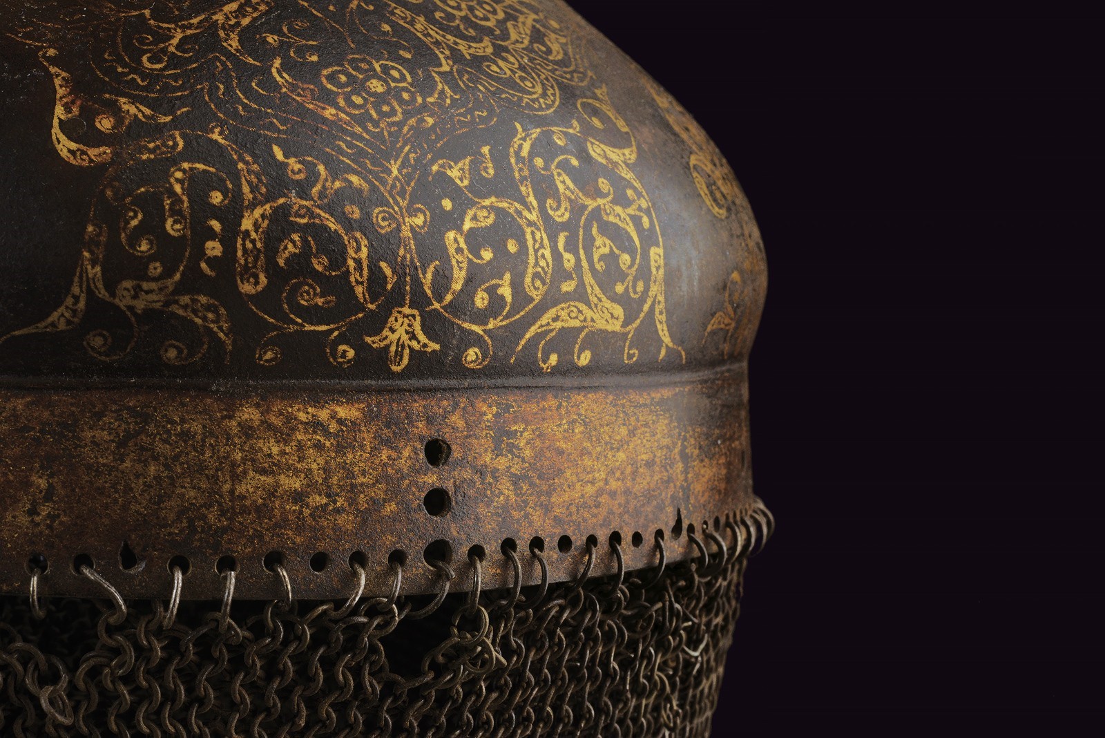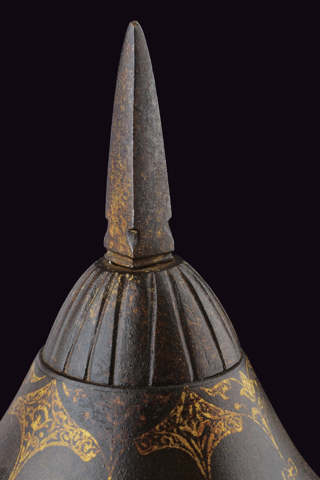 A skull worked in one piece (small pittings on one side and a hole in the front) with an inverted cup structure, the top with cusp of square section and resting on a base shaped as a truncated cone and decorated with rays; the entire surface finely painted in gold with floral cartouches and stars, the base slightly lowered and of circular shape, also gilded and with holes for the lining, the lower edge with a mail neck-defense, which is made up of numerous small rings, worked with a fringed pattern in the final part .