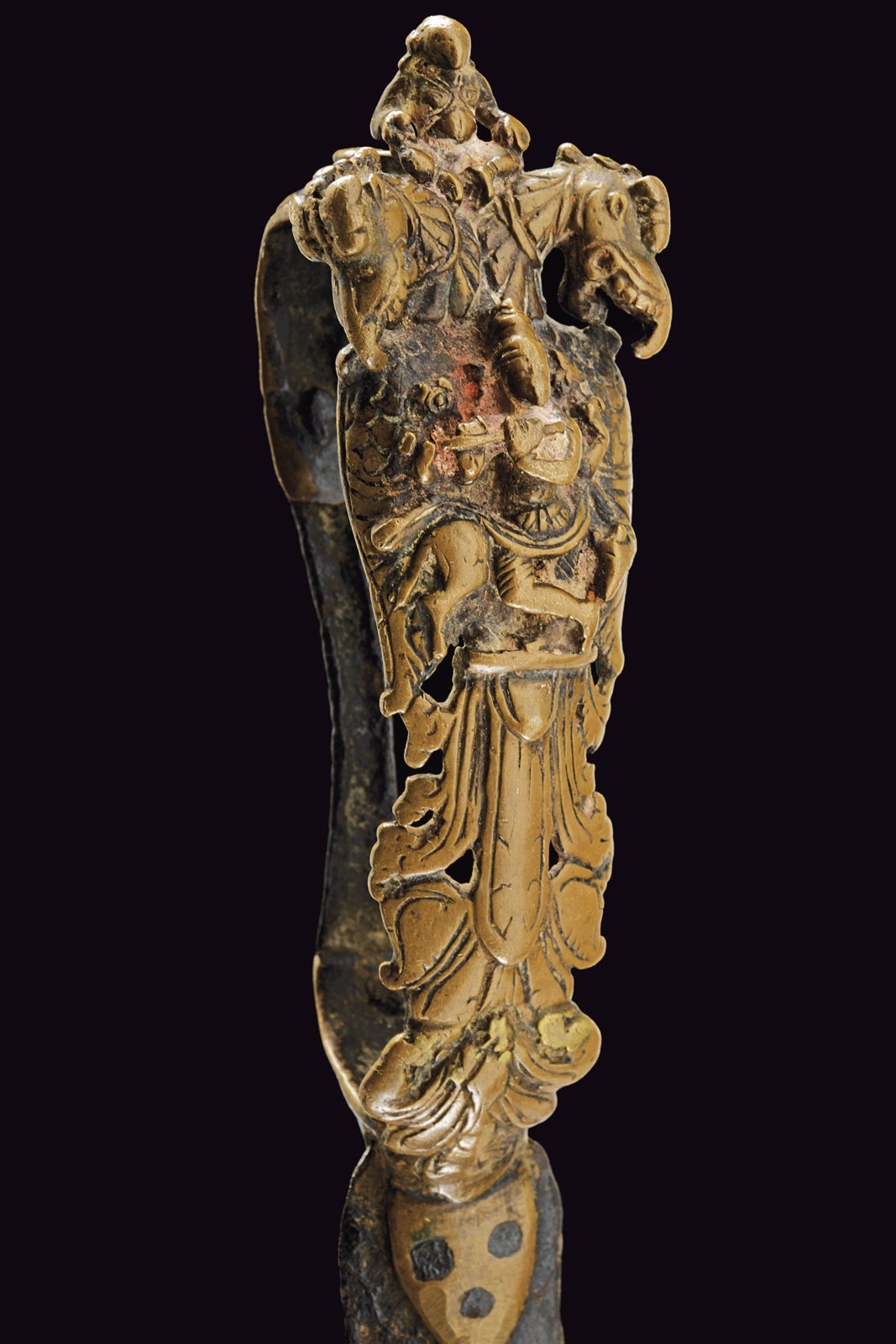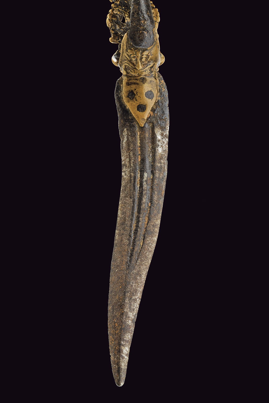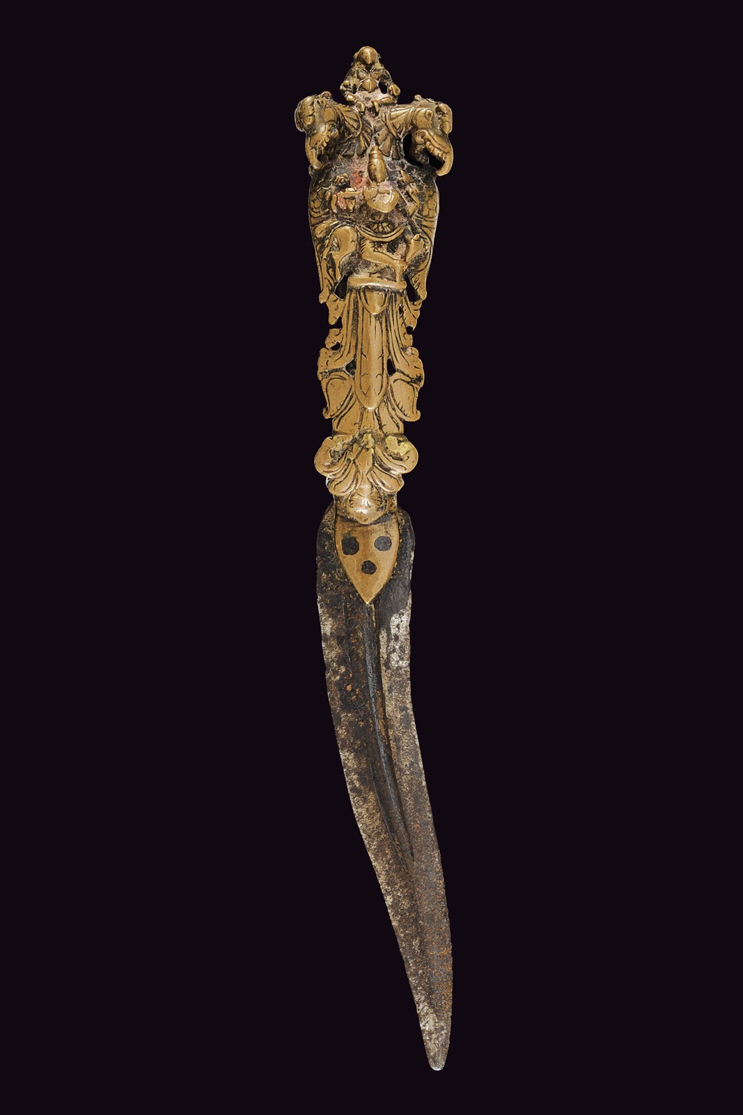 Short, curved, iron, double-edged blade with central groove, nice, bronze grip with Krishna playing the flute, two Yali dragons and monkey god Hunuman.