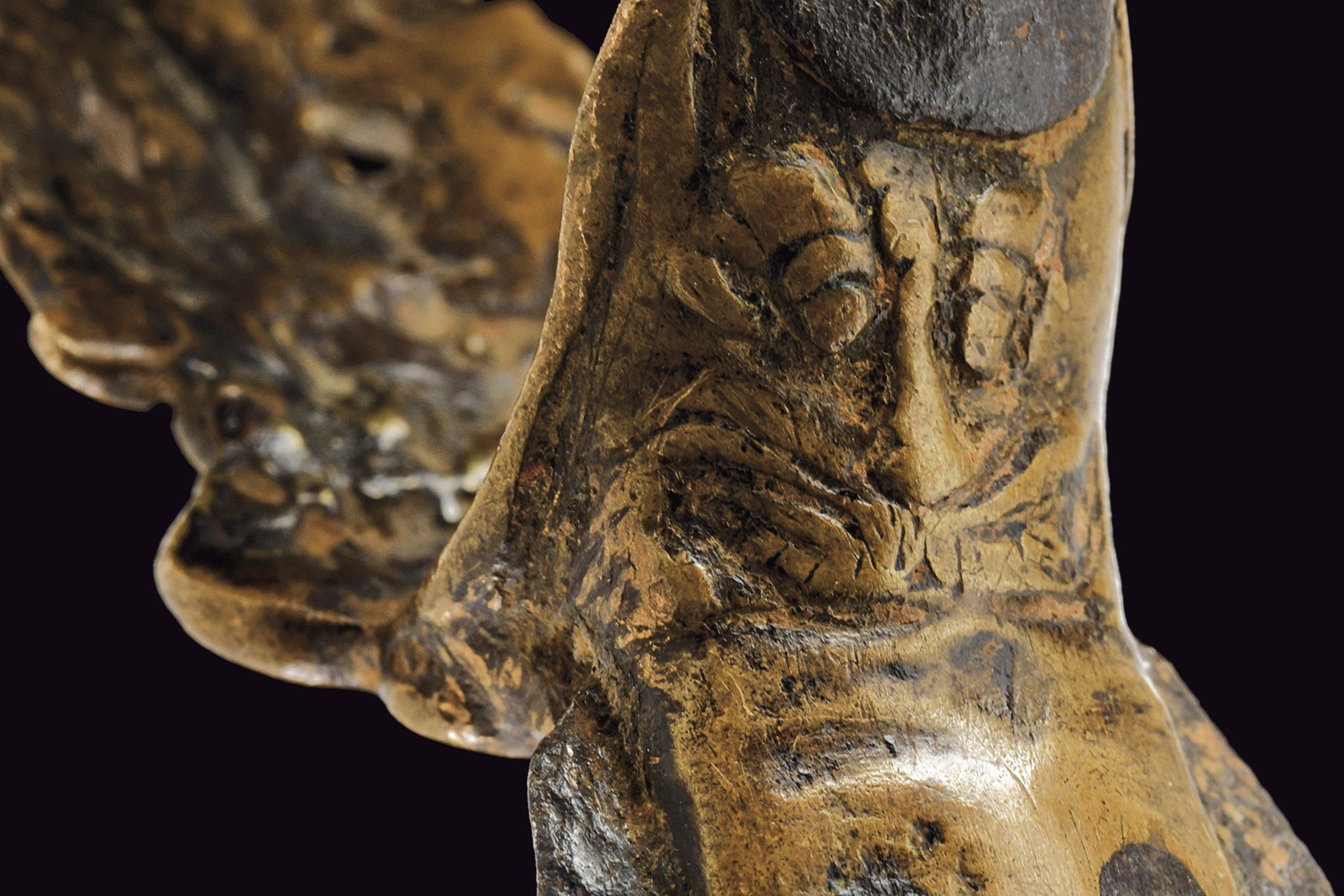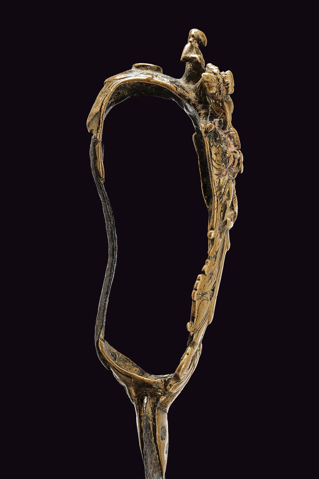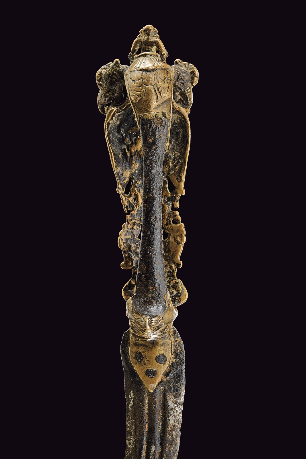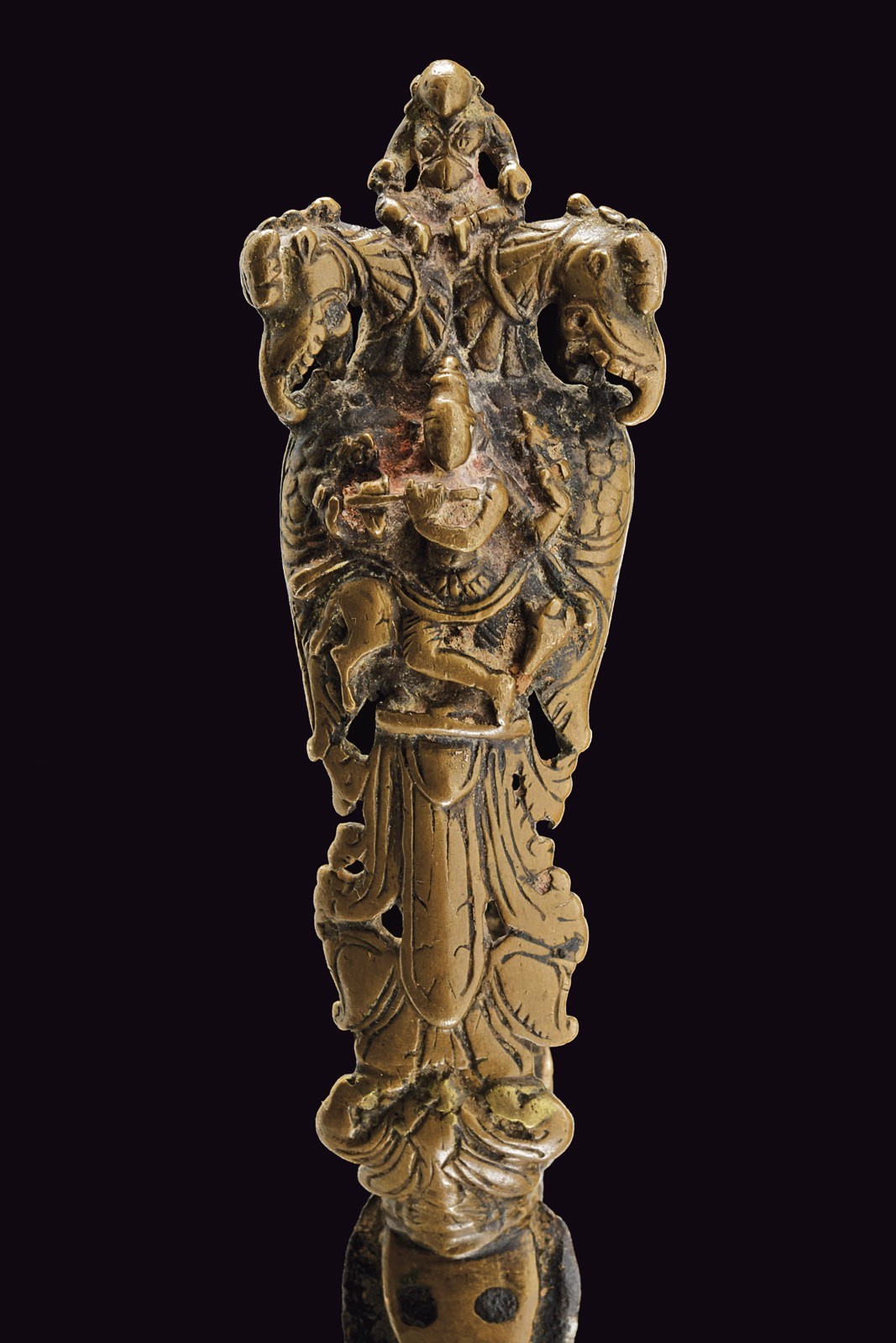 Short, curved, iron, double-edged blade with central groove, nice, bronze grip with Krishna playing the flute, two Yali dragons and monkey god Hunuman.