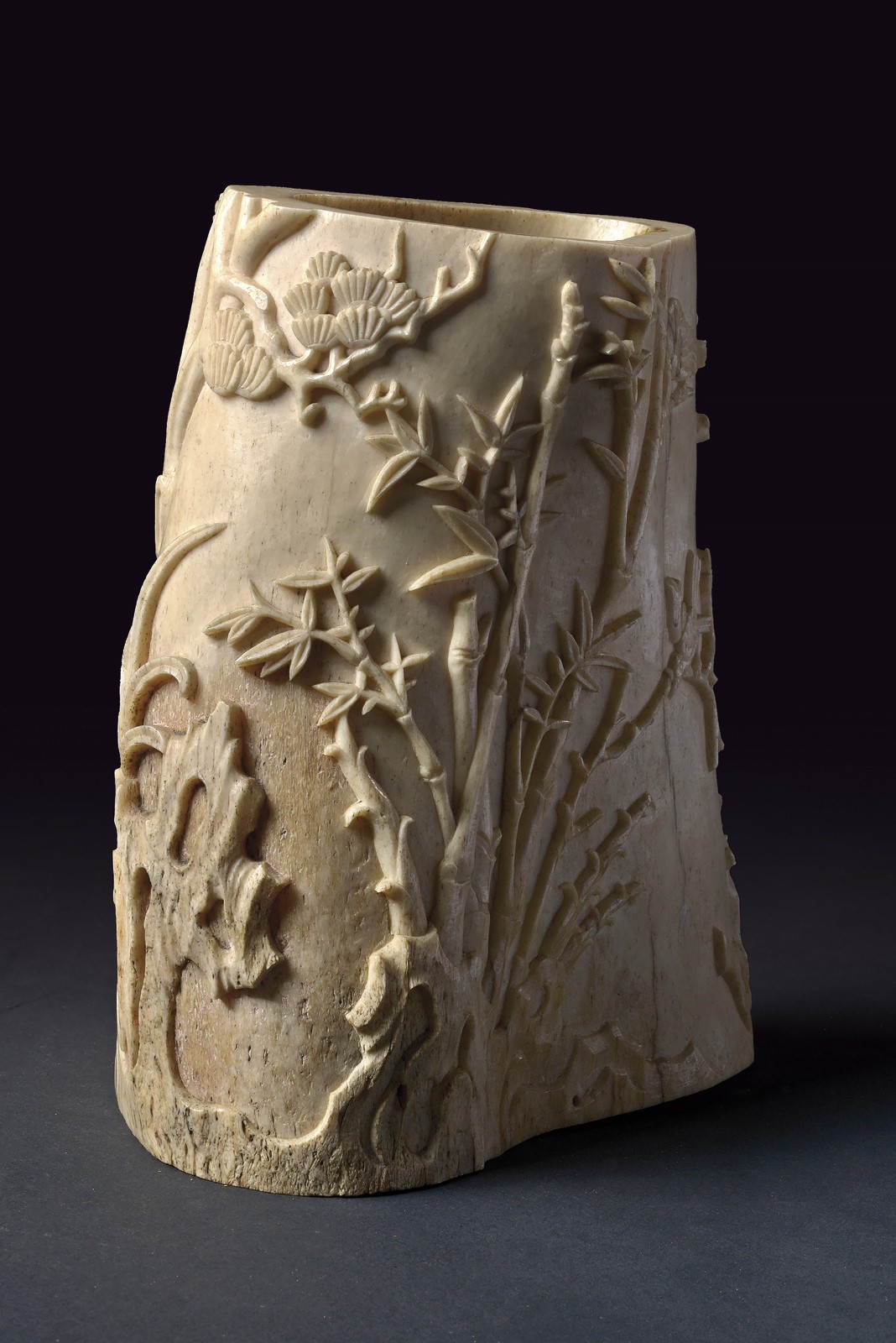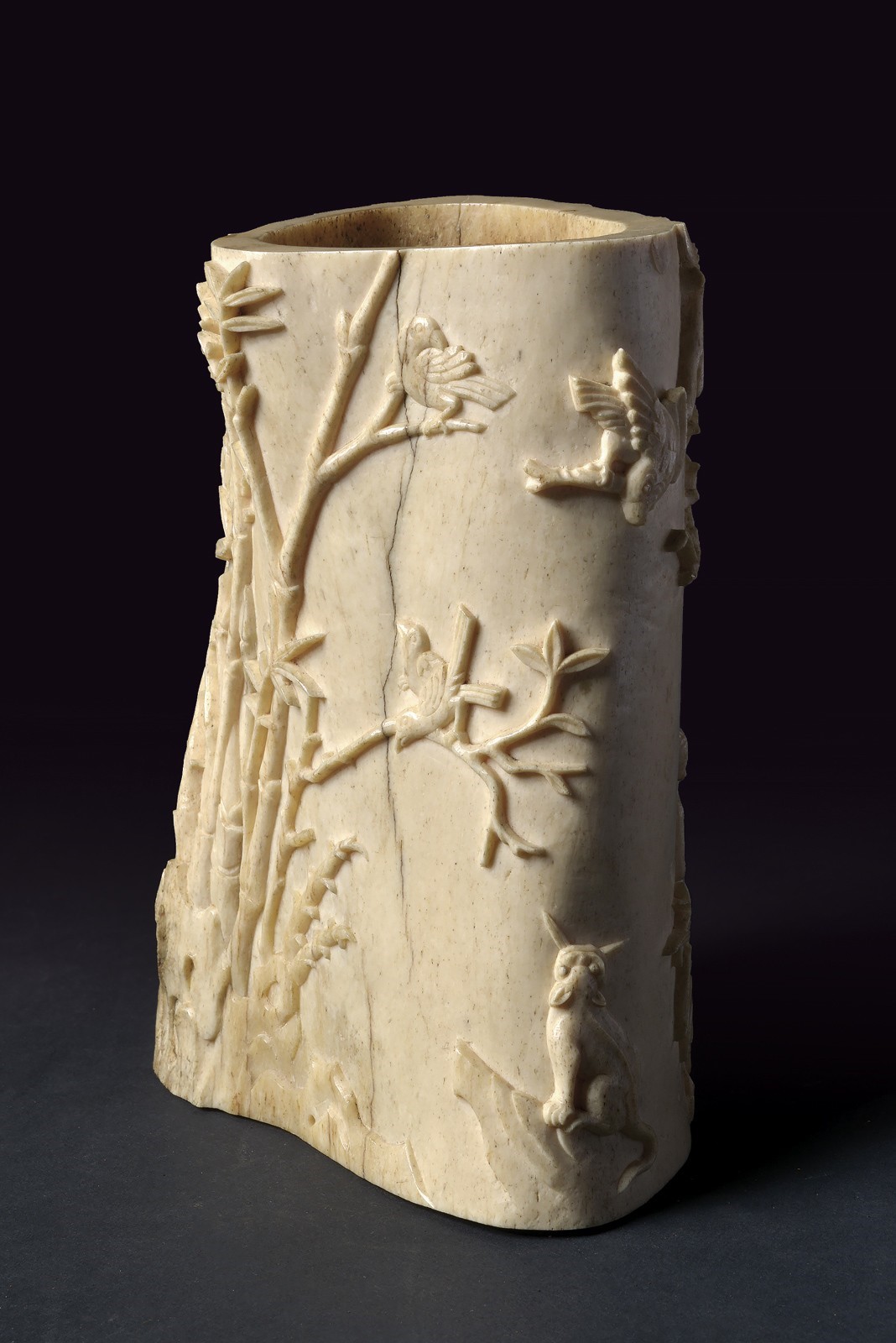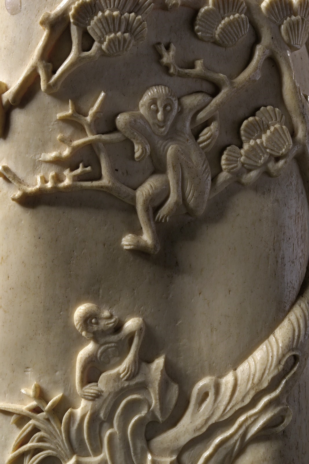 Made of bone with a flat base; the side surface majestically carved with monkeys, birds on bamboo and trees, all in bas-relief. Some cracks.