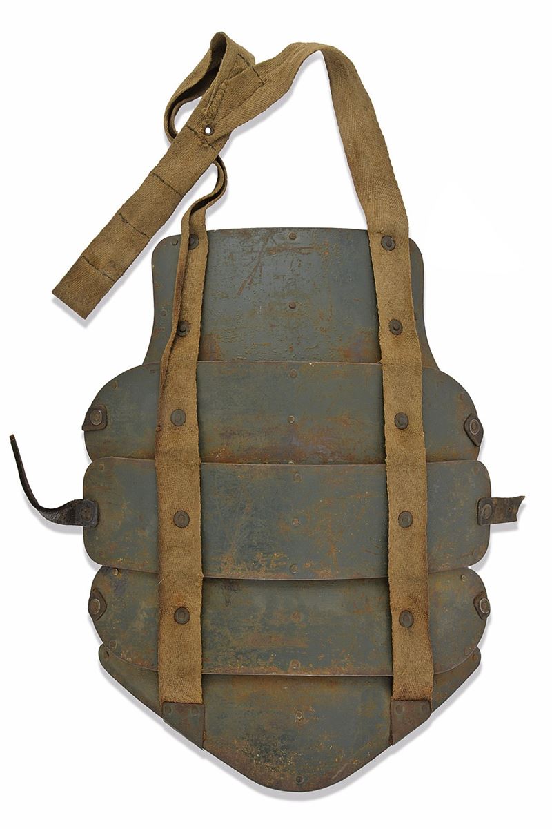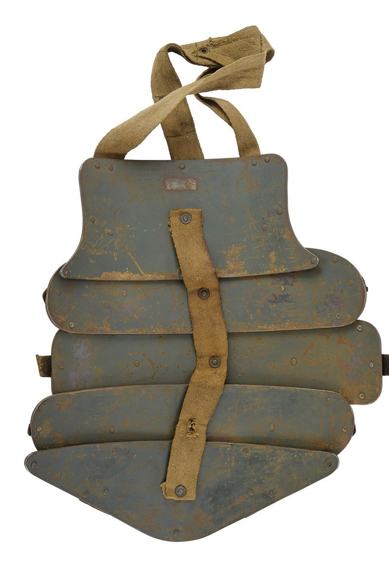 Consisting of five heavy iron plates, finished in grey-green (with missing parts); held together by hemp straps with iron rivets. Remains of leather strings.