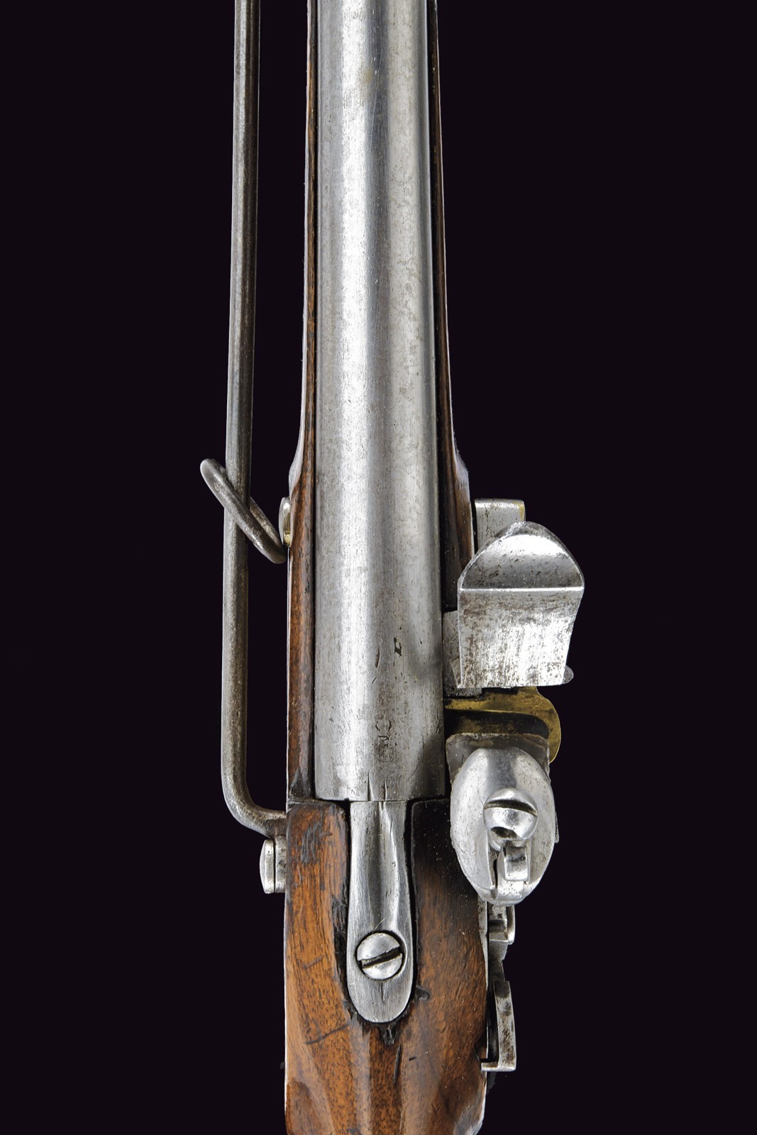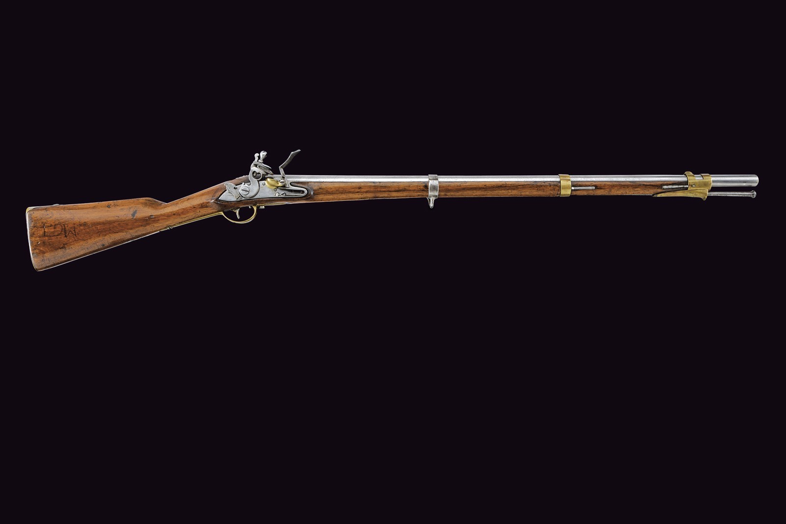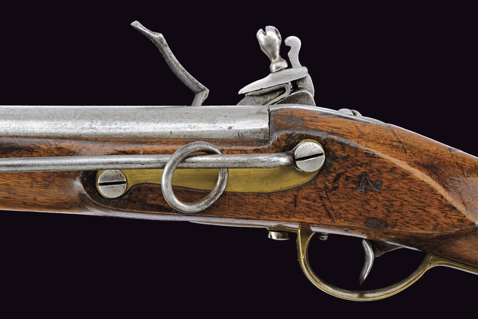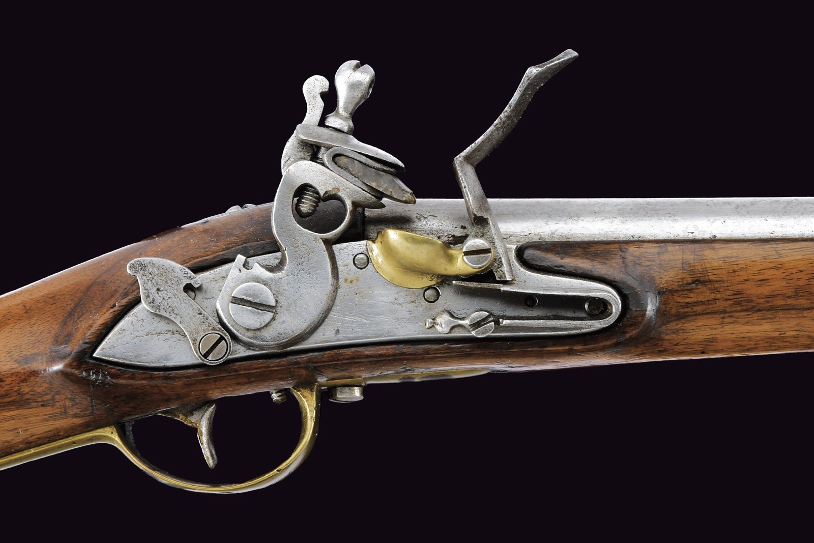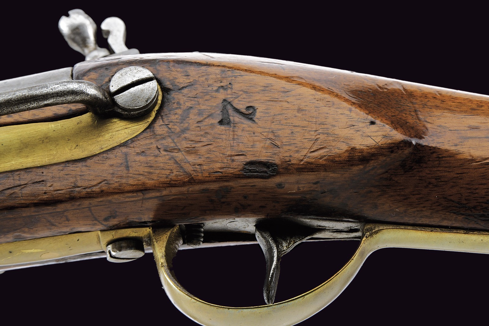 Round, smoothbore, 17 mm cal. barrel with traces of proof mark at the base; foresight on the muzzle ring. Tang with sight. Flintlock with brass pan and safety lock. Wooden full stock (some stamps, small losses) with brass mounts, shaft with swivel ring and ramrod.