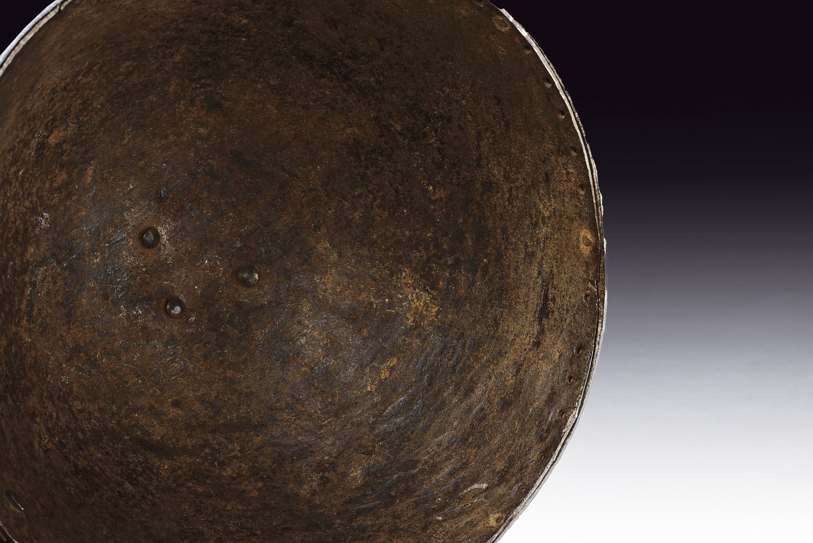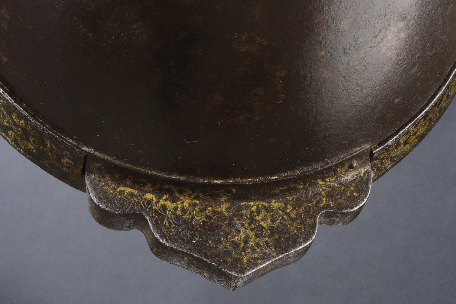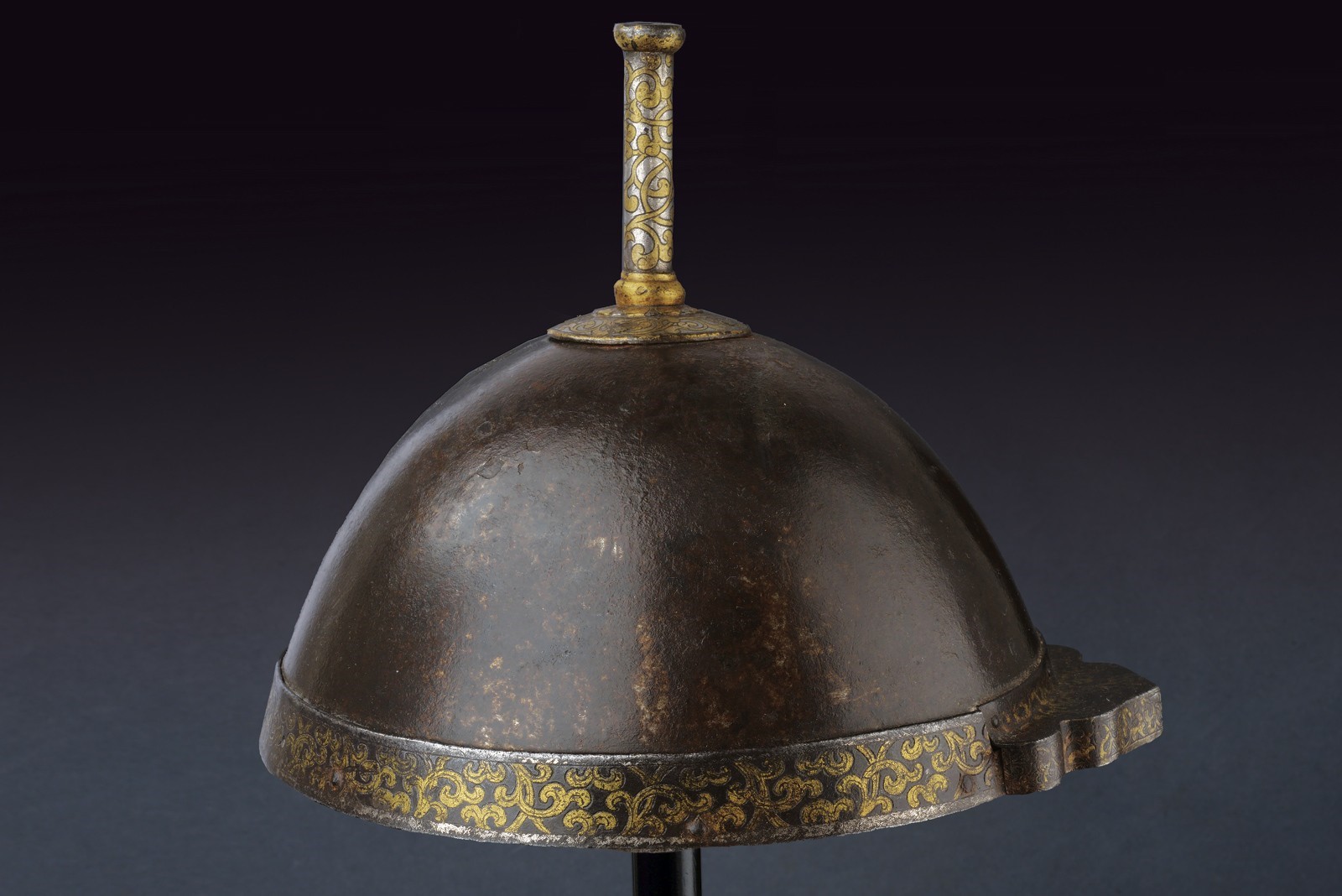 Hemispherical skull hammered in one piece, with a cylindrical cusp at the top worked into a plume-holder and resting on two discs, all engraved with phytomorphic motifs in gold and silver. The front with small, pointed brim decorated en suite. The base with riveted ring decorated with floral motifs in gold and silver edges. Inside with row of holes to fix a mail neck-defense. Interesting.