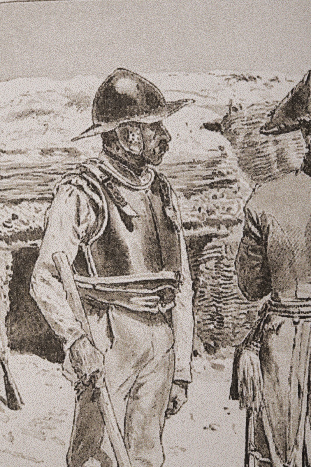 Made of blackened iron; one-piece skull with visor and a riveted brim. With rare cheek-pieces. With a visible blow mark. Remnants of leather strings.