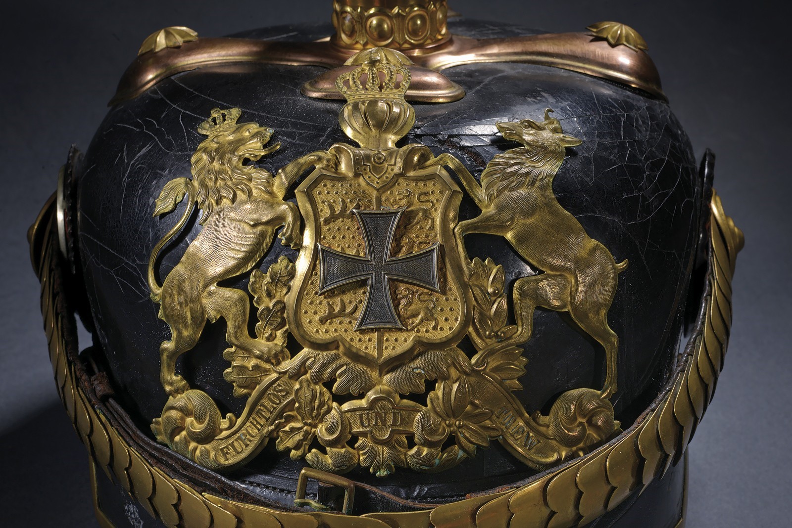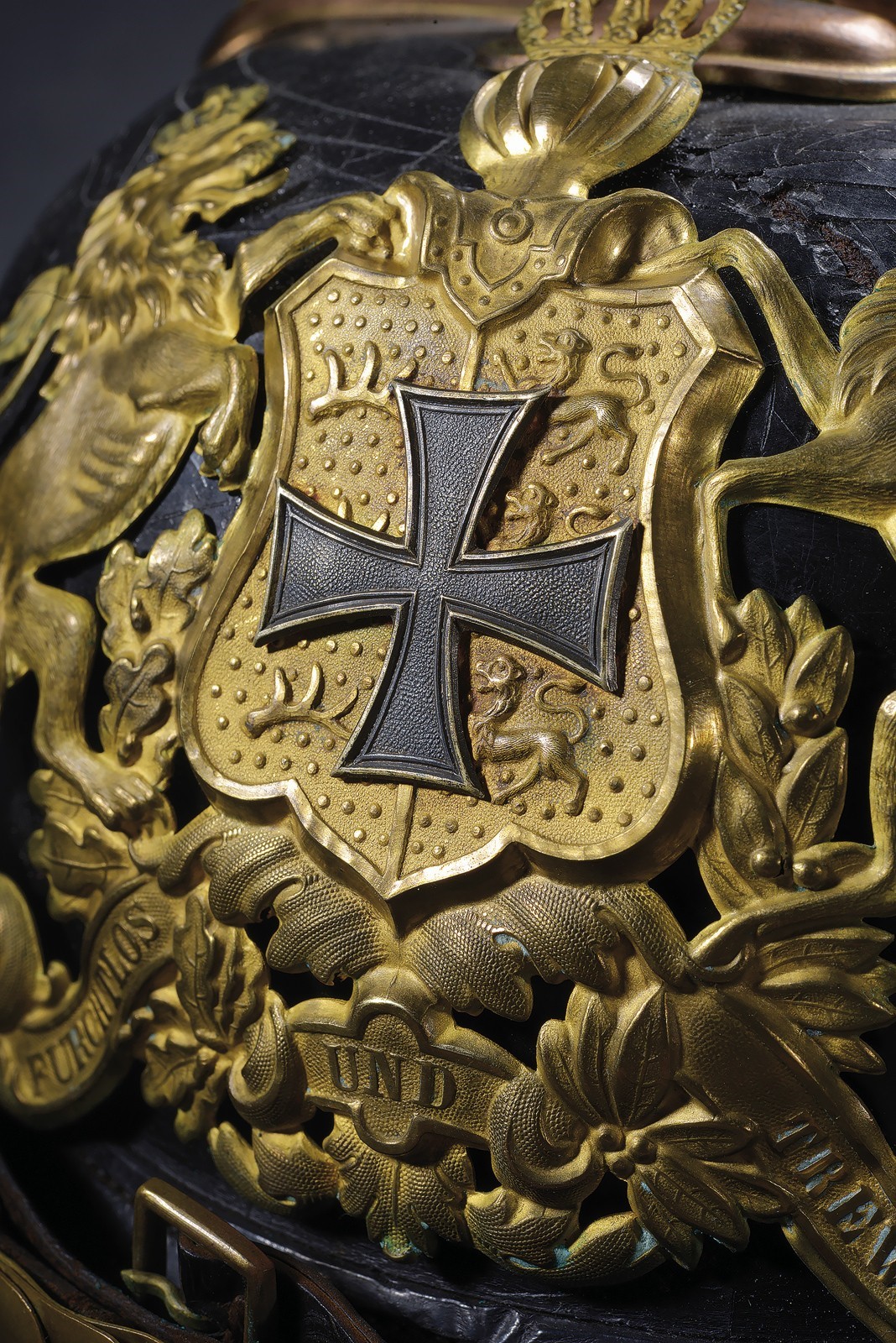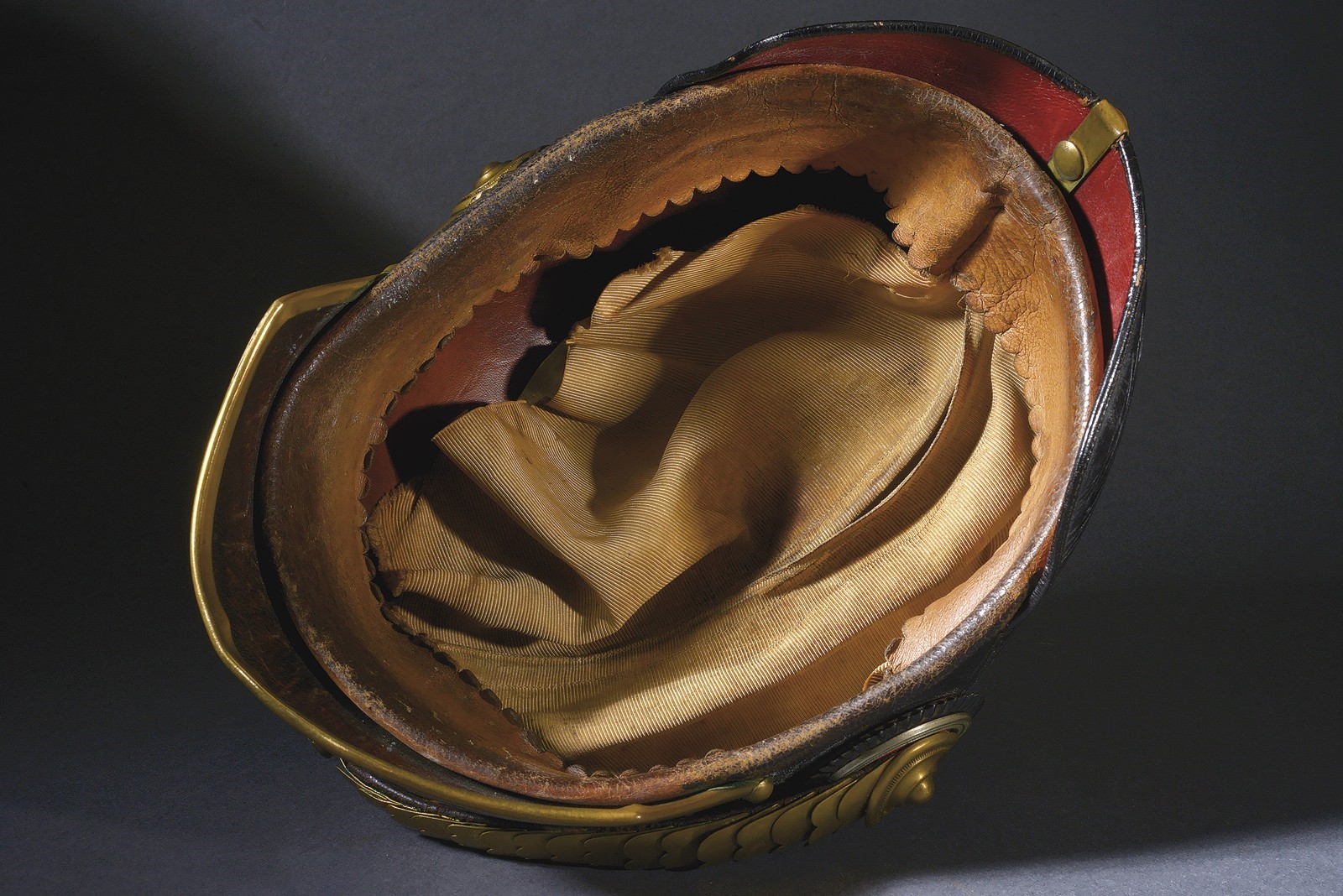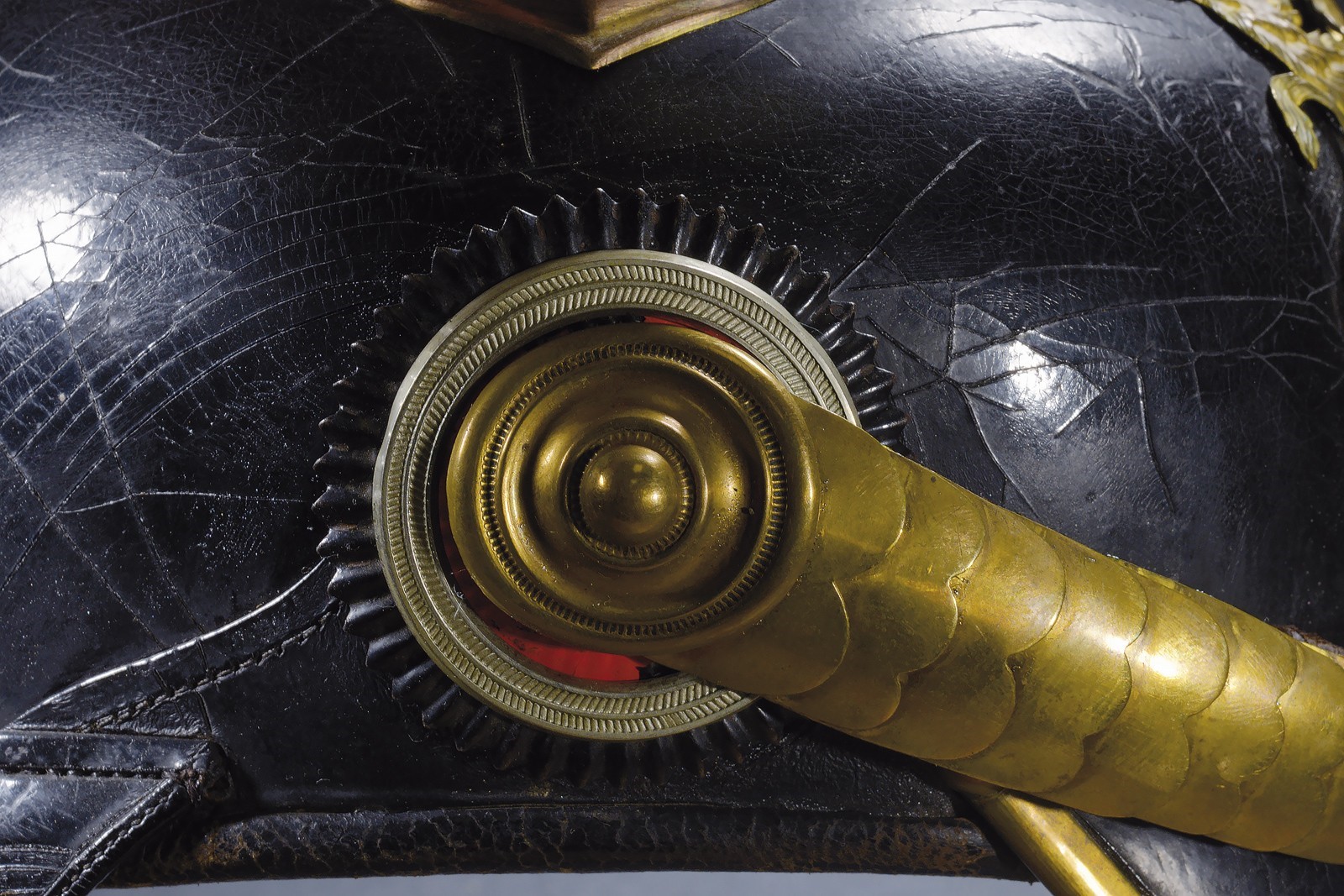Black lacquered leather skull (craquelet and small missing parts). Gold crest with silver cross on the front (deer antlers missing). Smooth tip on cross with star rivets, all made of brass. Chin-strap with convex scales, both cockades. Leather sweat-band inside, cap partially to be attached.
