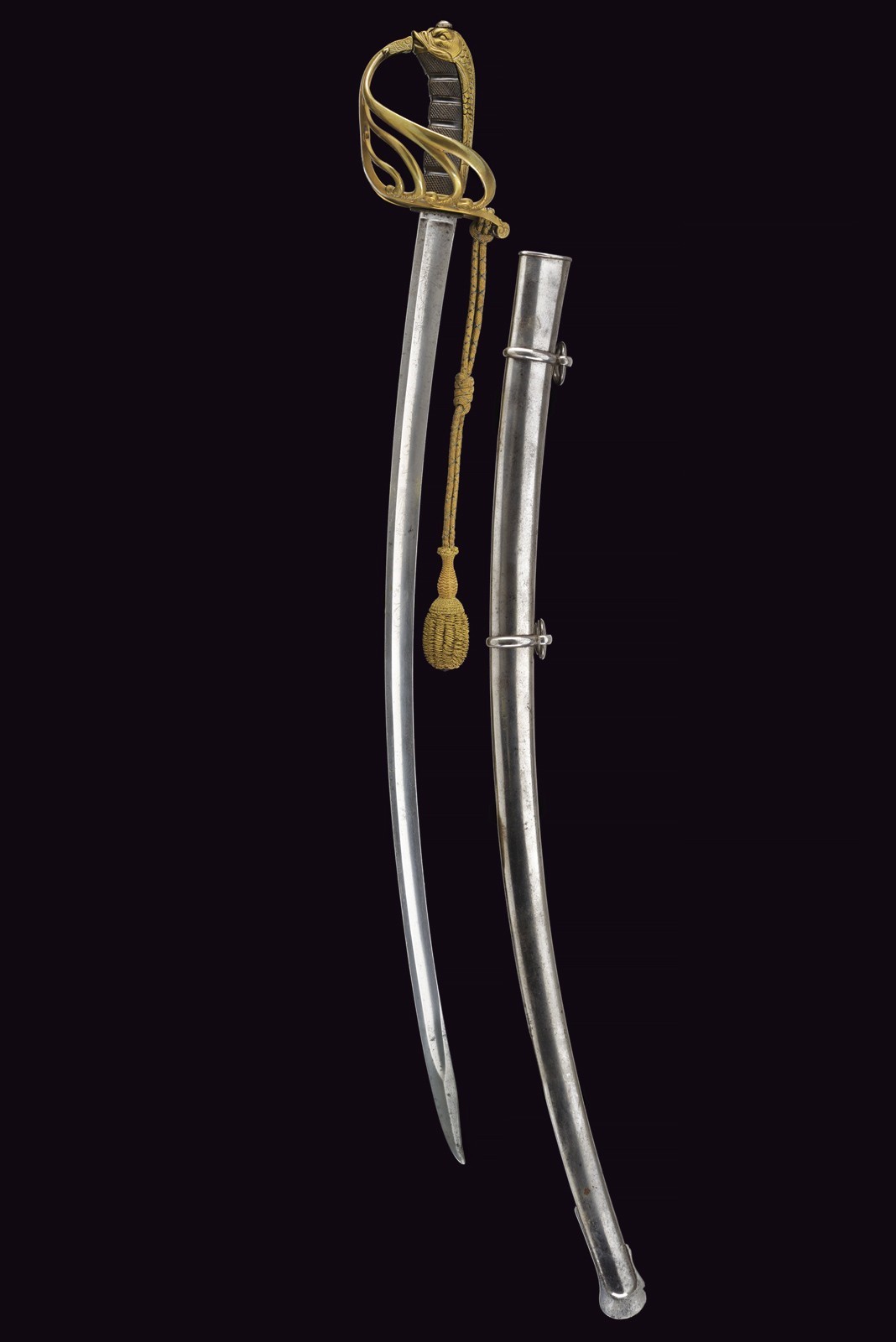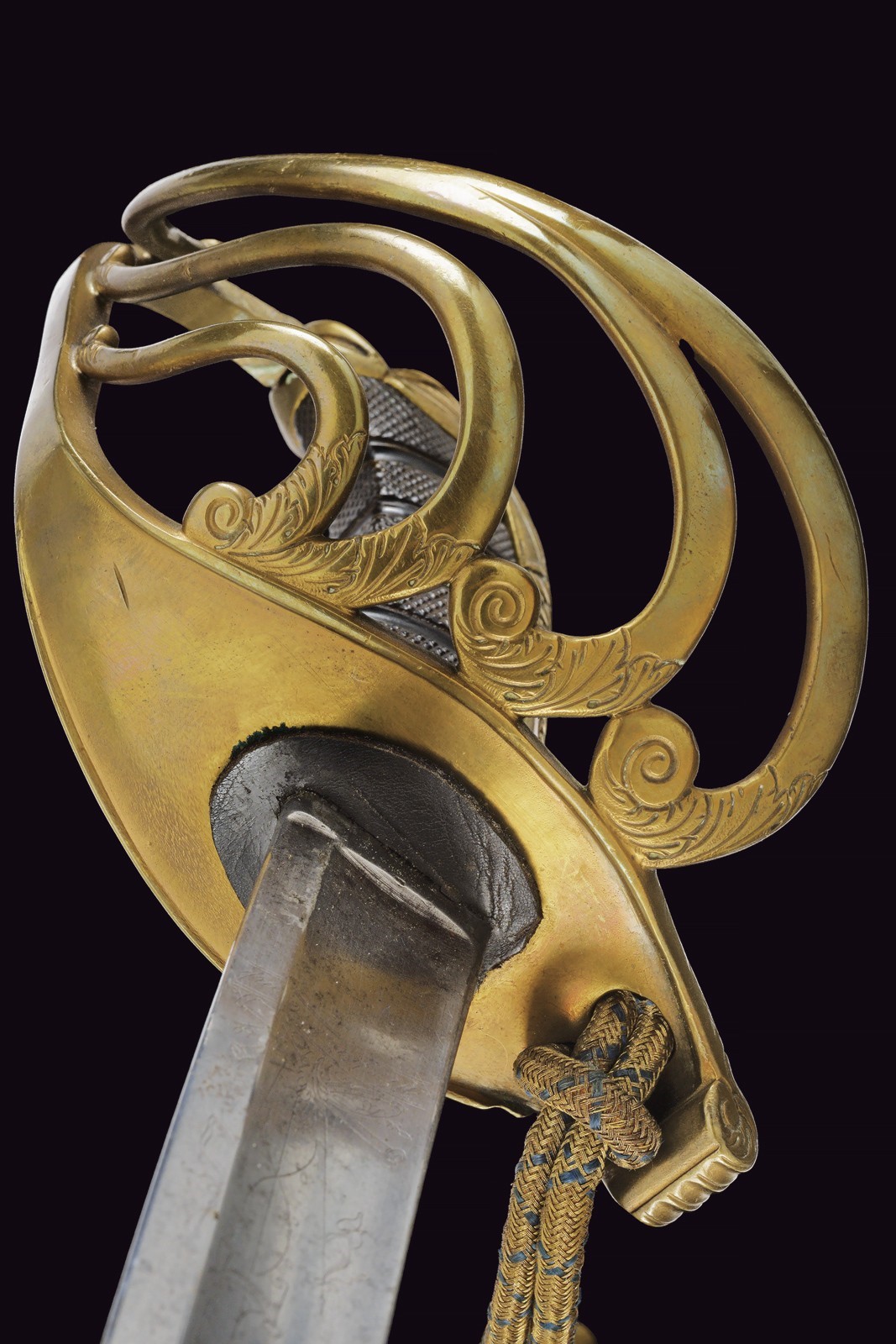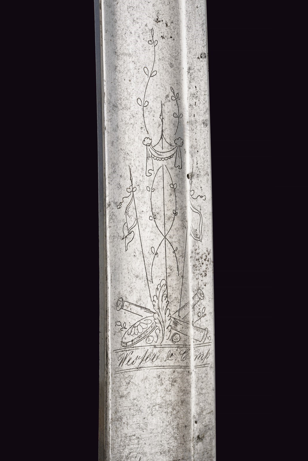 Curved single-ans short-false-edged blade, with fuller for almost its entire length, finely engraved with racemes and trophies on the upper half, signed at the forte by Wester & Co., Solingen. Interesting tip, slightly hollowed on the spine and ribbed at the center. Bronze mounts with remains of gilding. Broad guard featuring four additional backward-curved branches with floral-decorated heads. Typical “dolphin”-shaped pommel with iron circular button and scaled back. Dark horn grip featuring checkered sectors. Iron scabbard with two lugs. Threaded, gold-yellow sword knot. Overall condition good to very good, with small signs of use and age. Rare.