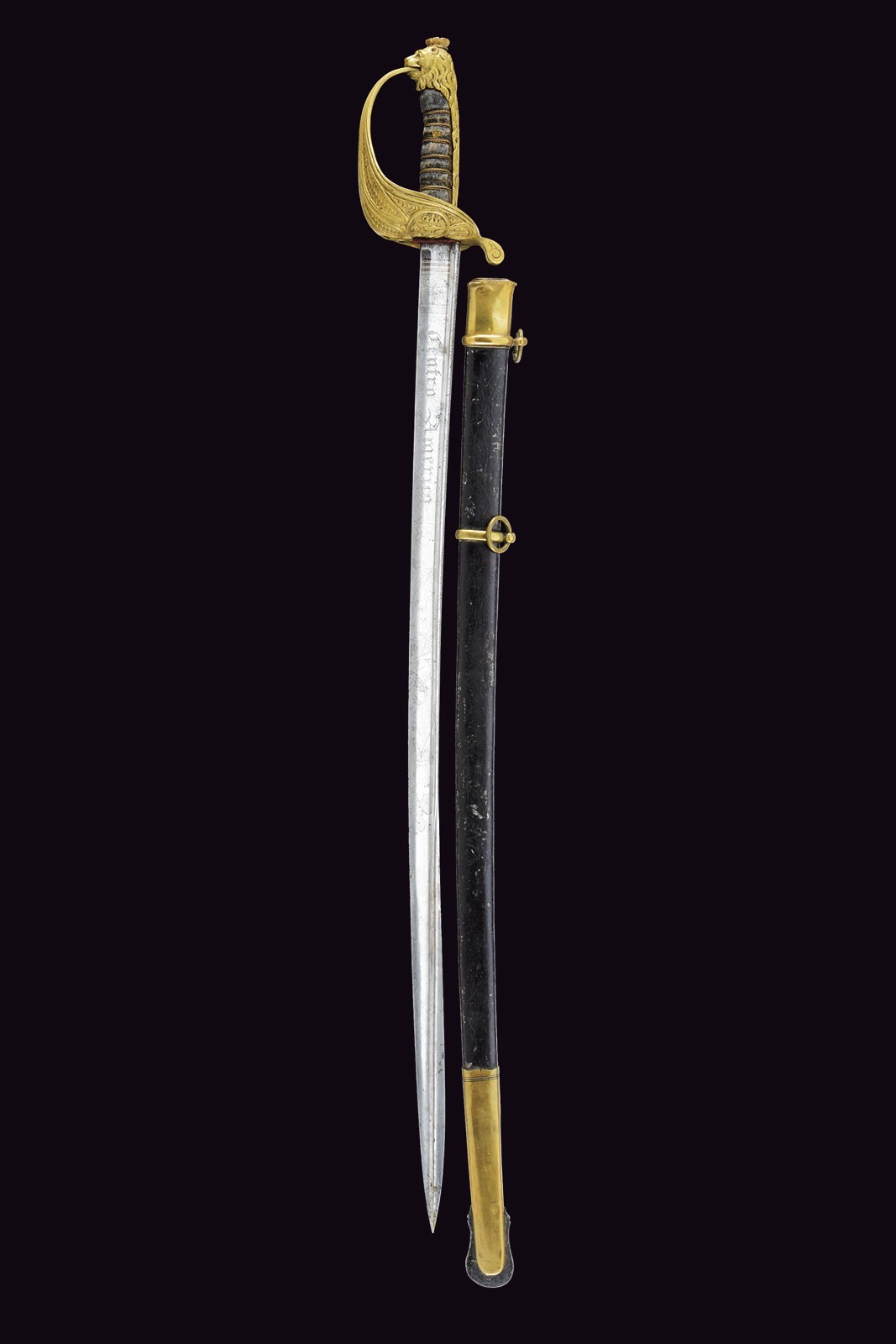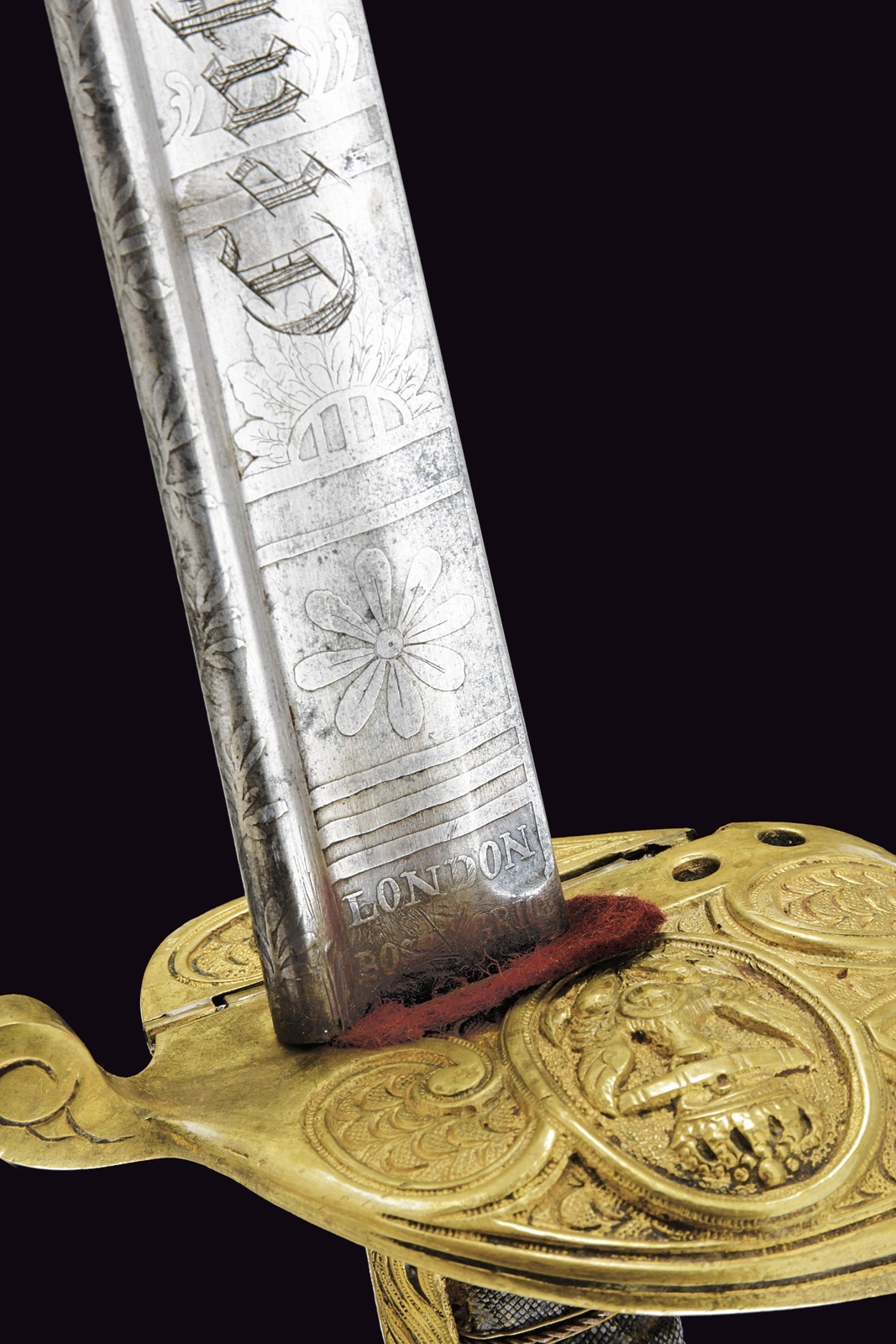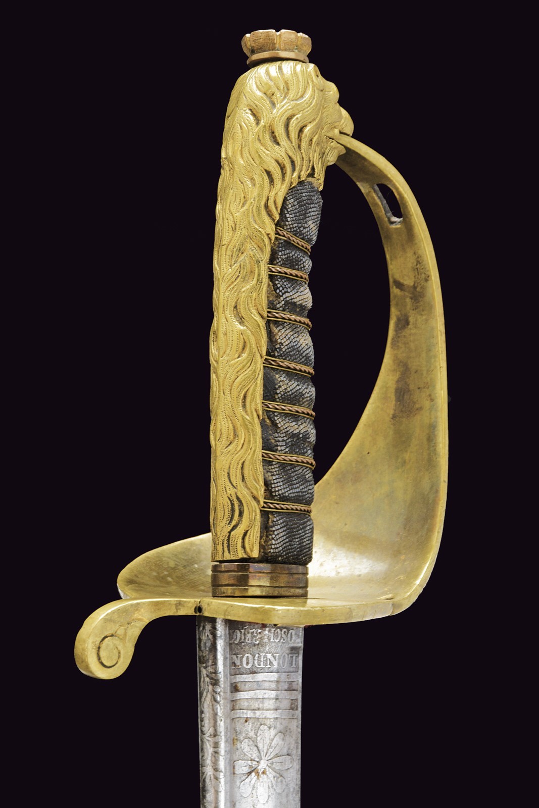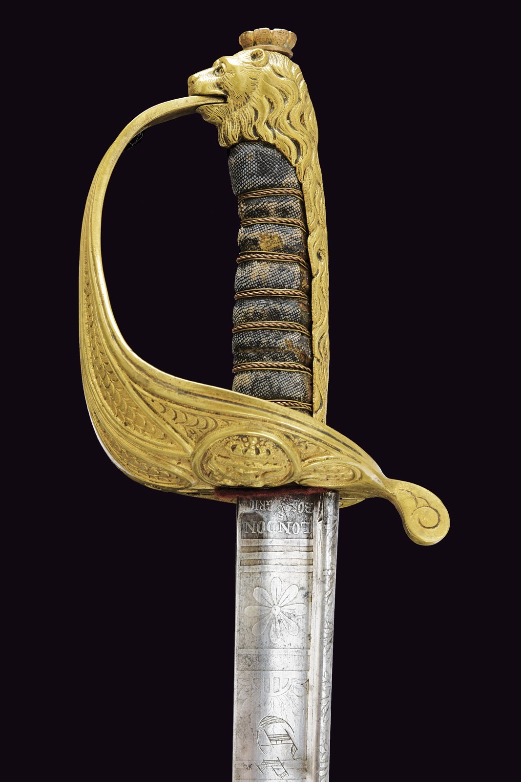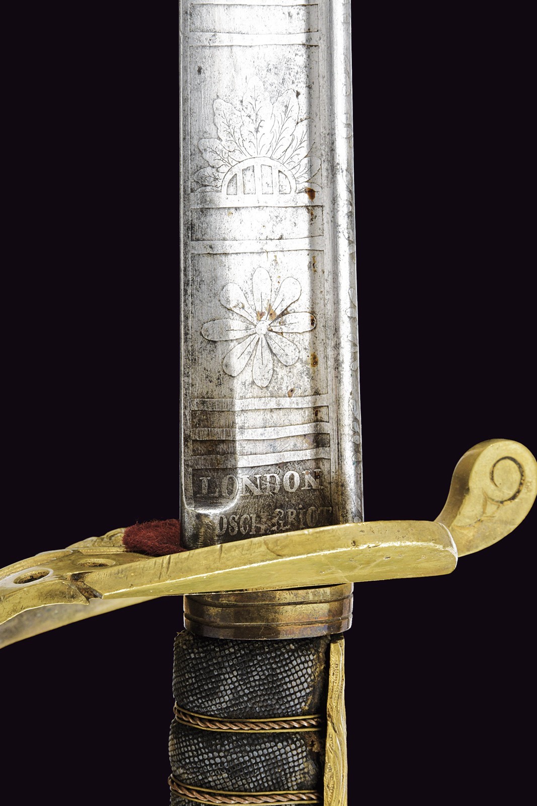 Slightly curved, single-and-a-half-edged blade, with thickened back that turns into a rib at the weak and runs to the tip. The surface is engraved for almost two thirds, featuring racemes on both sides, a trophy with a drum, cannon, and flags, along with other floral decorations and, again on both sides, a large anchor. The back is engraved with racemes. The right side was engraved later (but certainly during its period of use) with the inscription “Centro America.” At the base is the mark of a London manufacturer, not clearly legible “...OSCH & ...”. Brass hilt with a knuckle guard decorated with scales and loaded with a shield featuring the Savoy eagle in relief, resting on an anchor and surmounted by a crown. On the back, there is a small turning valve (closure with problems). The handle is covered with fish skin and wrapped with copper wire binding. Long cap culminating in a lion's head. Copper button. Metal scabbard covered with bituminous paint and brass mounts. Two lugs. Slight signs of wear and age.