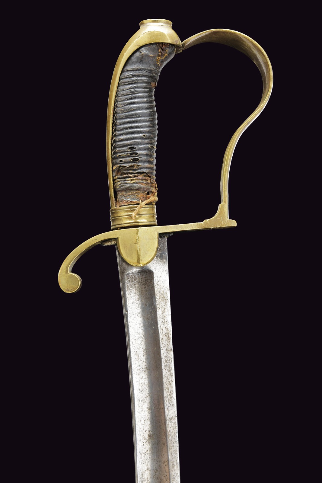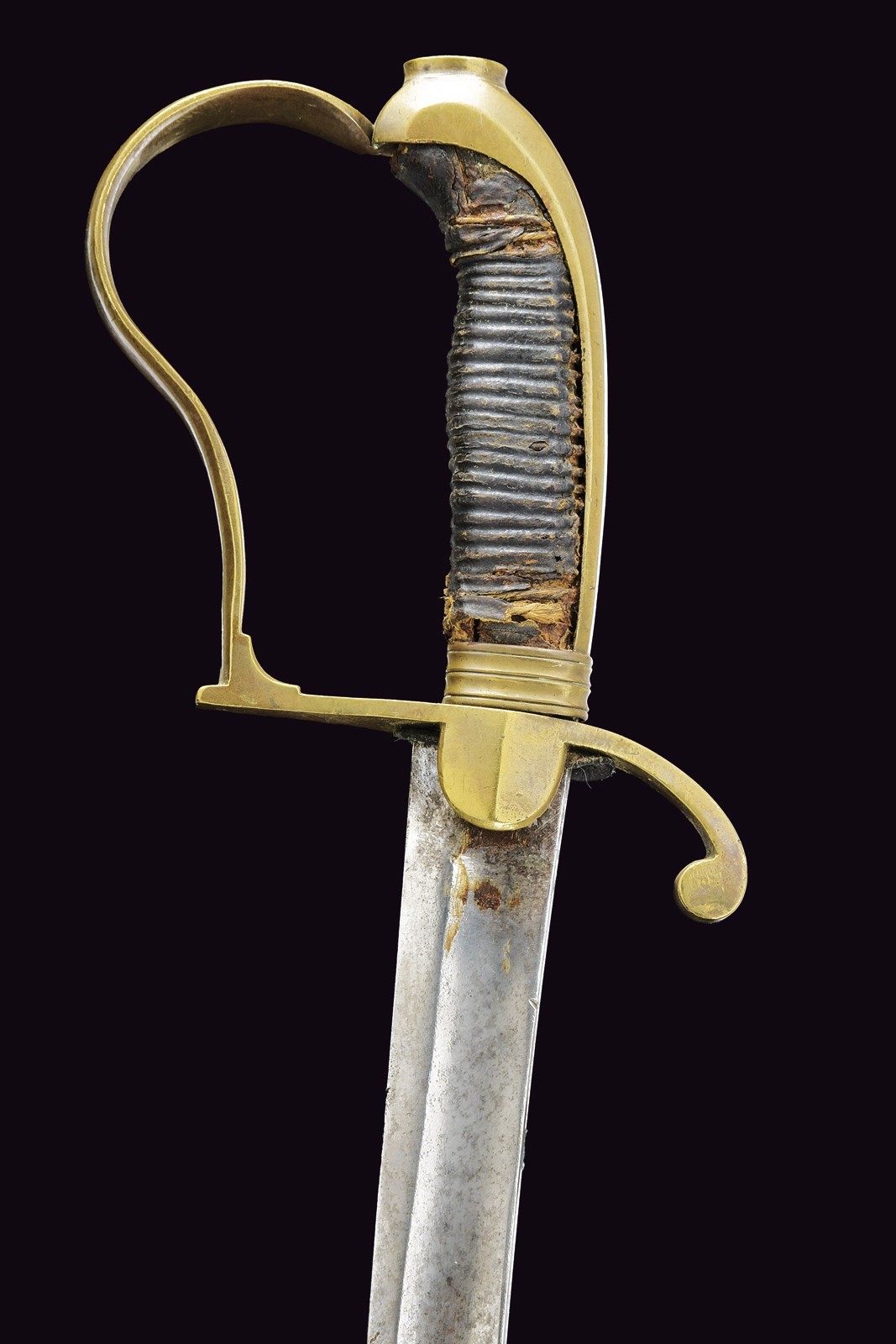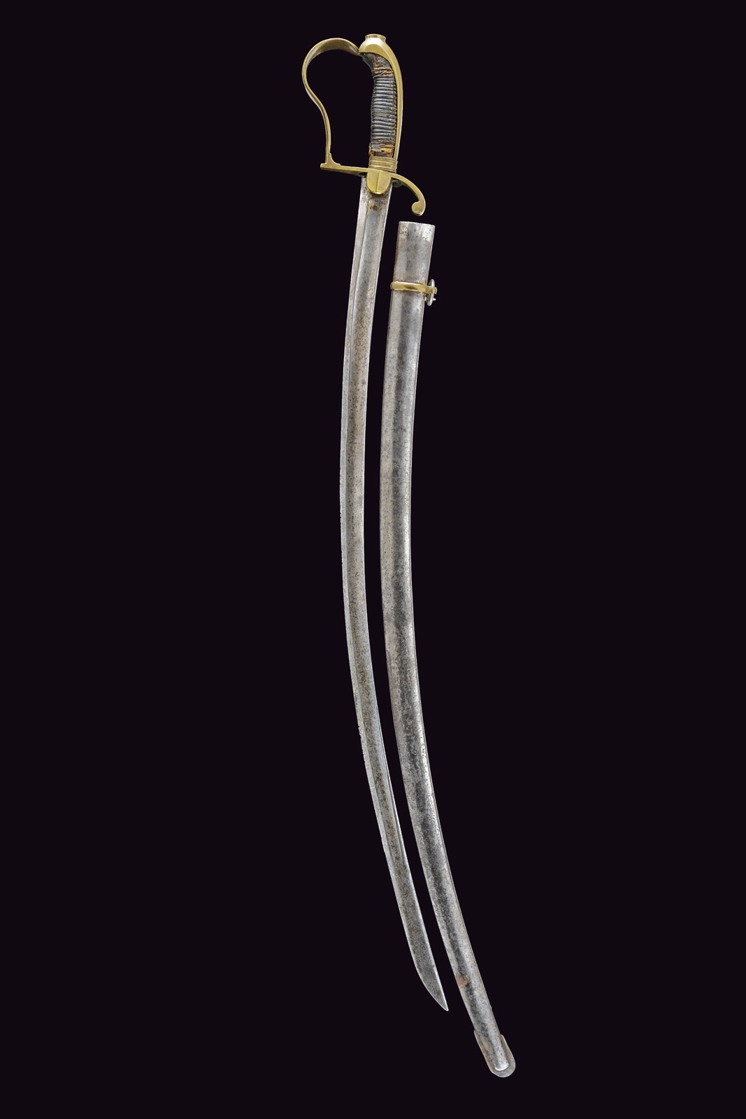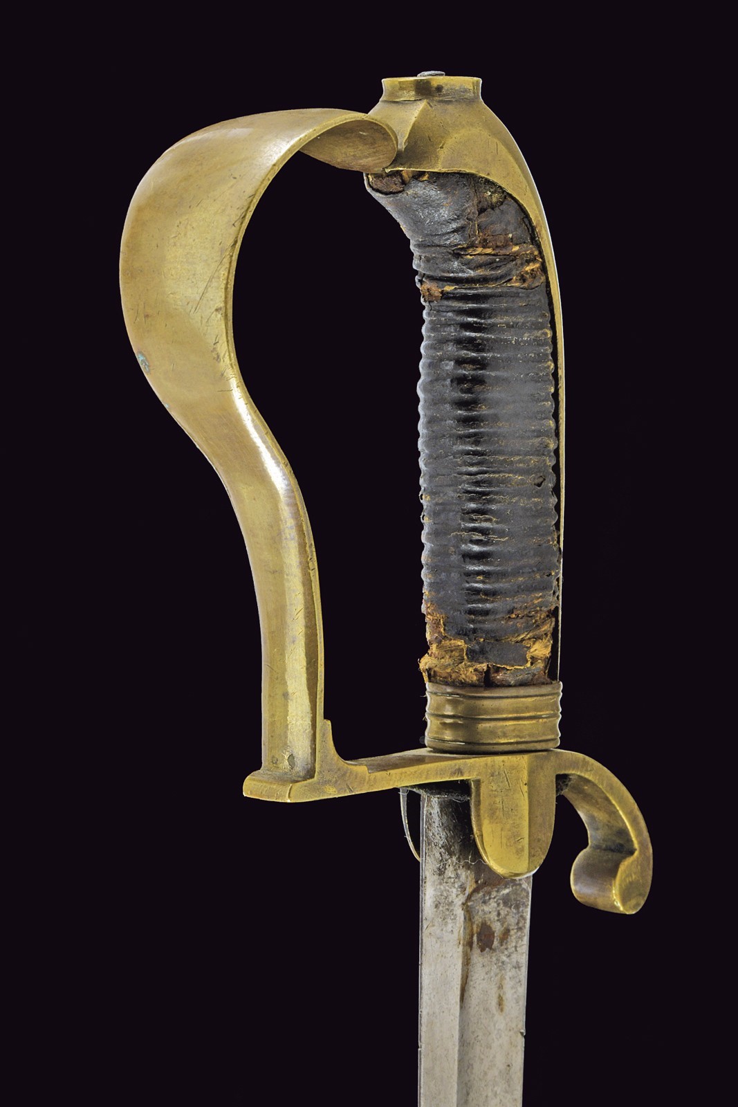 Curved, tipped, single-and short-false-edged blade; tang. Brass hilt with parry quillon featuring a curl and domed guard. Long, brass cap with the top shaped as an elliptical button. Wooden handle covered in leather (missing parts and defects). Iron scabbard with a brass band provvided with an oval lug.