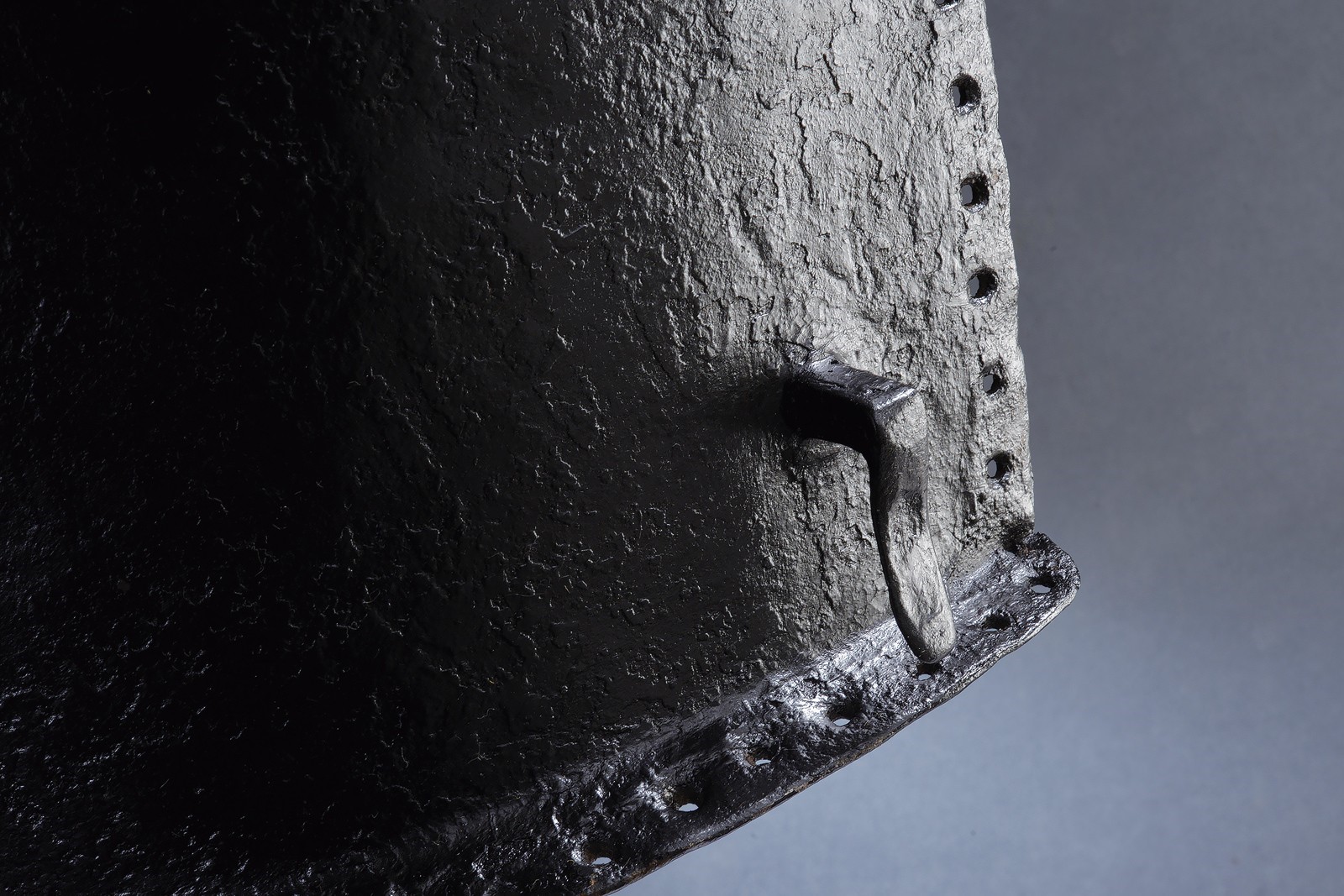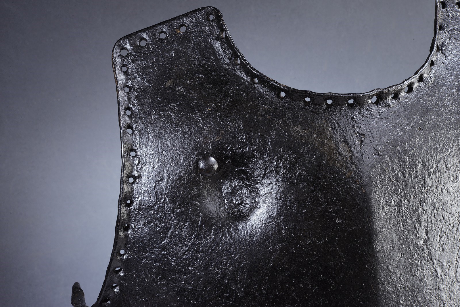 Made of blackened iron (refreshed), in one piece, ribbed at the center; neckline and gusset with raised edge; remains of blow mark; two studs and two side hooks for securing the straps. All edges closely pierced for attaching the lining. Weight 5.7 kg. Rare.