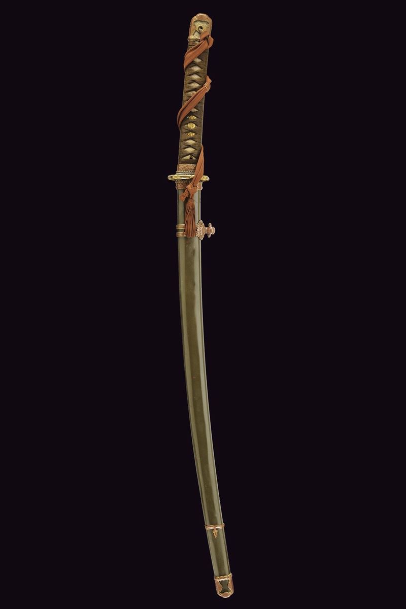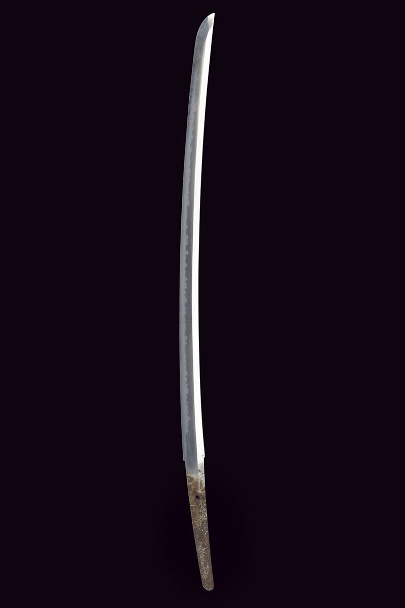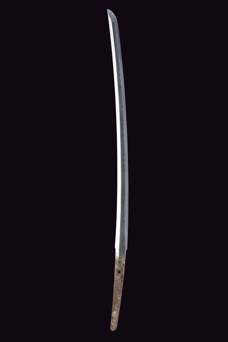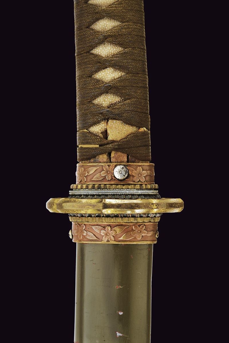 Blade with 64 cm nagasa. Hamon: midare, not visible hada. Nakago with a mekugi-ana (missing mekugi), mei: Noshu Seki Masa Toshi. Brass habaki.Typical shingunto koshirae with chrysanthemum-shaped menuki, tsuka slightly damaged at the base.