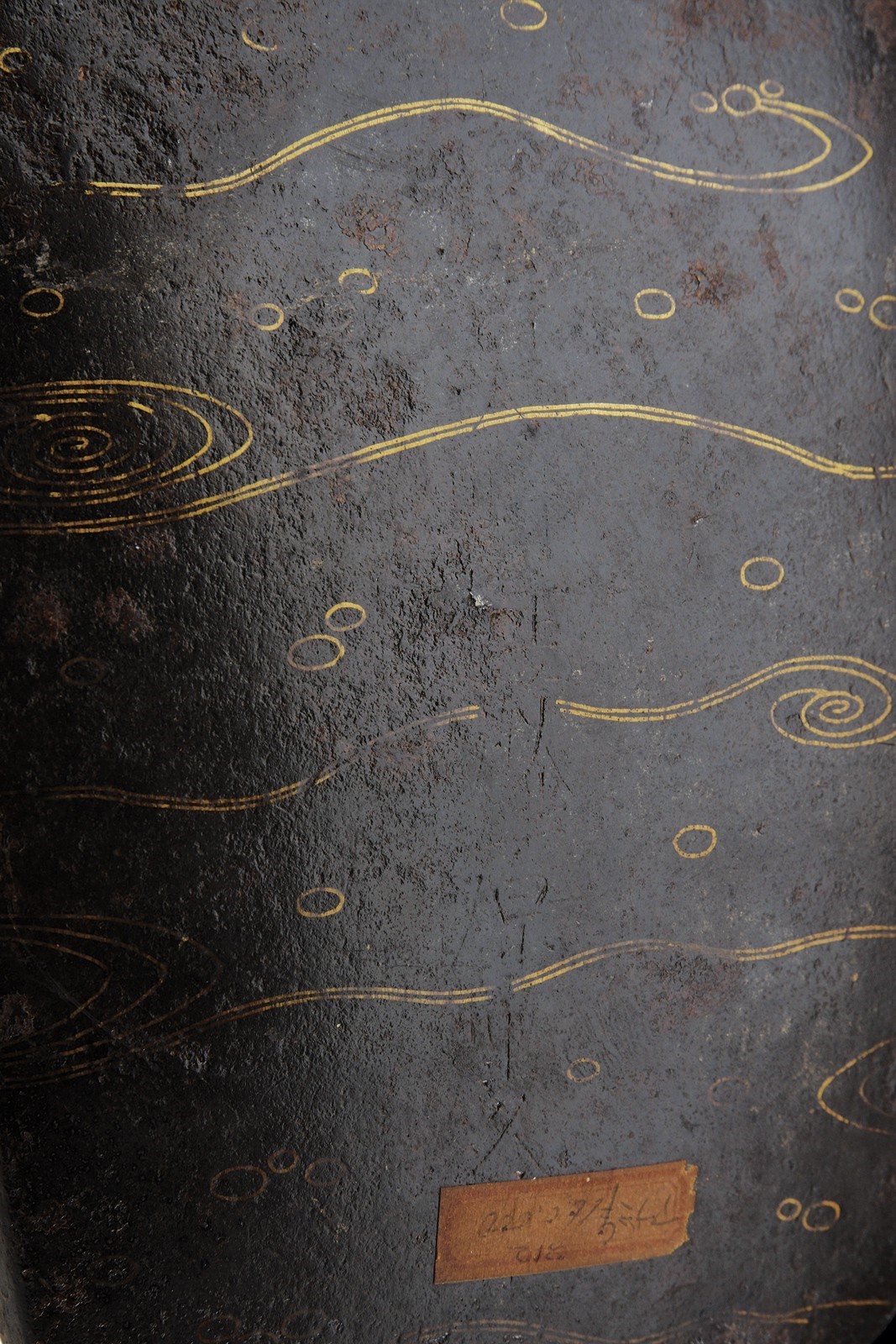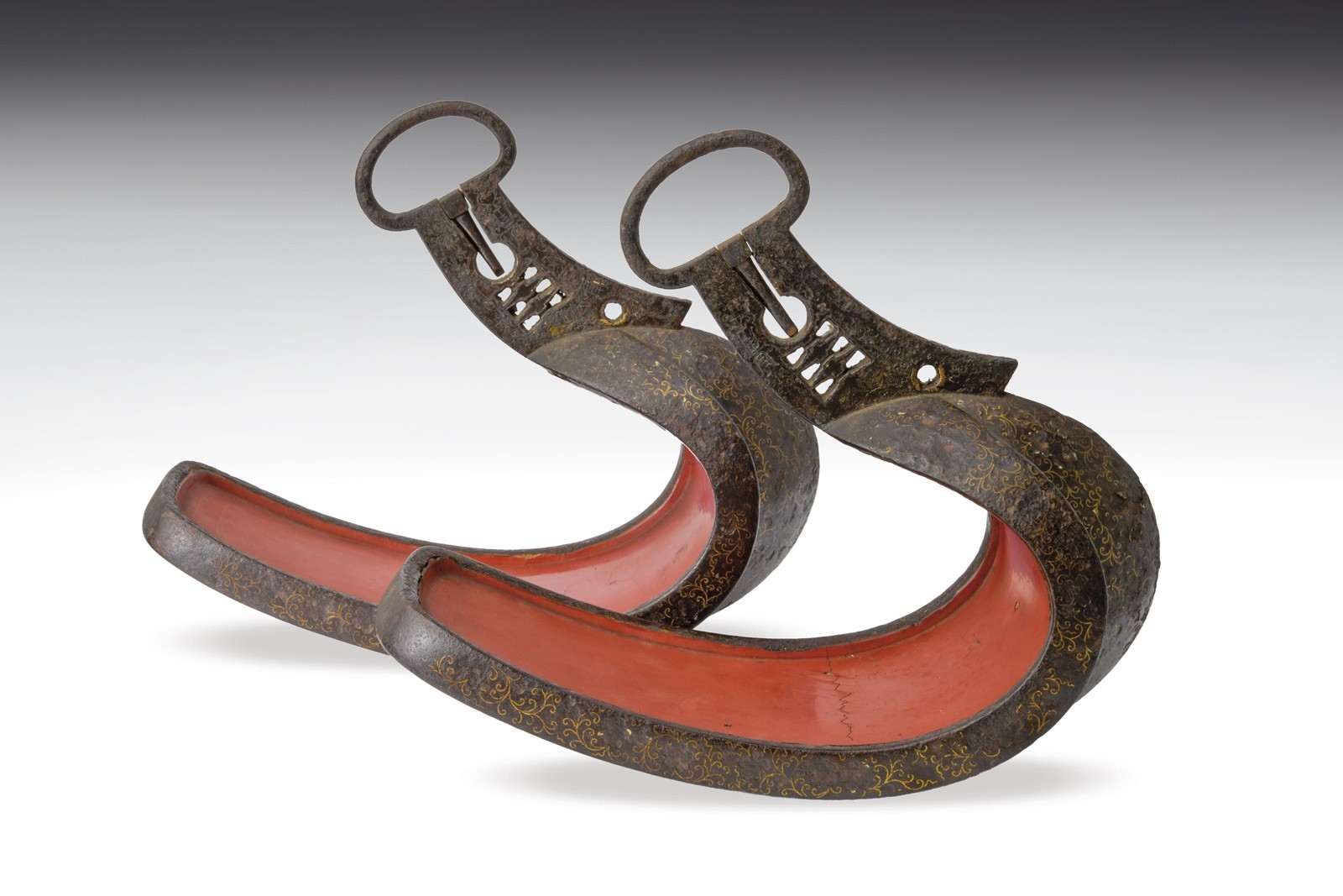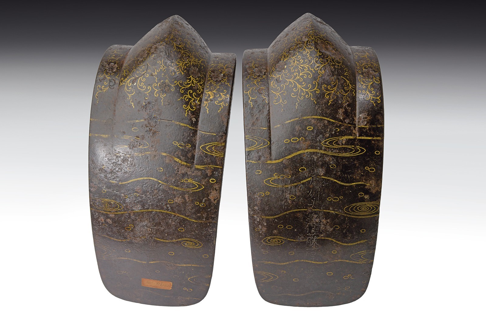 Solid iron structure. Exterior surface with Tetsu-sabiji (rust-black) finishing, decorated with Hana-karakusa (arabesque) motif inlaid in brass. Underside of the treads decorated with brass Ryusui (flowing water) designs. Provided with large suspension buckle eyes mounted on a collar pierced and decorated with the family Mon “Mitsu-Tsutsumi.” Both treads signed on the underside: “Made by Bishu-Ohno-Ju Fujiwara-Shigehisa.” Signs of wear and age. Interior retains most of the red lacquer finish (with small missing and damaged parts). Late Edo period.