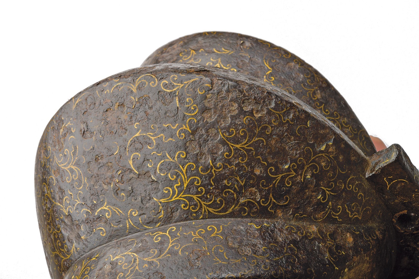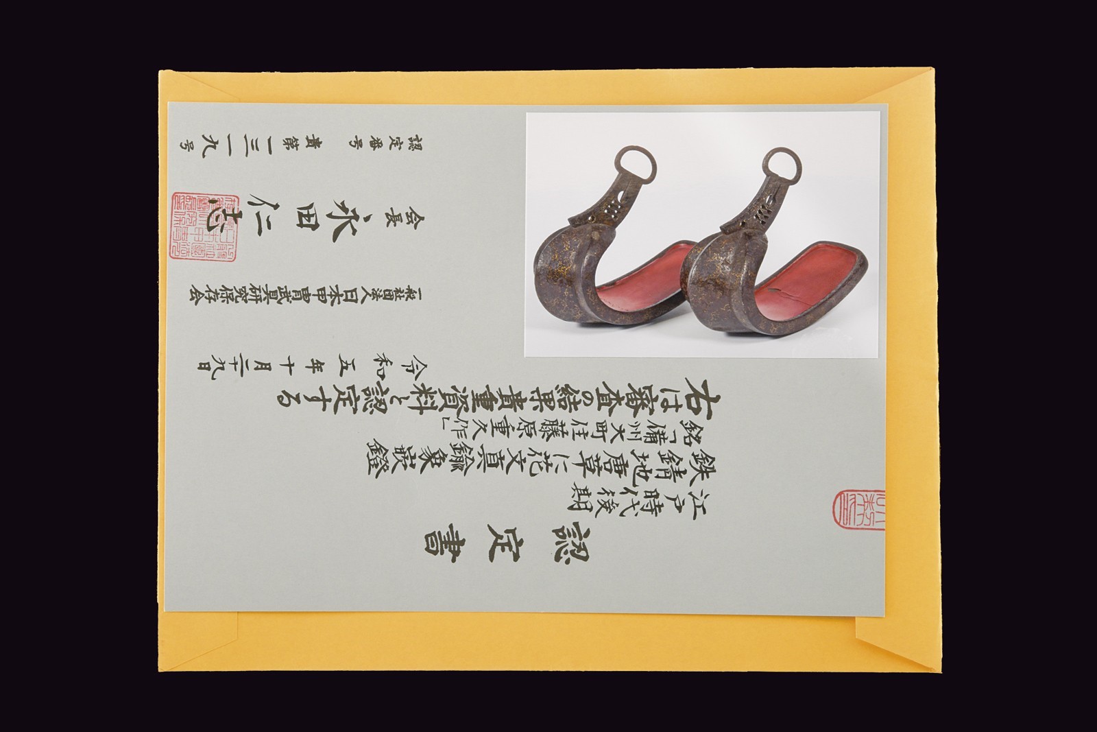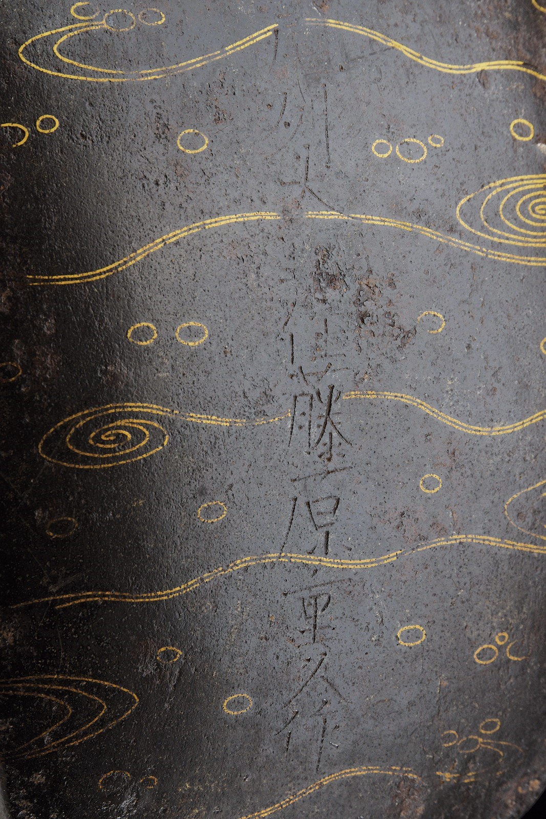 Solid iron structure. Exterior surface with Tetsu-sabiji (rust-black) finishing, decorated with Hana-karakusa (arabesque) motif inlaid in brass. Underside of the treads decorated with brass Ryusui (flowing water) designs. Provided with large suspension buckle eyes mounted on a collar pierced and decorated with the family Mon “Mitsu-Tsutsumi.” Both treads signed on the underside: “Made by Bishu-Ohno-Ju Fujiwara-Shigehisa.” Signs of wear and age. Interior retains most of the red lacquer finish (with small missing and damaged parts). Late Edo period.