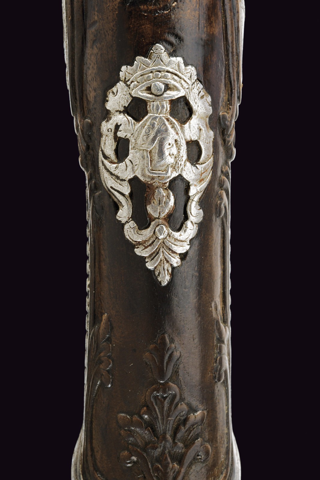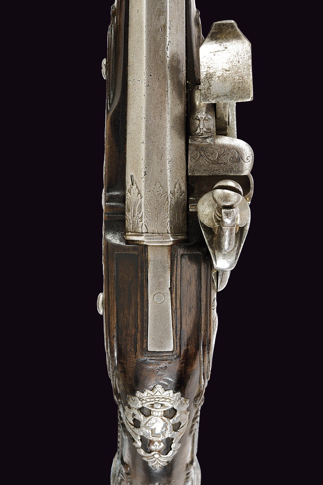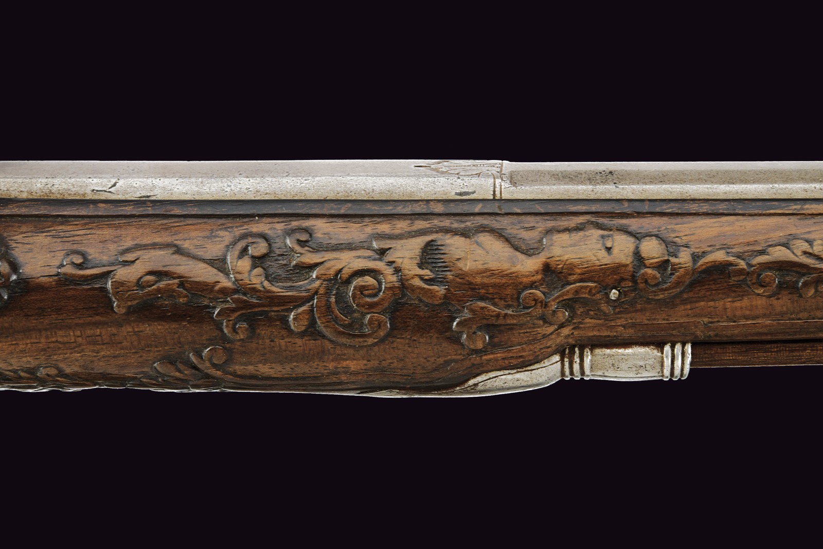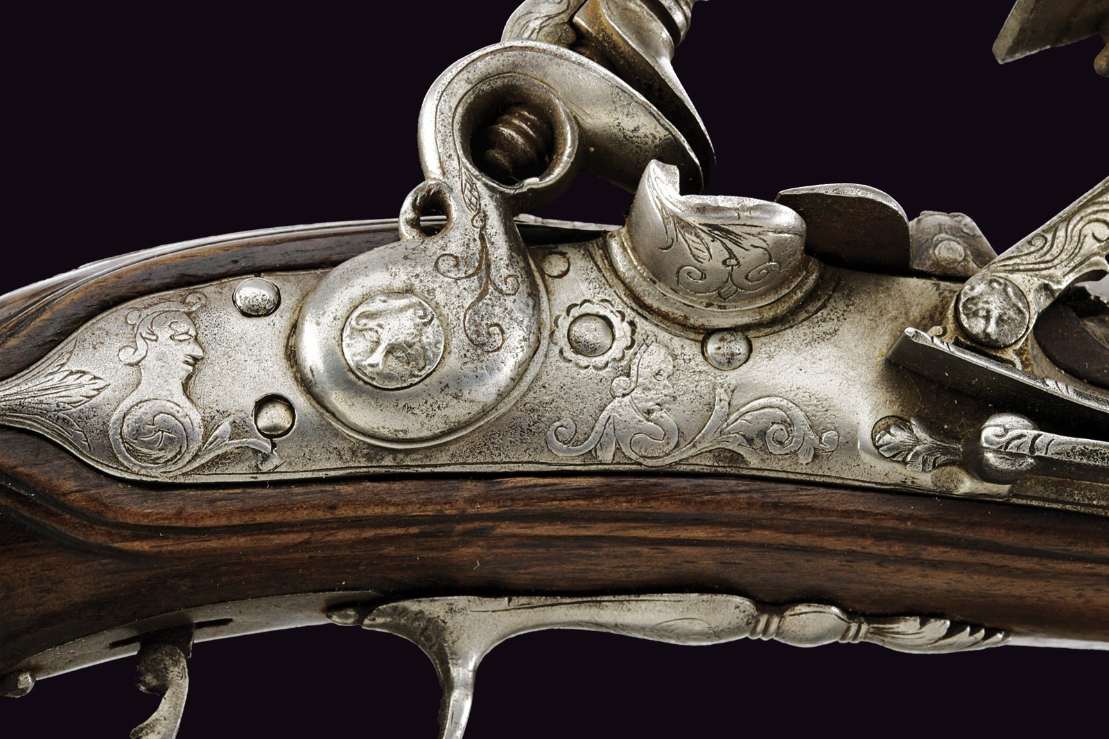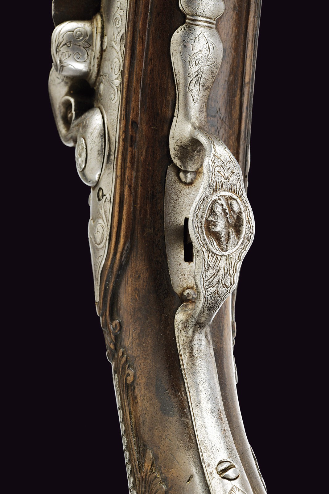 Smoothbore two-stage barrel, square and faceted, with small frames at the breech and foliage engraving; caliber 13 mm. Snaphaunce lock with rounded plate, decorated with engravings of sphinxes and scrolls in bas-relief. The hammer and batterie screw carved in the shape of a mask. Wooden full stock with Anghierese-style carvings. Iron mounts, a badge on the back and counterplate exposed and chiseled with figures and profiles. Carved and engraved volute stock. Dark-horn-tipped wooden ramrod with iron cartridge extractor.