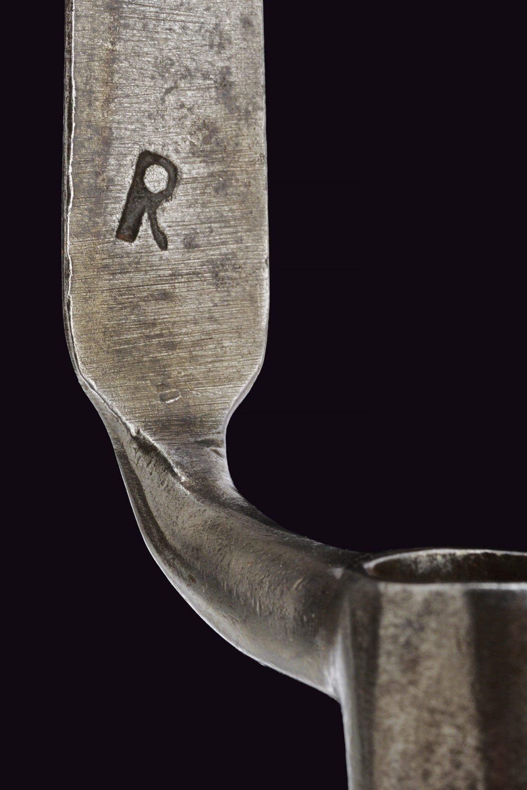 Blade of triangular section, with flat base, featuring a deep "R" mark at the base and grooved at the weak. Complete with leather scabbard with iron mounts and hook.