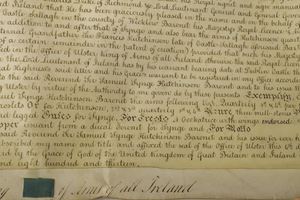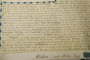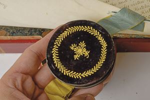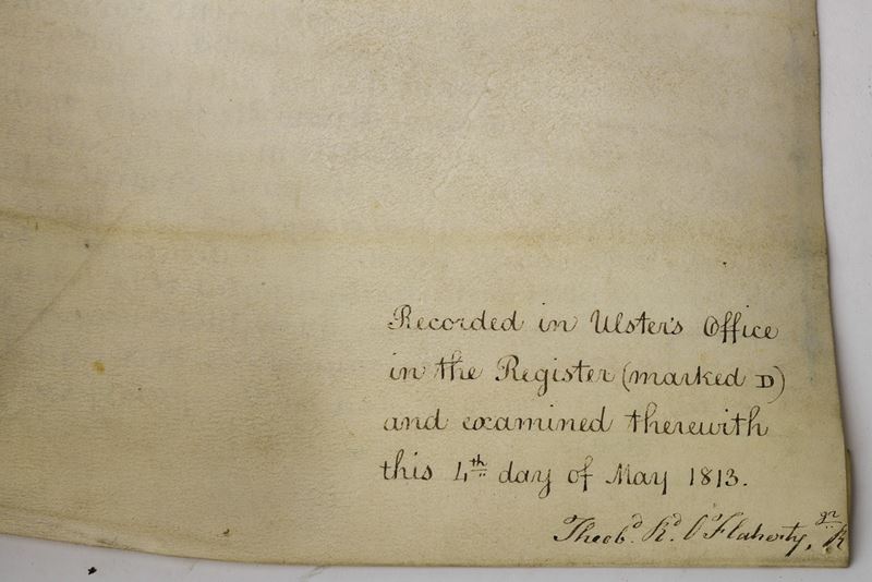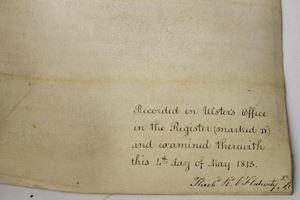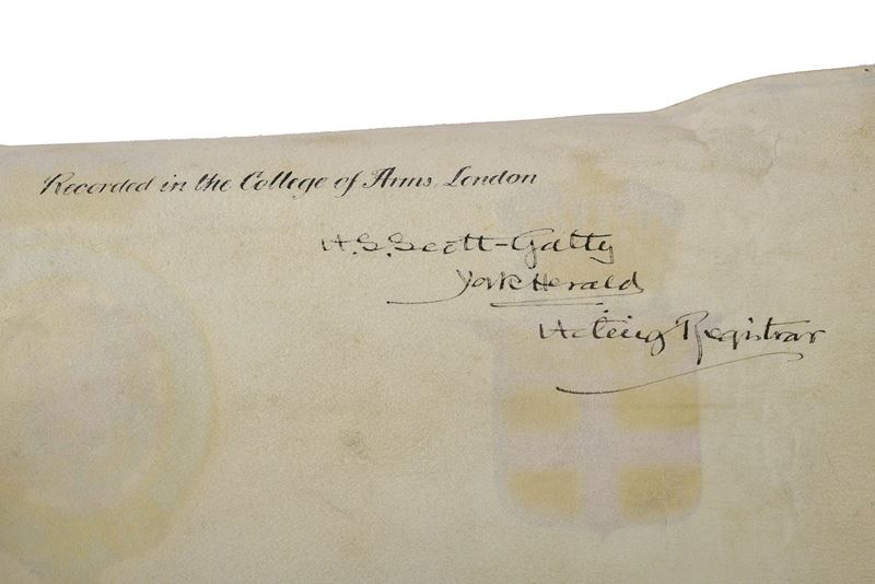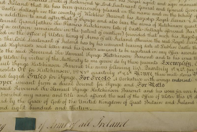 Manuscript vellum with calligraphic text and four polychrome painted coats of arms. The document, dated 1813, bears the signature of Ulster King of Arms Sir William Betham, recording the grant of arms to the Hutchinson-Synge family. Attached to the document is a single pendant seal in a protective skippet, suspended from a blue ribbon. In a wooden case covered in red Morocco leather, with gold inlays and the monogram “GR” (King George).