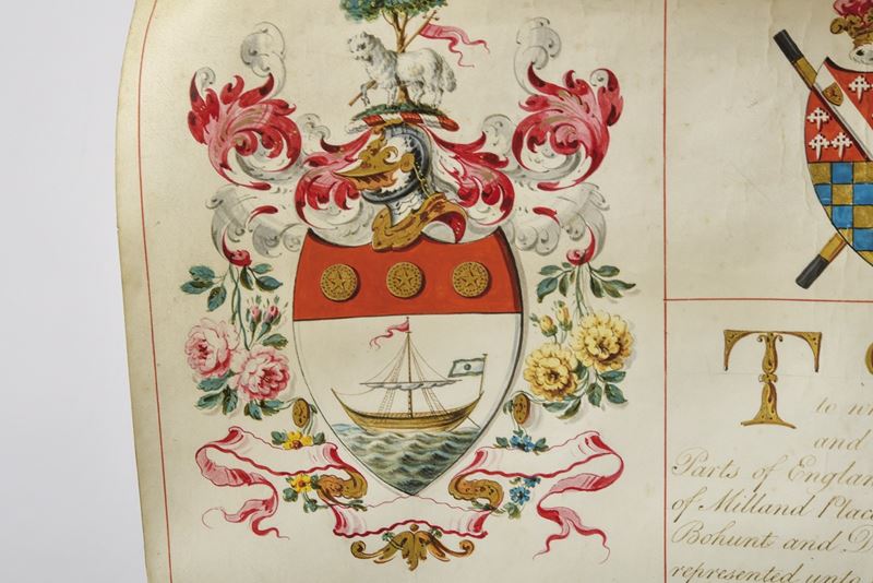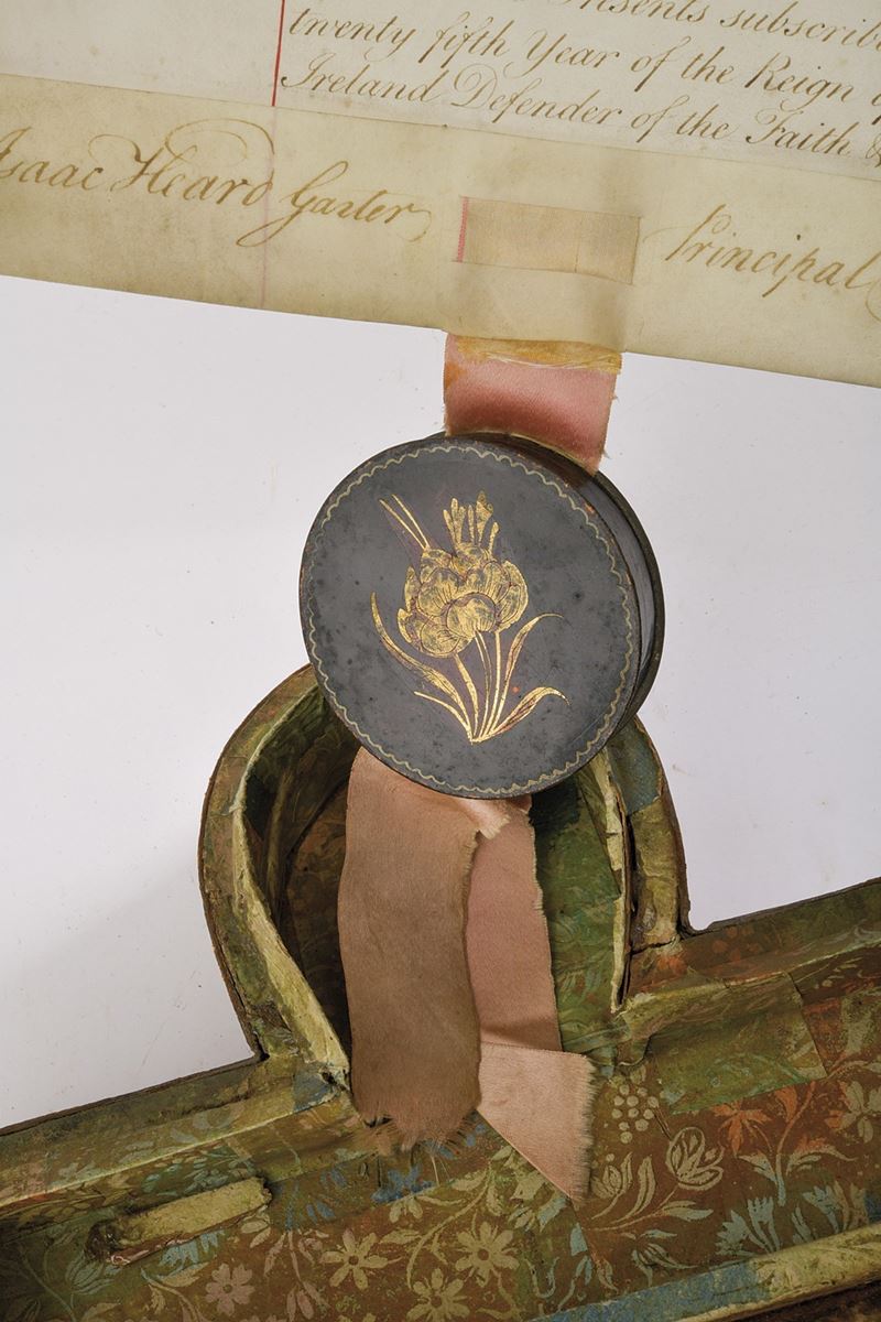 Manuscript vellum with calligraphic text and four polychrome painted coats of arms. The document, dated 1785, bears the signatures of Garter Principal King of Arms Sir Isaac Heard and Clarenceux King of Arms Sir Thomas Lock, recording the grant of arms to John and James Utterson and their descendants. Two pendant seals in protective cases, attached with a pink ribbon, are provided with the document. Housed in a wooden case covered in brown leather with gilt tooling; small signs of use and time.