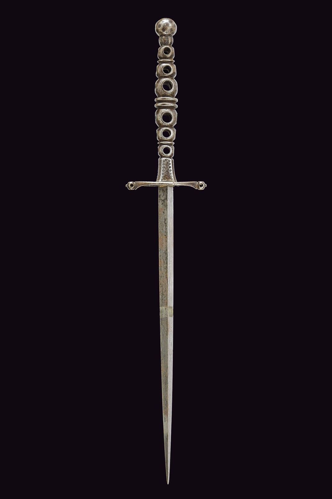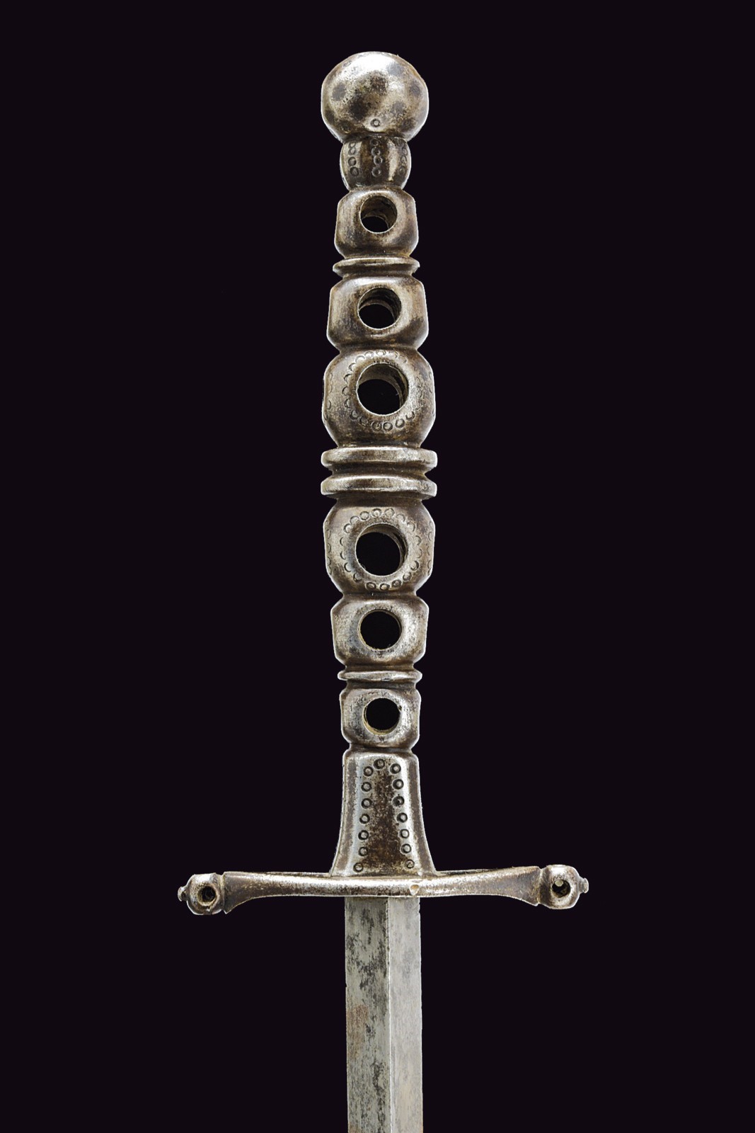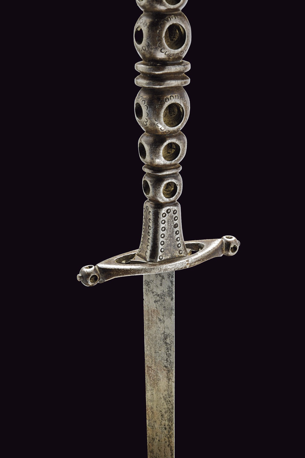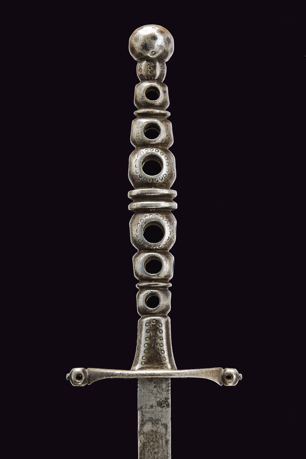 Sturdy, straight blade of triangular section. Elliptical iron quillon, with the central surface partially fretworked, the ends with spherical heads pierced on four sides and buttoned at the top. Mirror-image iron grip, with a small flattened tower in the centre dividing three spherical elements on each side; these spheres are partially engraved and pierced in the same style as the quillon heads. Pommel and ring nut in one piece with the grip; the former is spherical and decorated with engravings featuring very few remains of silver inlays.