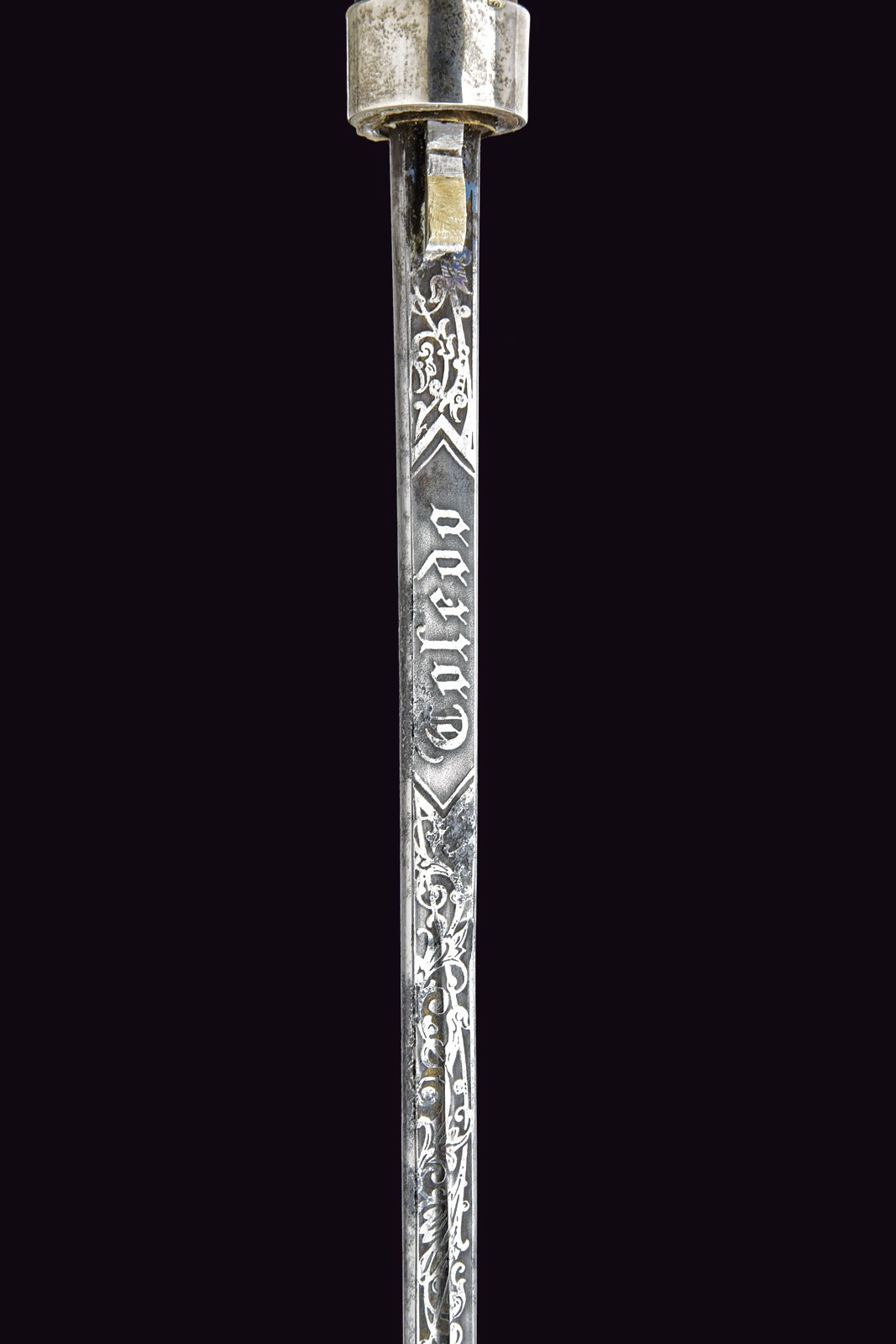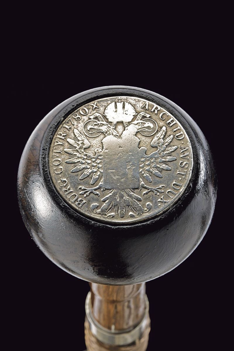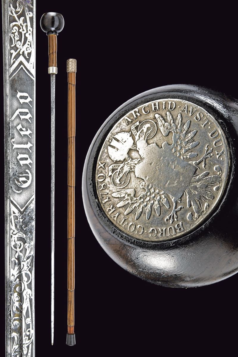 Straight, single-and-false-edged blade, grooved, marked "Toledo" and engraved with floral motifs. Bamboo grip with silver ring nut. Wooden pommel, inlaid at the top with the portrait of Maria Theresa with the inscription "R. IMP. HU. BO. REG. M. THERESIA D. G." on the edge and the engraver's monogram "S.F.". Bamboo shaft with brass tip.