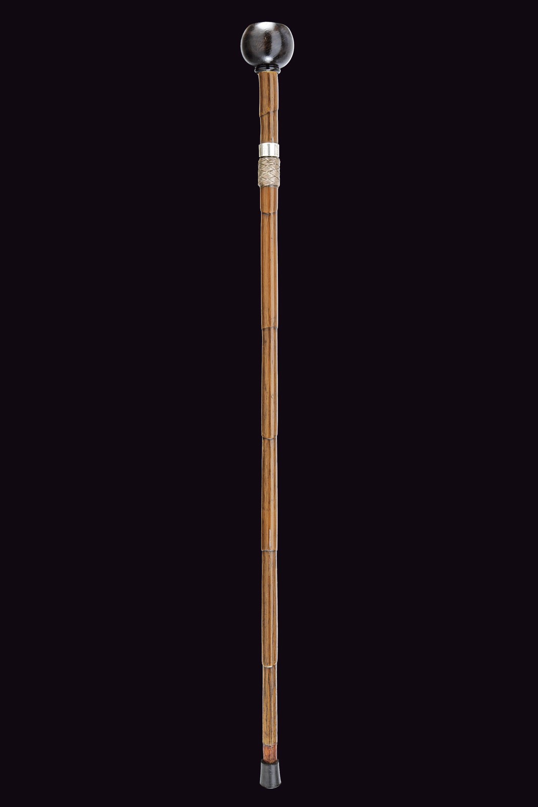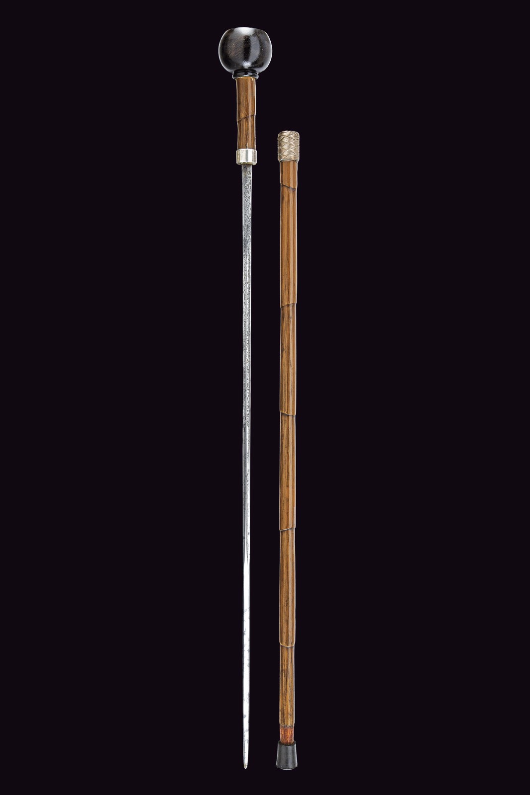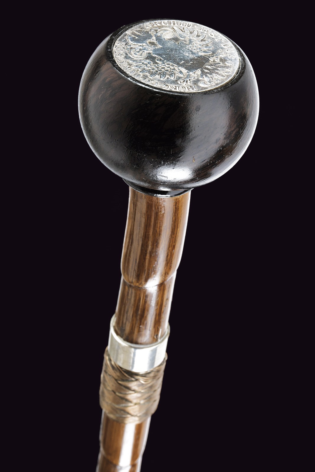 Straight, single-and-false-edged blade, grooved, marked "Toledo" and engraved with floral motifs. Bamboo grip with silver ring nut. Wooden pommel, inlaid at the top with the portrait of Maria Theresa with the inscription "R. IMP. HU. BO. REG. M. THERESIA D. G." on the edge and the engraver's monogram "S.F.". Bamboo shaft with brass tip.