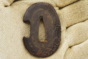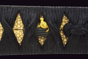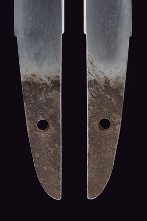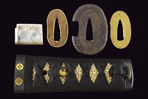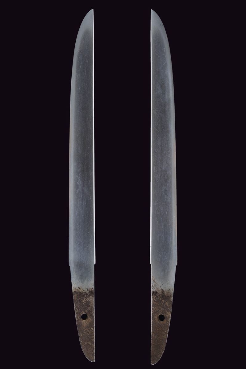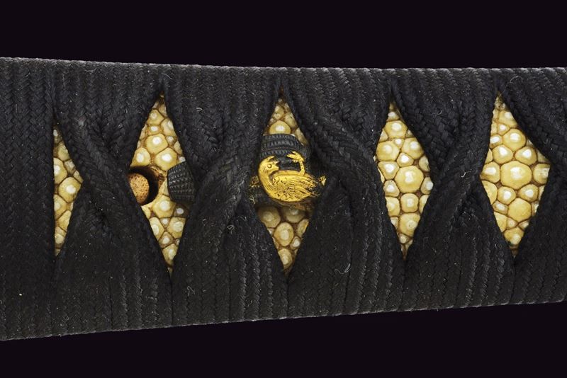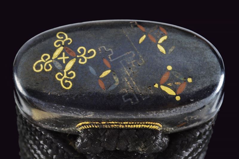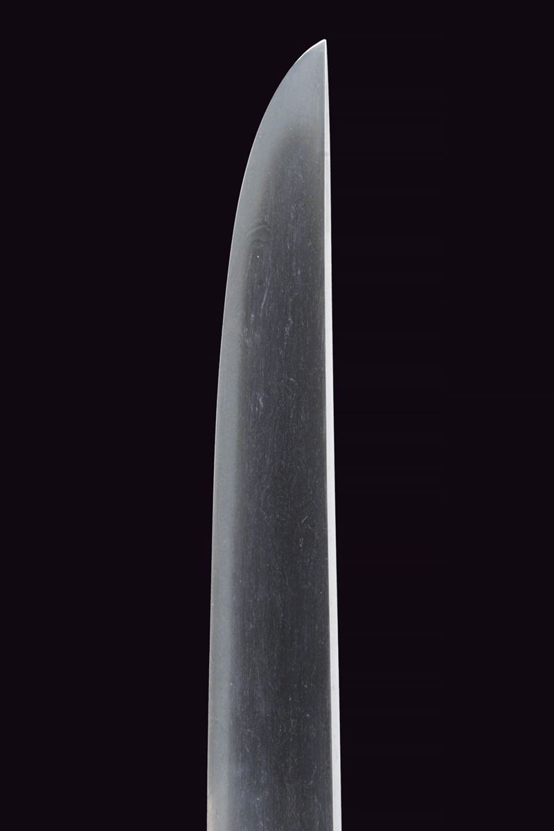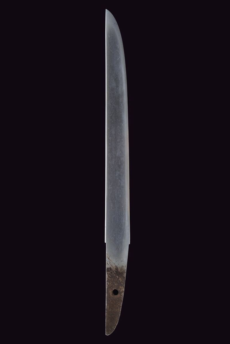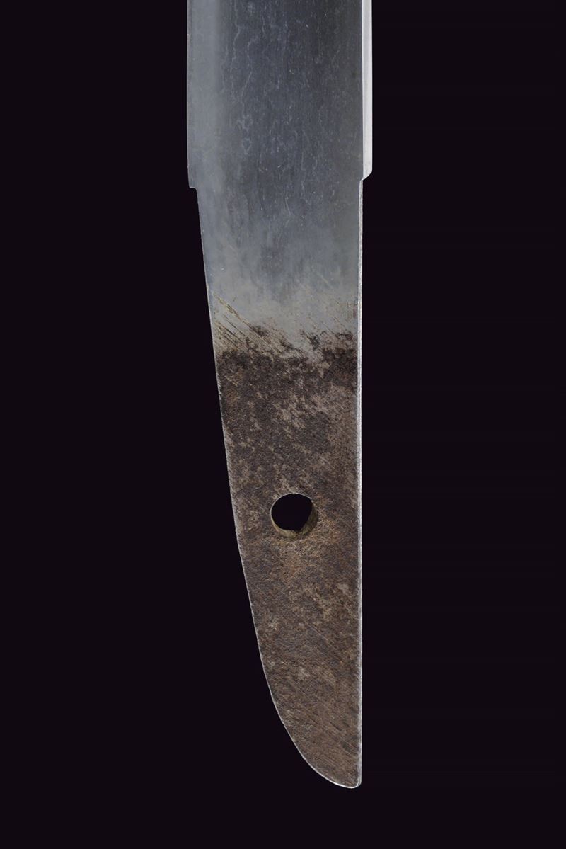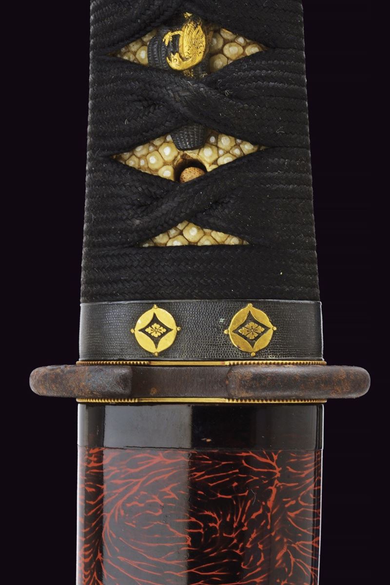 Hira-zukuri blade, Iori-mune (Nagasa 24 cm). Visible Hamon and Hada. Nakago with a Mekugi-ana. Mumei. Habaki with silver foil coating. In 19th-century koshirae with iron Tsuba with seaweed carvings. Fuchi and Kashira, made of burnished copper, inlaid with Shippu (cloisonné) motif, the former with a grained background, the latter smooth. Tsuka with Samè in stingray leather. Tsuka-ito in black fabric (later?). Menuki in copper depicting Kakuni-uzura (quail on a basket). Saya with an unusual vermilion lacquer coating called “Isokusa-nuri,” depicting a motif of seaweed floating in the sea, a very laborious lacquering technique. Sageo in moss-green fabric. Edo period.