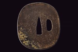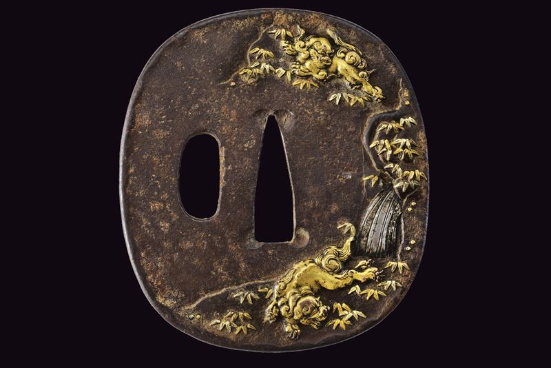 Made of iron, tate-maru-gata, copper niku-bori, gold and silver depicting Shishi lions near a waterfall, kozuka hitsu-ana. In kiri box. Late Edo period.