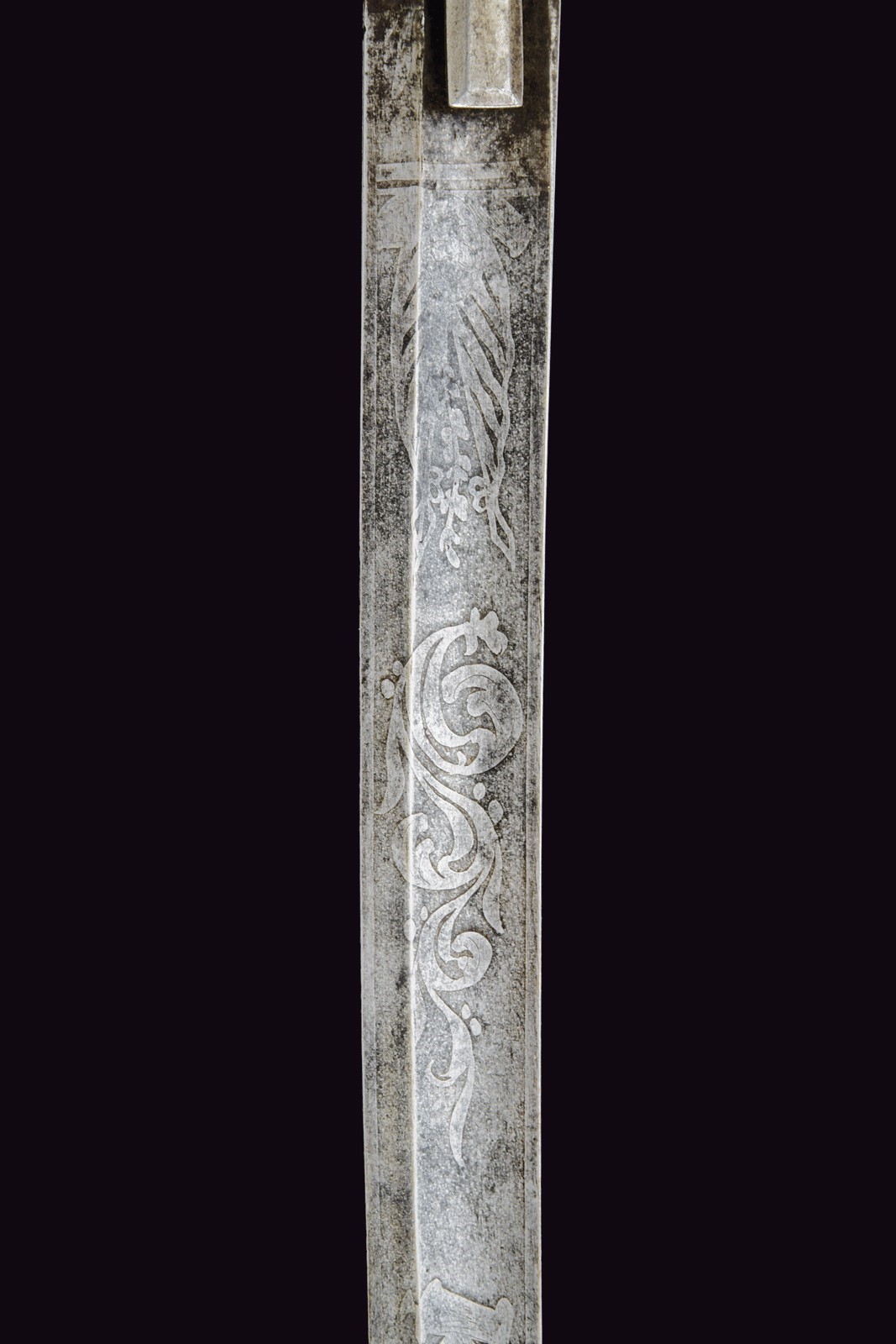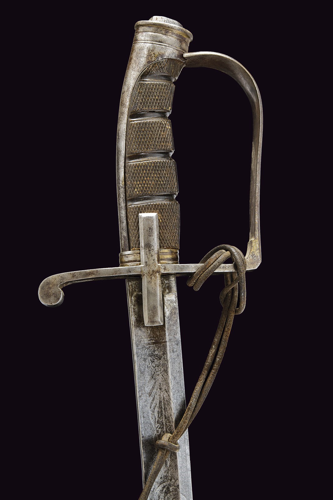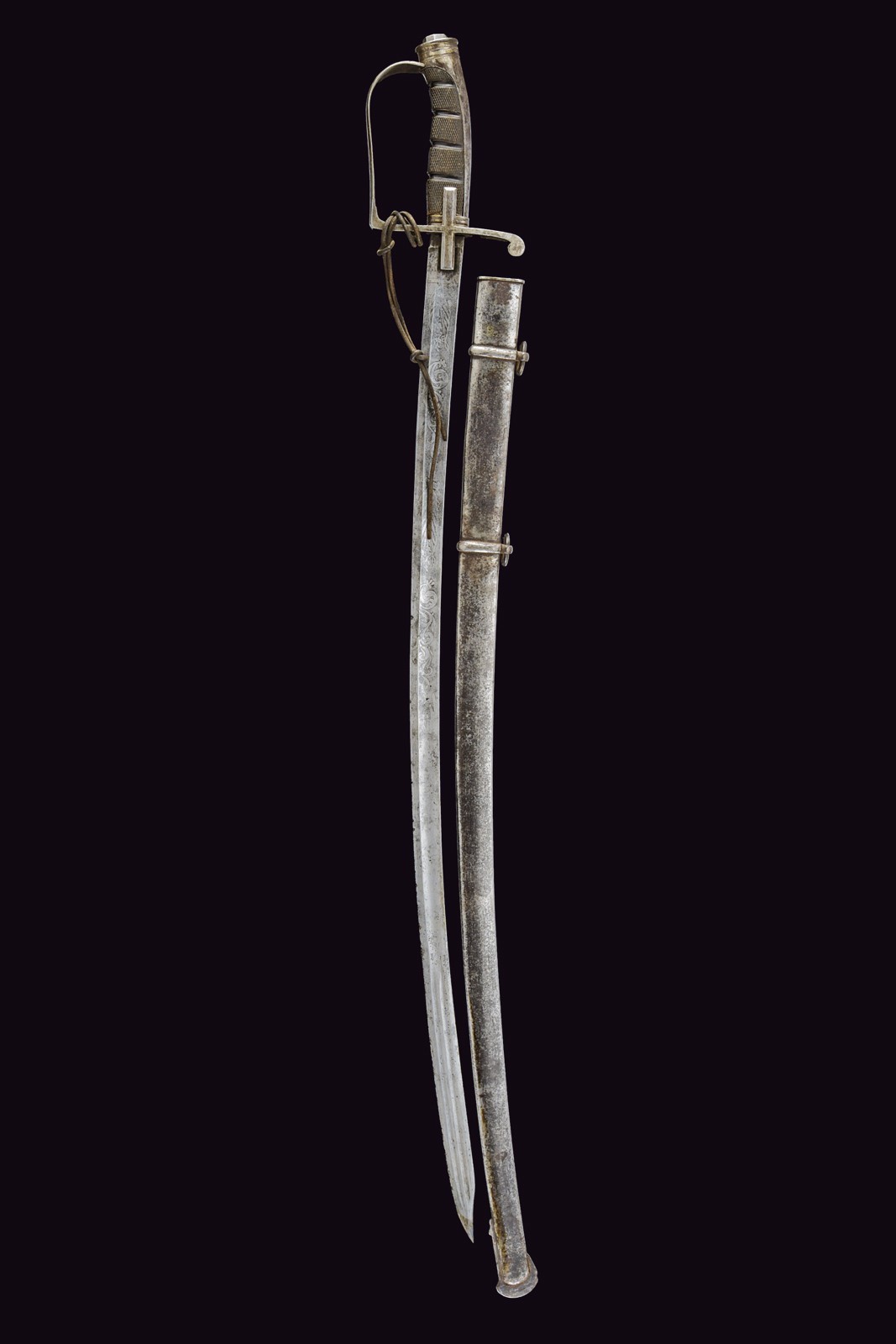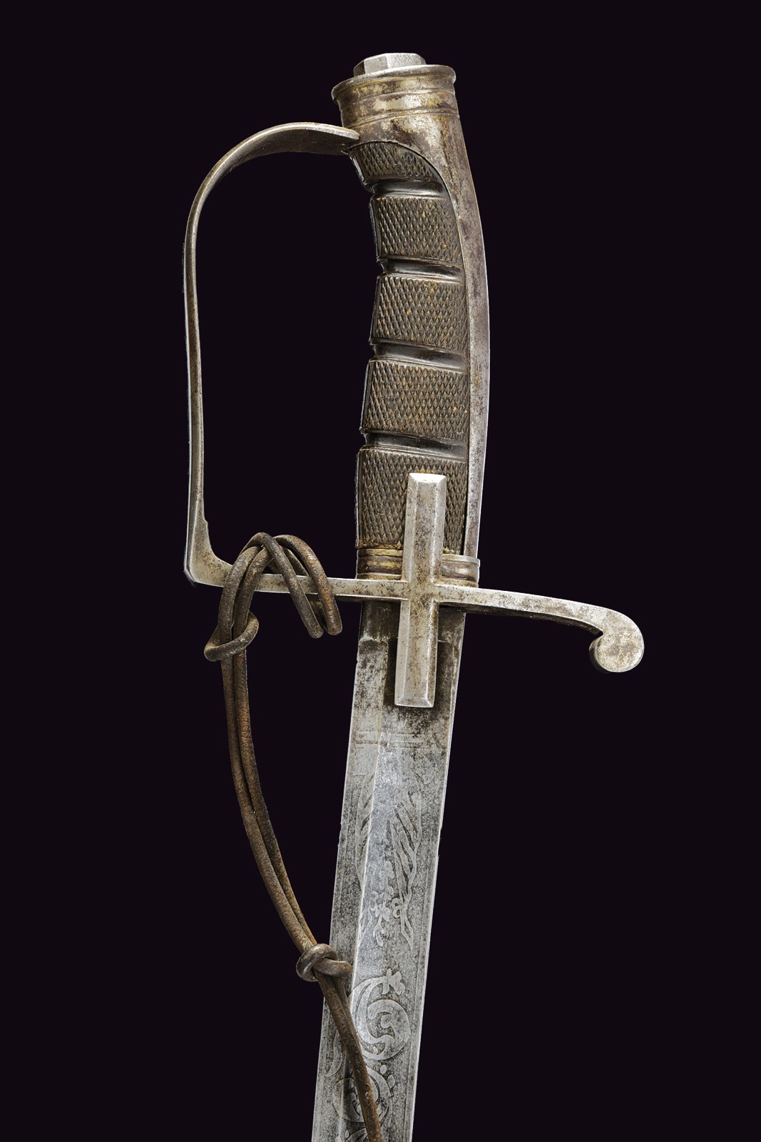 Curved, tipped, singl-and false-edged blade, with double fuller at the weak, etched with scroll and trophy motifs, typical hilt with stirrup guard and langets. Cap with octagonal button. Knurled horn handle. Iron scabbard with chape and two bands with lugs.