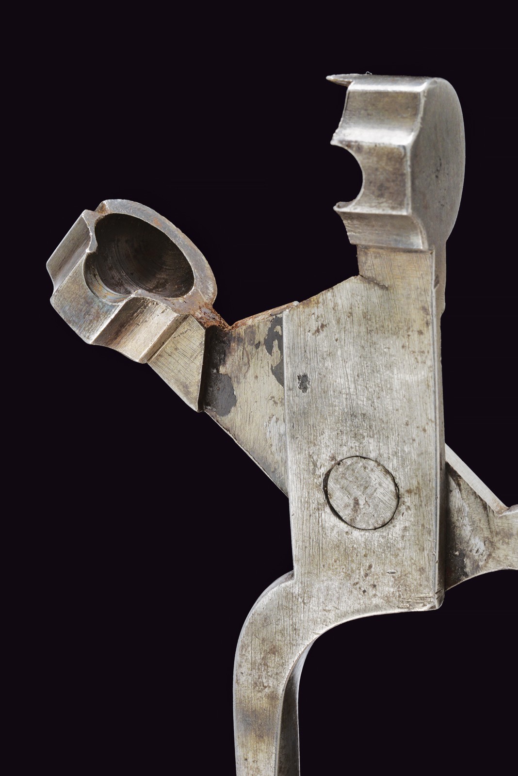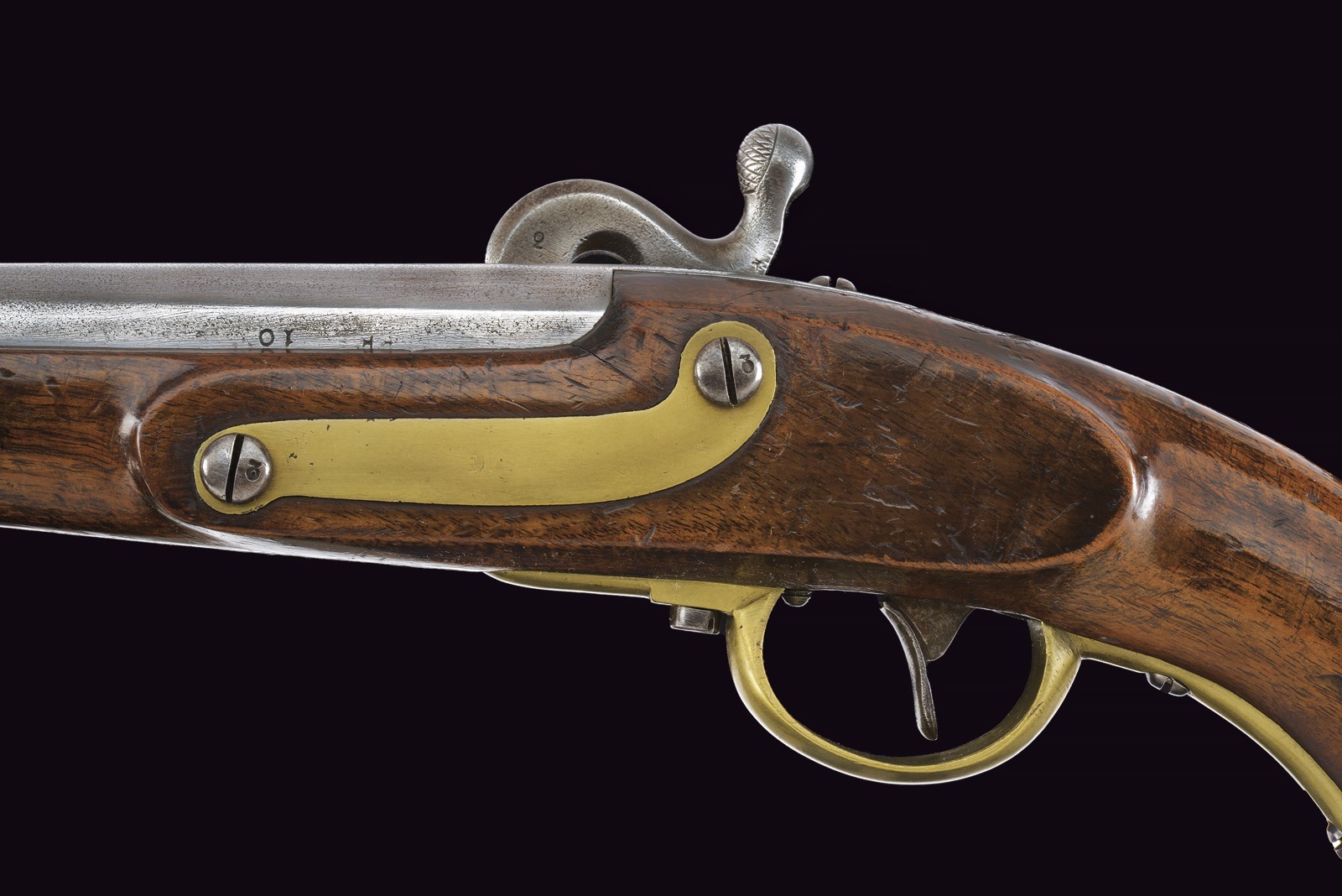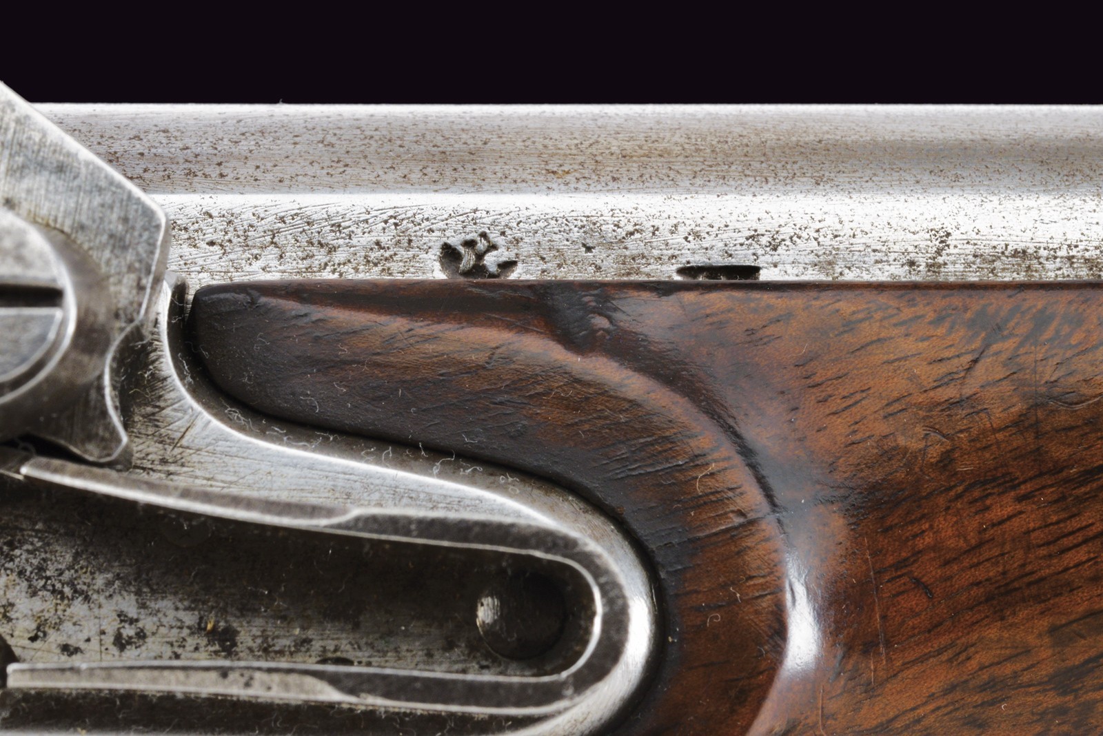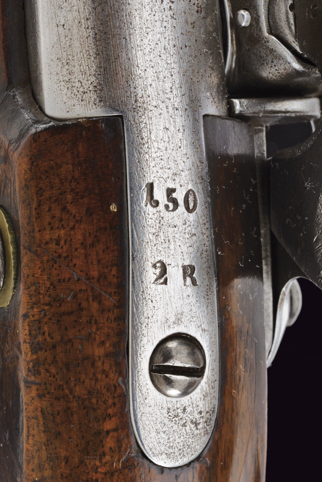 Smoothbore, round, 17 mm cal. barrel, square at the base marked "FERD FRUHWIRTH", "FF", "10" and featuring the imperial mark, foresight on the muzzle ring; rounded tang marked "150 2 R". Augustin-system lock dated "850" and featuring a double eagle, working mechanism with double-set triggers. Wooden full stock with brass mounts. This type of pistol was manufactured for only one year. Together with the bullet mold.