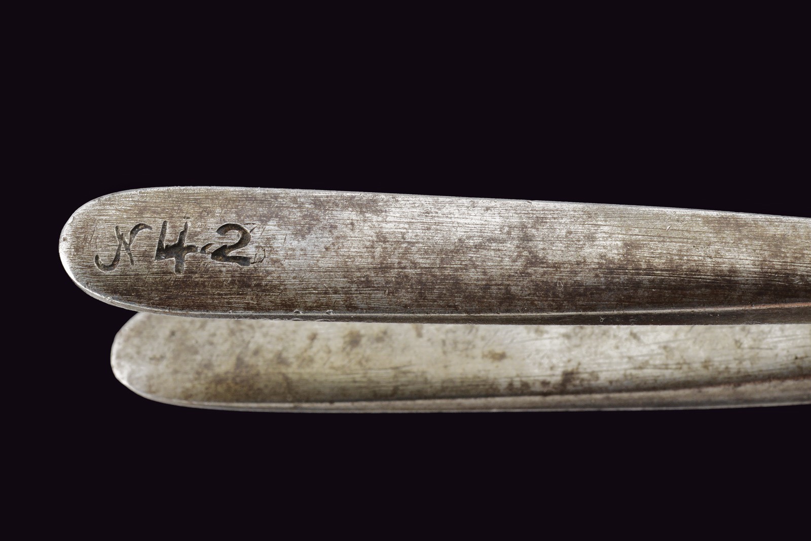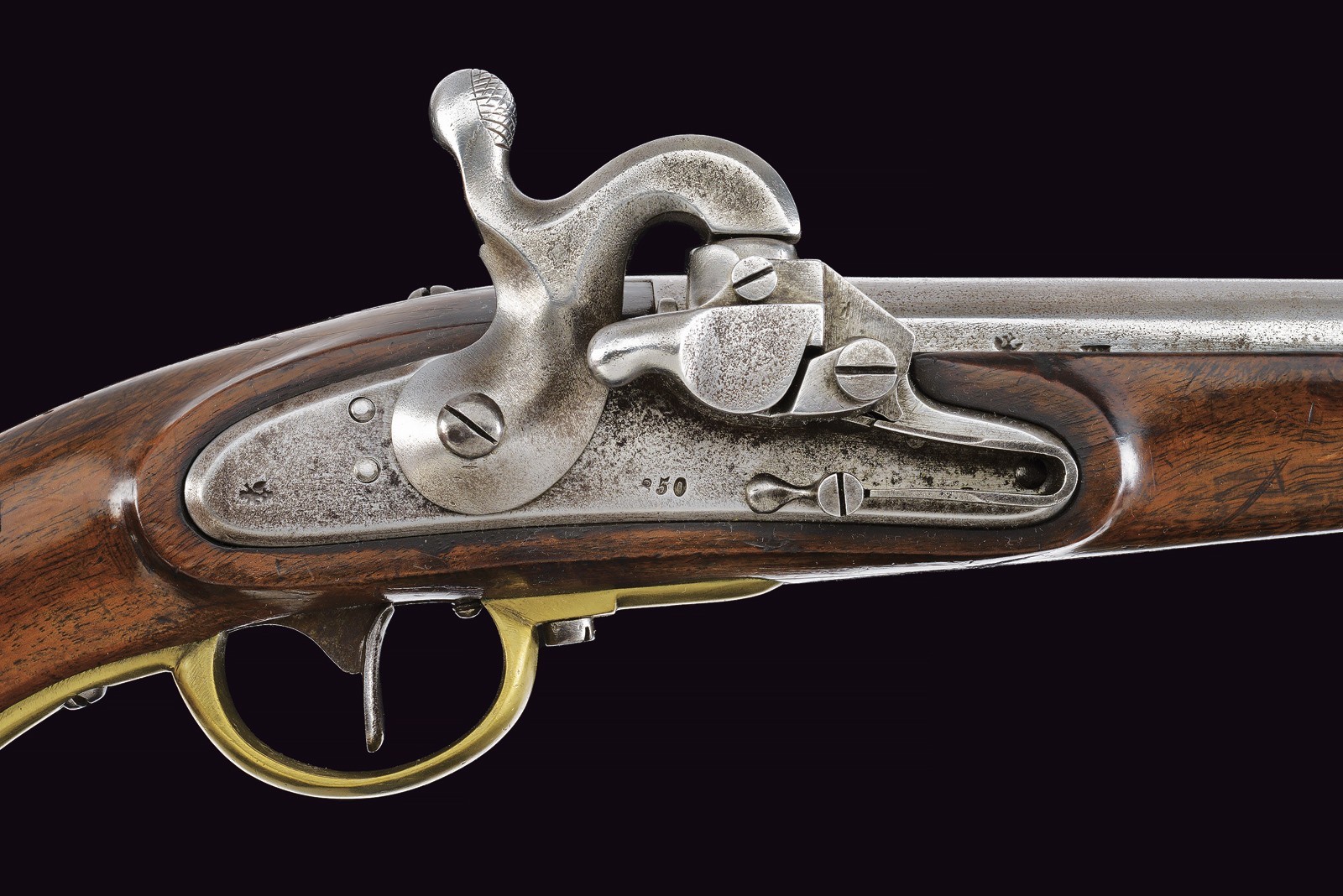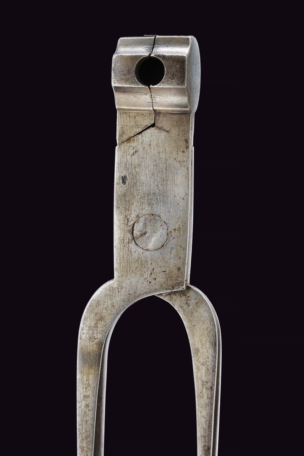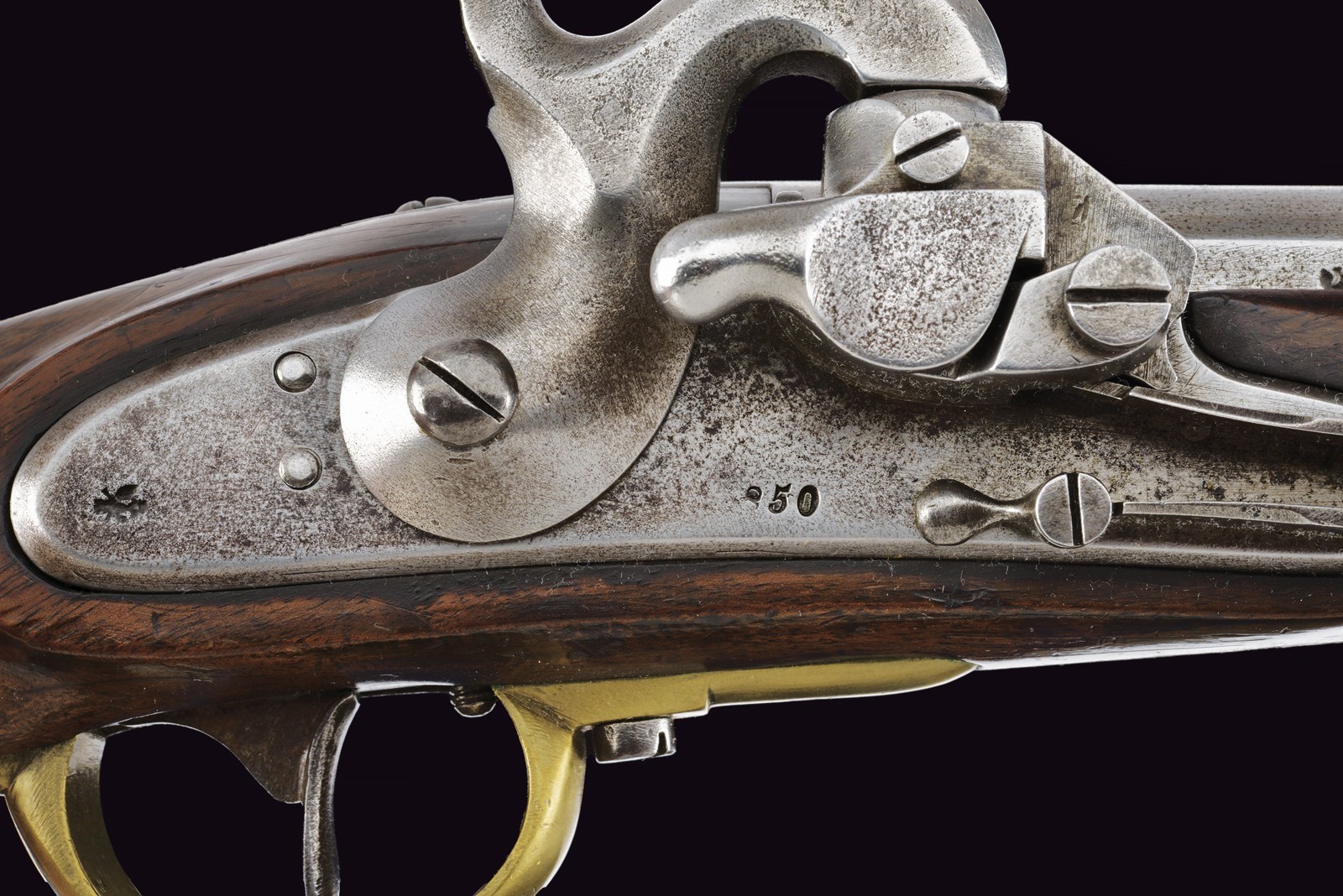 Smoothbore, round, 17 mm cal. barrel, square at the base marked "FERD FRUHWIRTH", "FF", "10" and featuring the imperial mark, foresight on the muzzle ring; rounded tang marked "150 2 R". Augustin-system lock dated "850" and featuring a double eagle, working mechanism with double-set triggers. Wooden full stock with brass mounts. This type of pistol was manufactured for only one year. Together with the bullet mold.