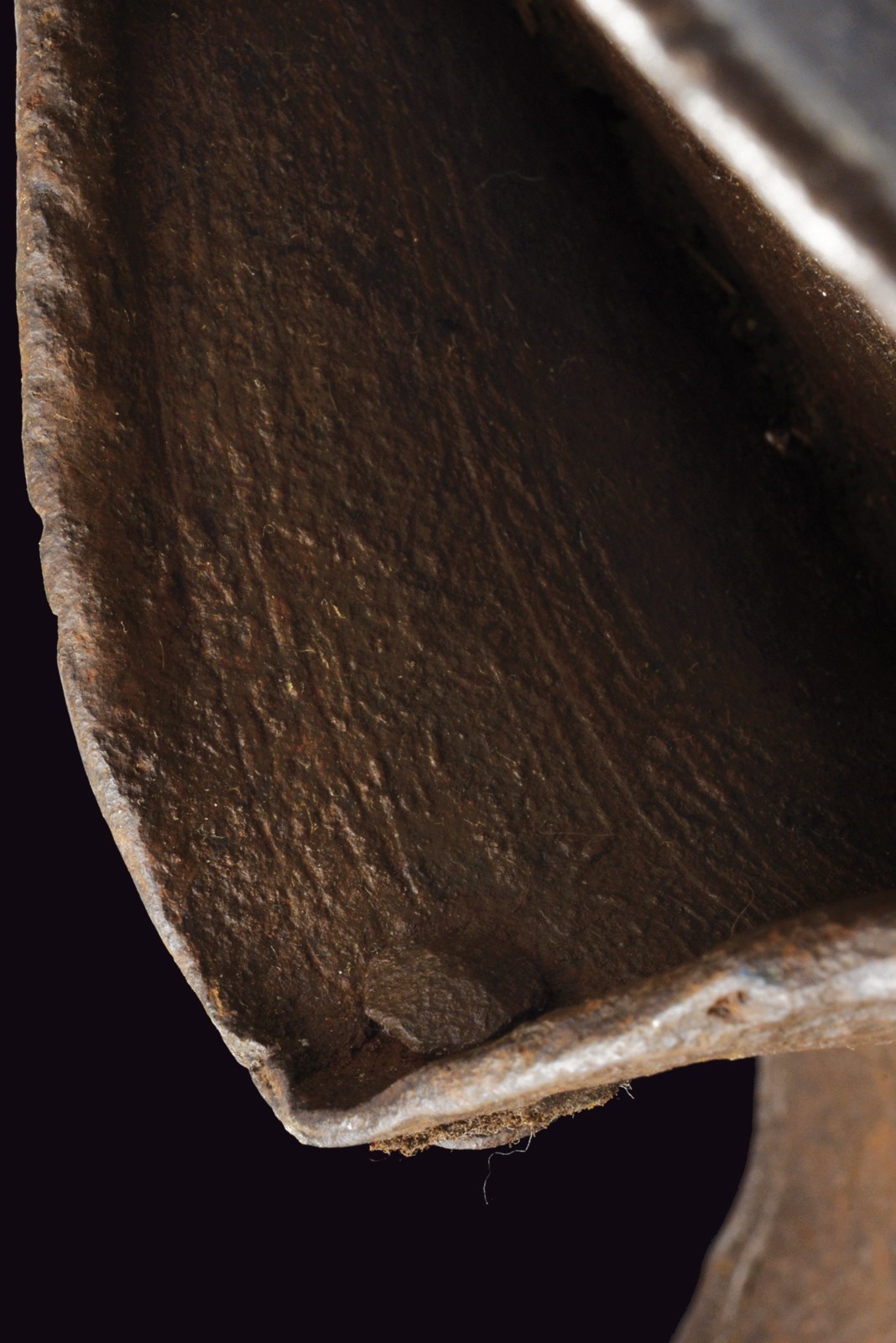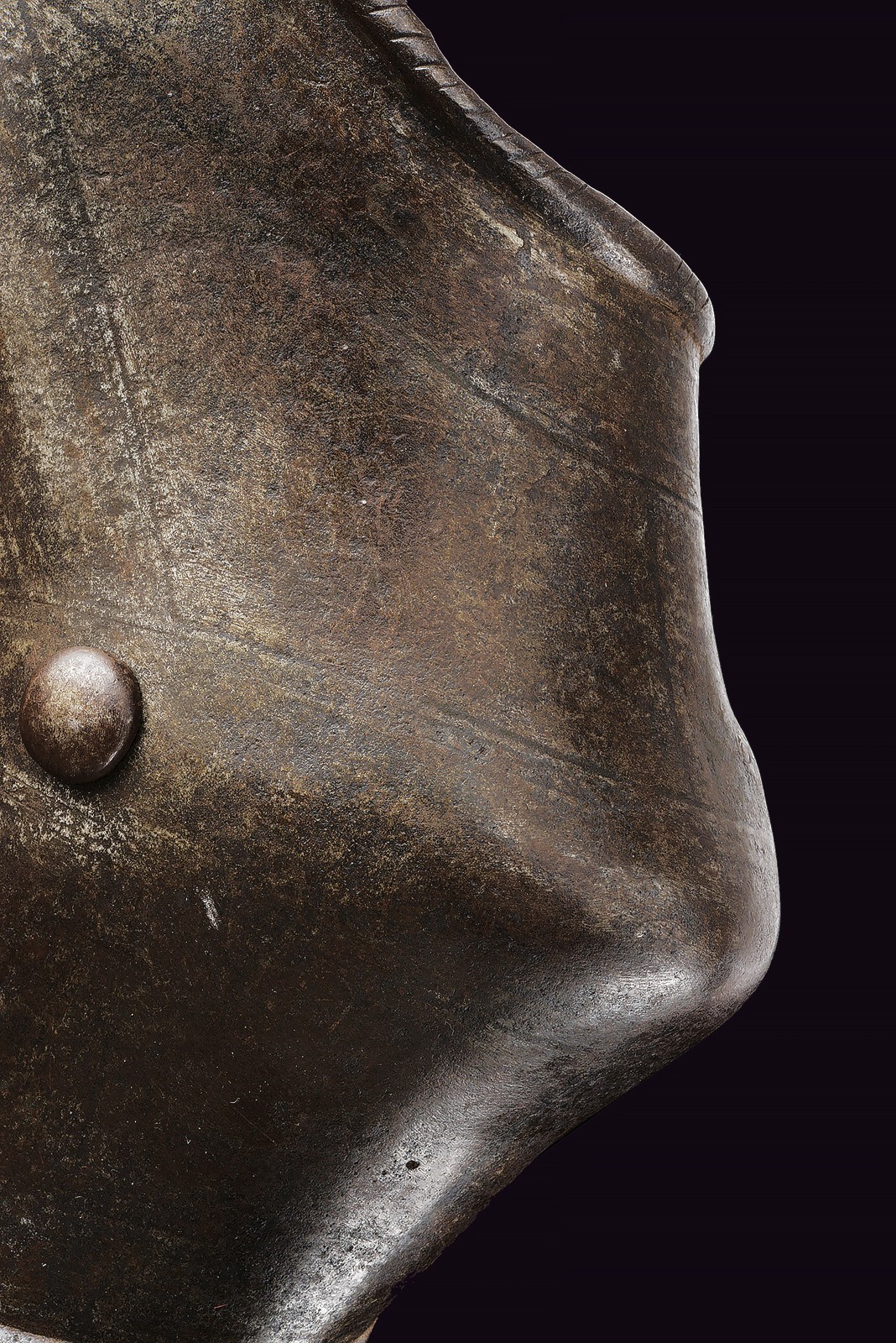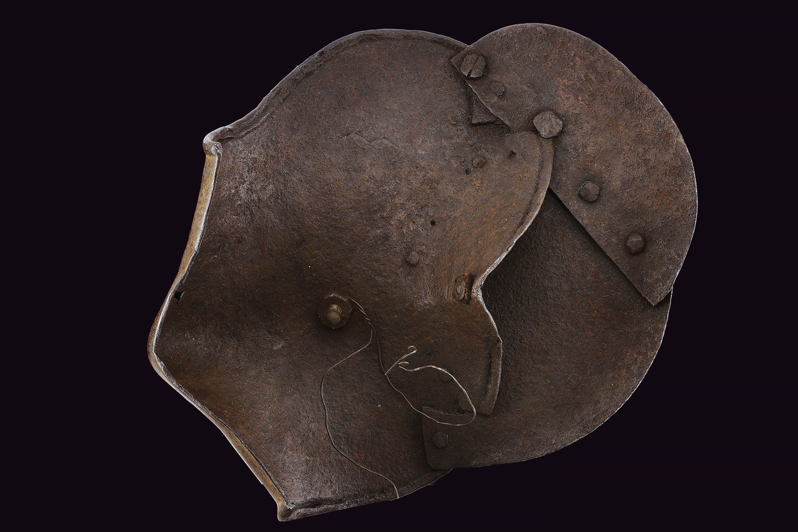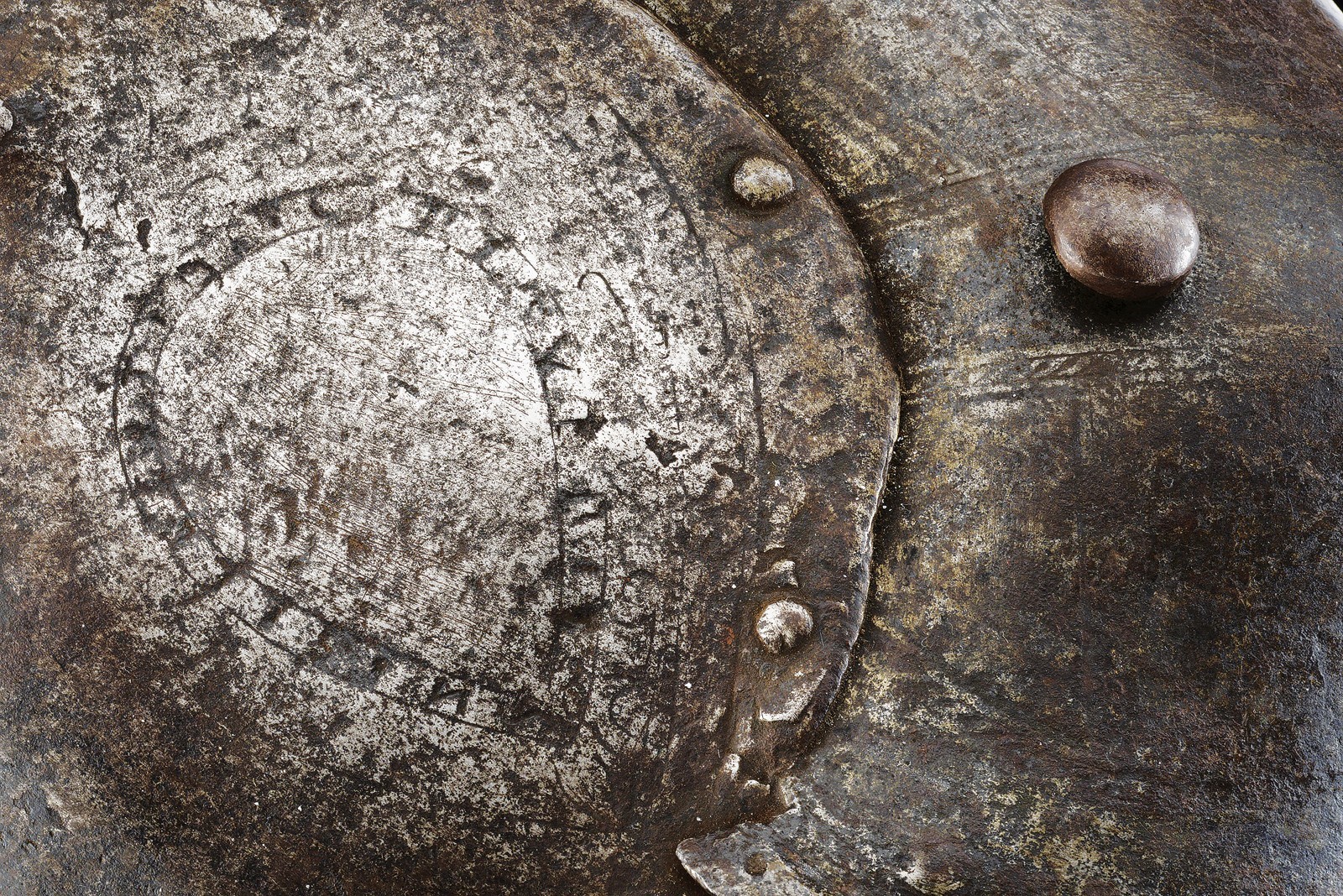 Made of heavy iron, with a twisted edge, well shaped to protect the elbow. Featuring remains of banded engravings and an almond-shaped cartouche with a histrion on the edges that is not clearly legible. Complete with its fastening bolt.