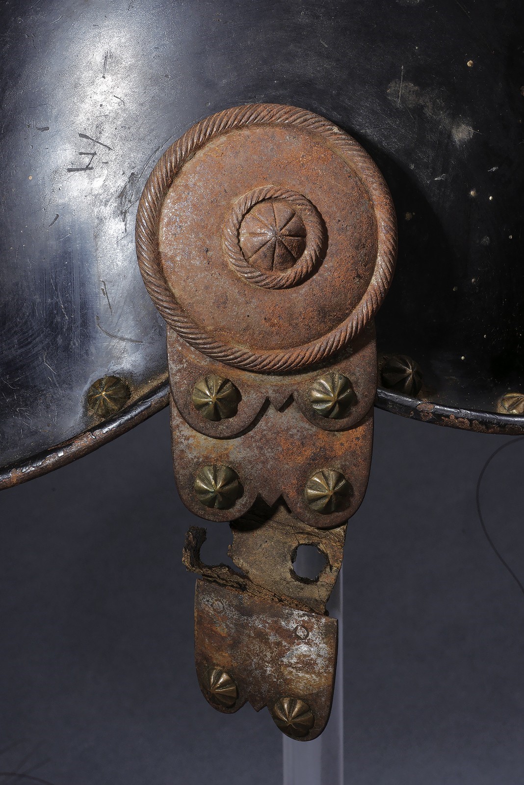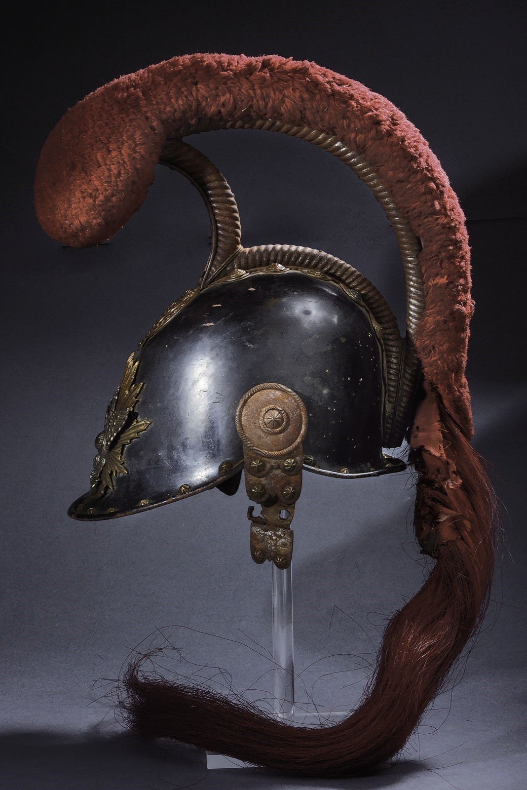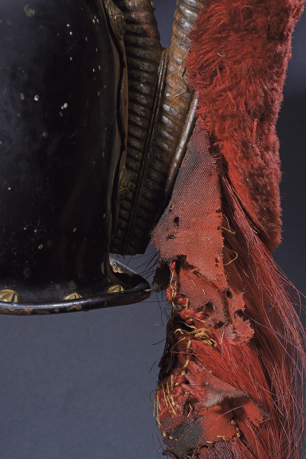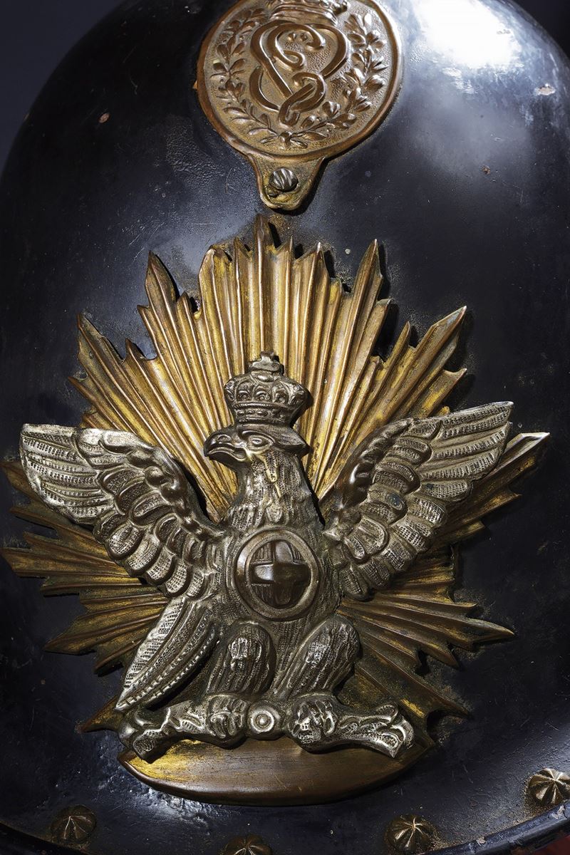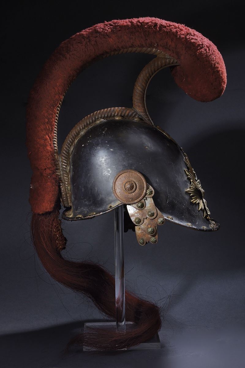 Skull made of hammered steel, painted in black (with some minor losses), internally marked “1 . 7;” featuring visor and brim with rounded edges and a series of bronze rosettes (one external and two internal missing), carved in segments. Iron, openwork crest with twisted design featuring rosettes at the base (one missing) and an olive bearing the royal monogram “VE” (Vittorio Emanuele II), original red chenille with iron mount and matching red horsehair tail. Sunburst-style frontplate with silver-spread eagle. Few scales of the iron neck guard remaining, also decorated with rosettes; cheek guards in iron with knurled rings and segmented centers. Iron elements show signs of rust. Lacking interior, with minimal remnants of leather on some rosettes. A highly interesting helmet with antique patina.