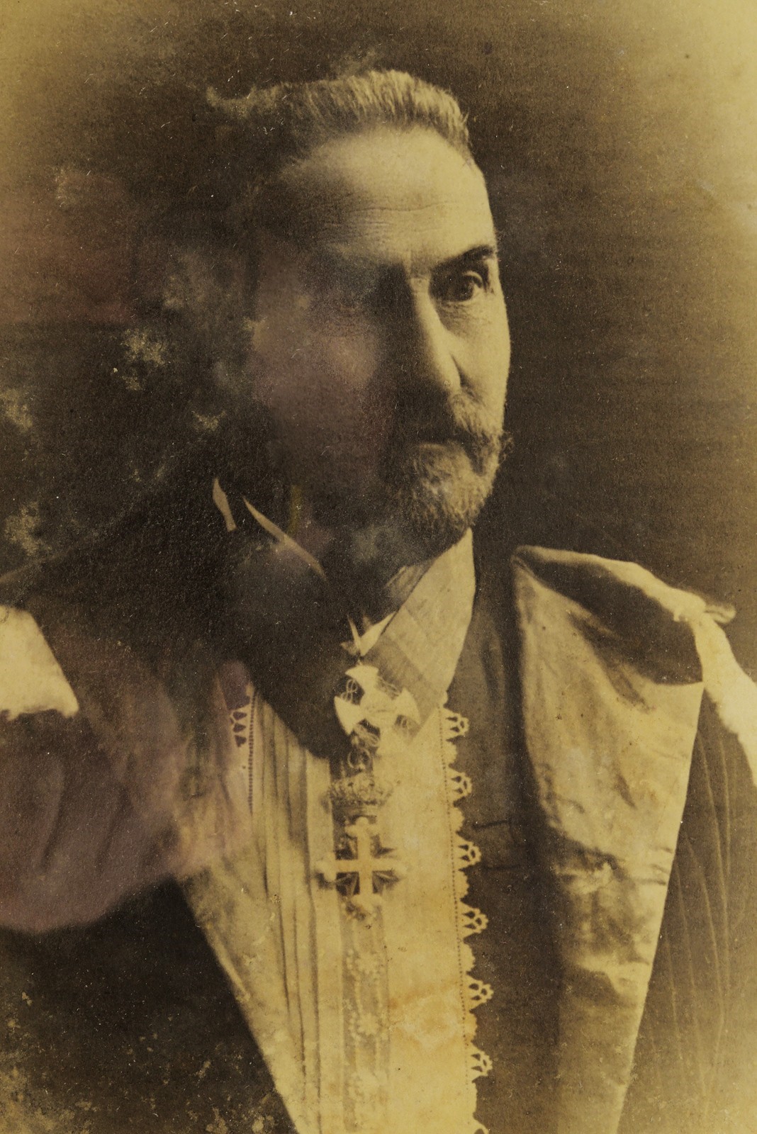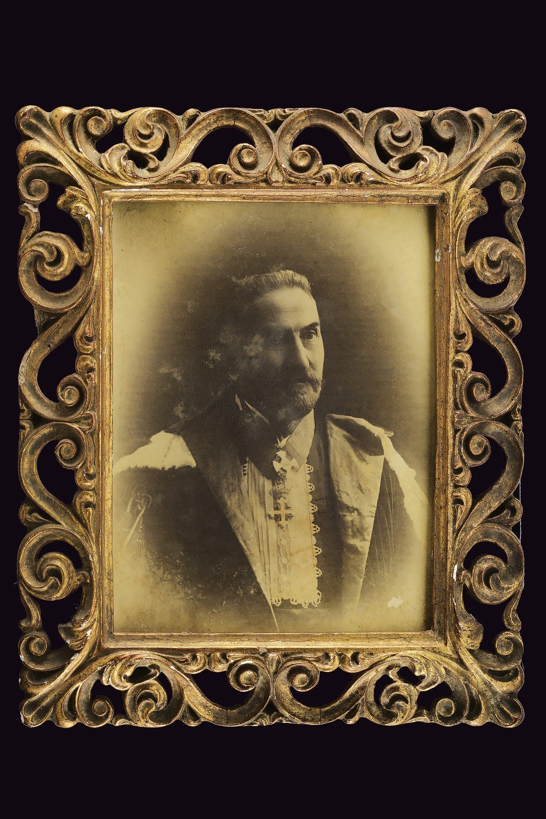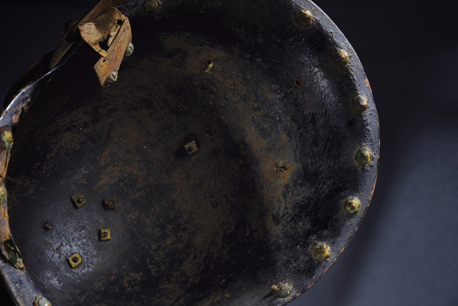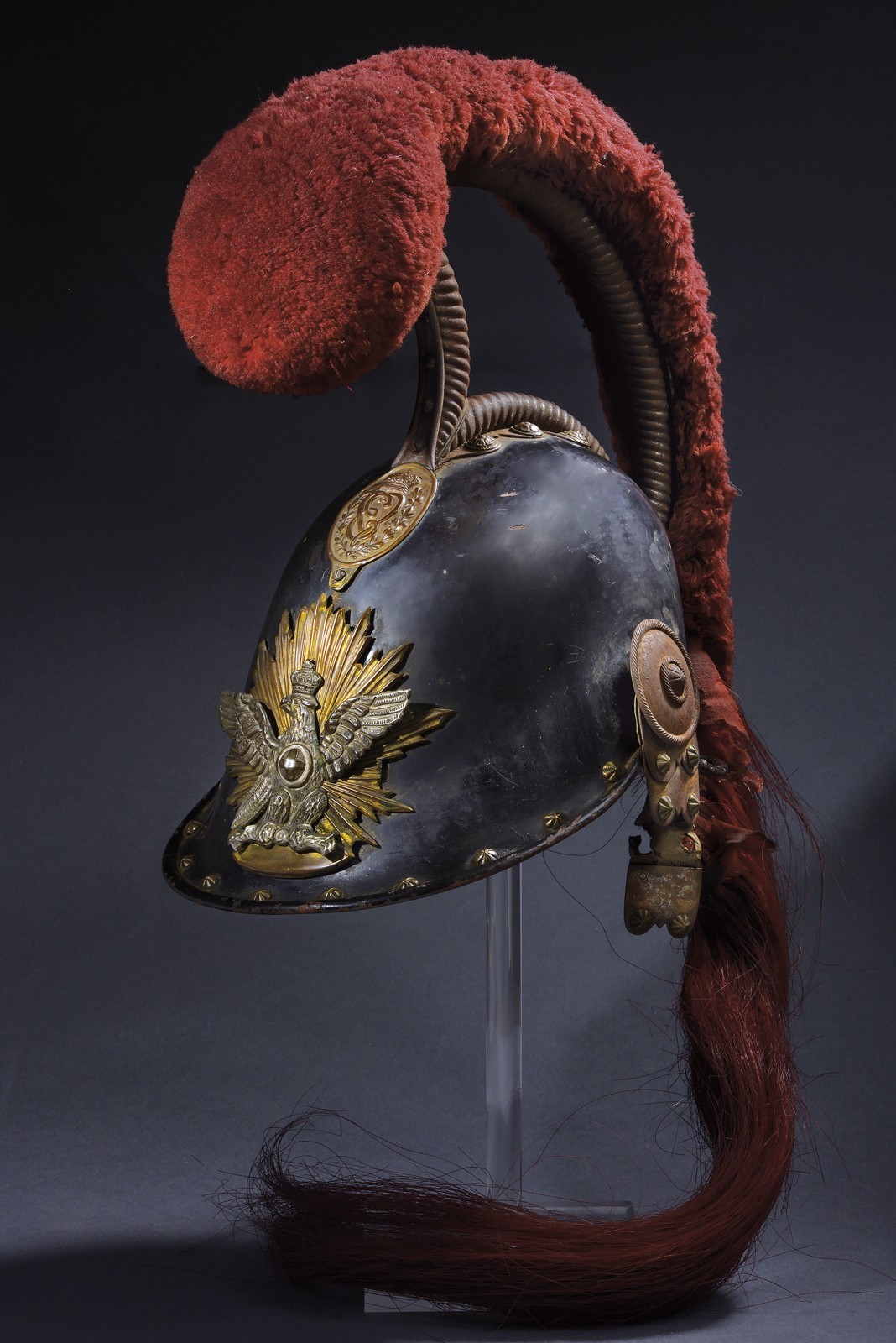 Skull made of hammered steel, painted in black (with some minor losses), internally marked “1 . 7;” featuring visor and brim with rounded edges and a series of bronze rosettes (one external and two internal missing), carved in segments. Iron, openwork crest with twisted design featuring rosettes at the base (one missing) and an olive bearing the royal monogram “VE” (Vittorio Emanuele II), original red chenille with iron mount and matching red horsehair tail. Sunburst-style frontplate with silver-spread eagle. Few scales of the iron neck guard remaining, also decorated with rosettes; cheek guards in iron with knurled rings and segmented centers. Iron elements show signs of rust. Lacking interior, with minimal remnants of leather on some rosettes. A highly interesting helmet with antique patina.