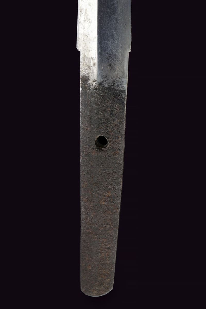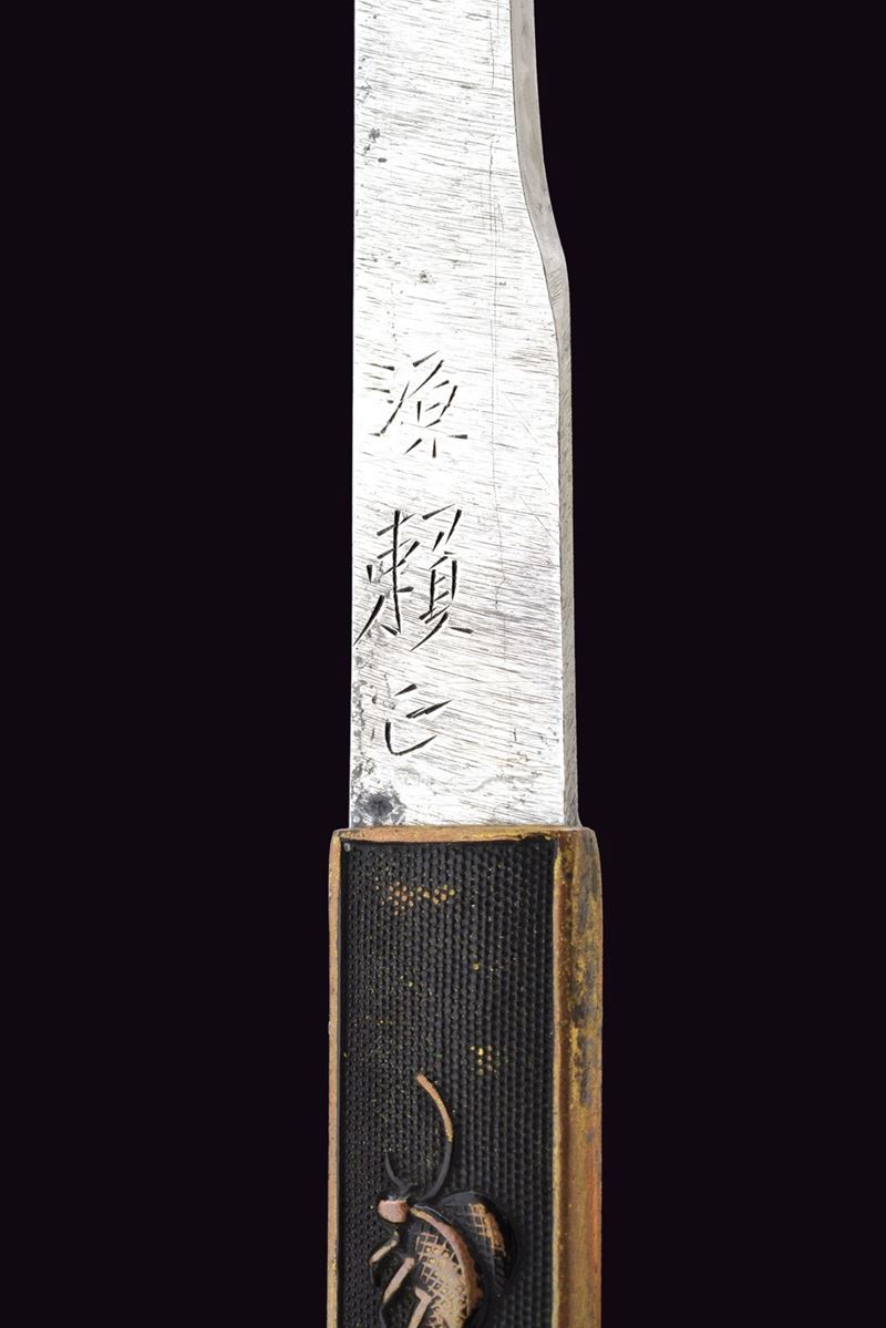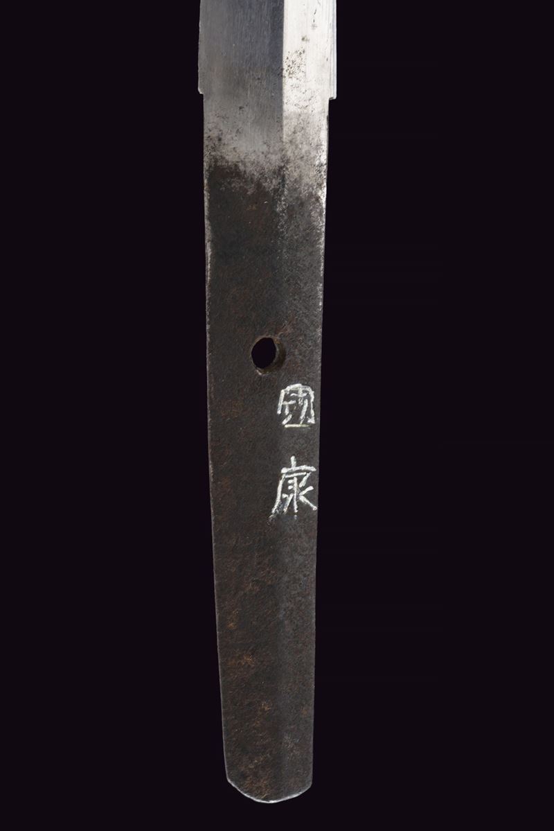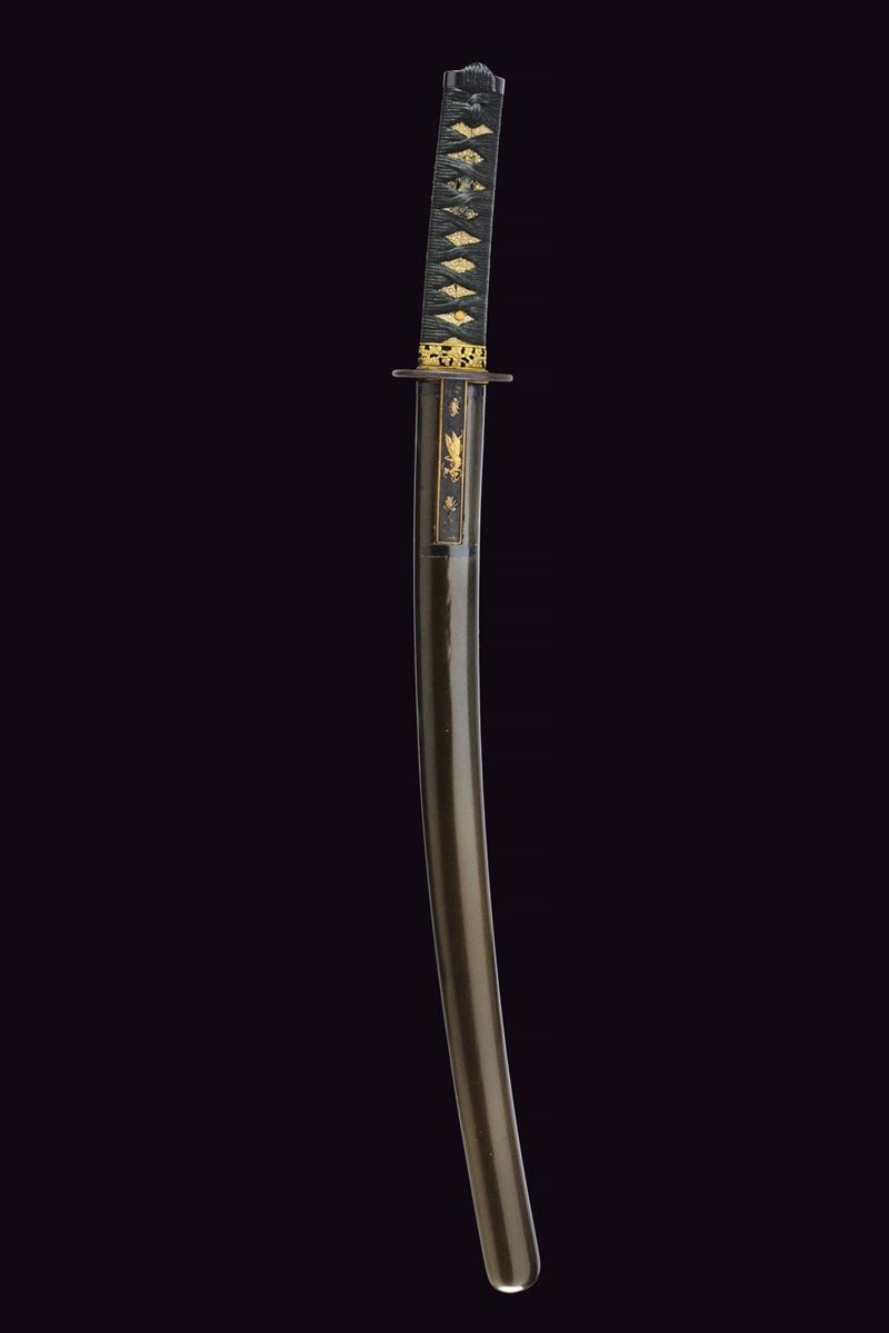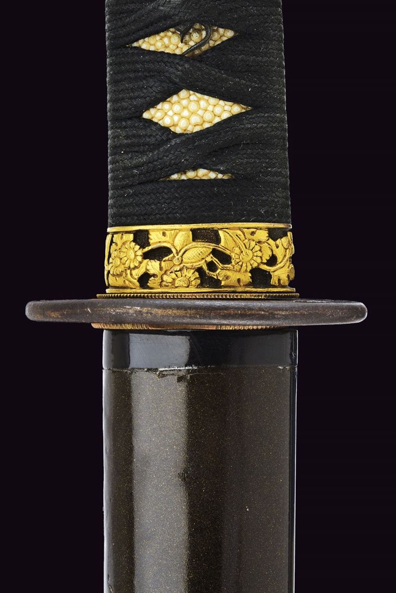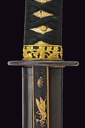 Shinogi-zukuri blade, Iori-mune (Nagasa 45.8 cm) with slight traces of hamon and hada. Some Kizu, including a large dent on the edge. Nakago with a Mekugi-ana. Mei (characters repainted in white). Habaki in two elements, one in copper covered with silver foil, one in gilded metal. Composite Koshirae, partly nineteenth-century and probably supplemented with later elements (twentieth century). Maru Gata Tsuba in iron with openwork decoration featuring cranes and sea foam. Fuchi in irogane with gold flowers in relief. Simple smooth lacquered kashira, non-metallic. Tsuka-ito in brown-green fabric. Tsuka with Samè in stingray leather. Menuki in irogane depicting insects and fruit, with oxidation. Saya in mottled brown lacquer. Signed Kogatana, Kozuka with mantis in relief and other insects.