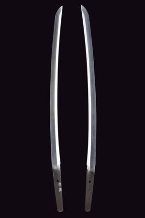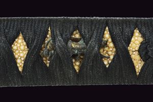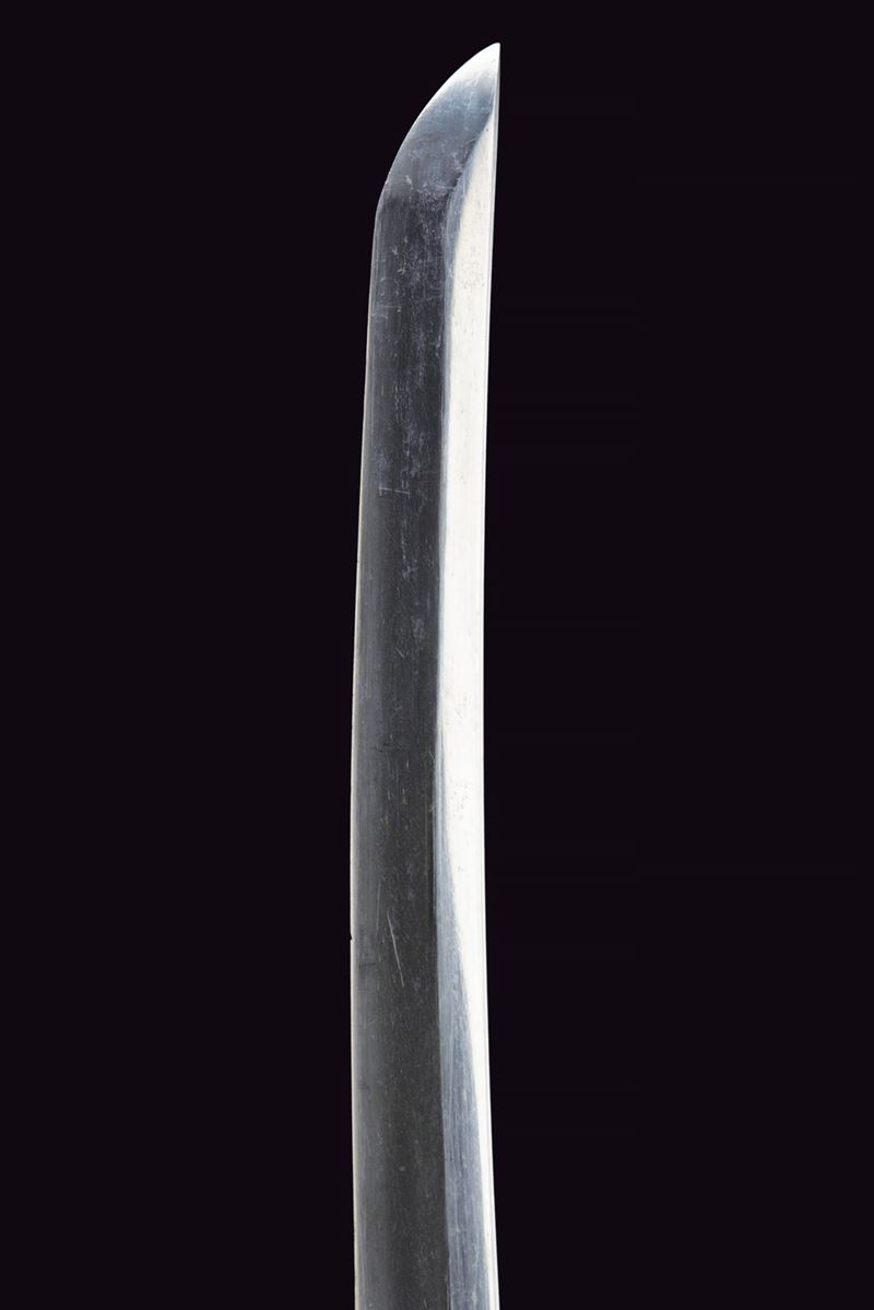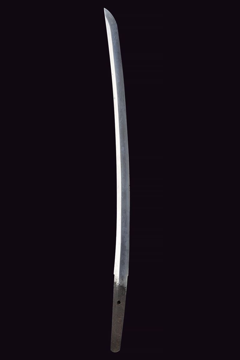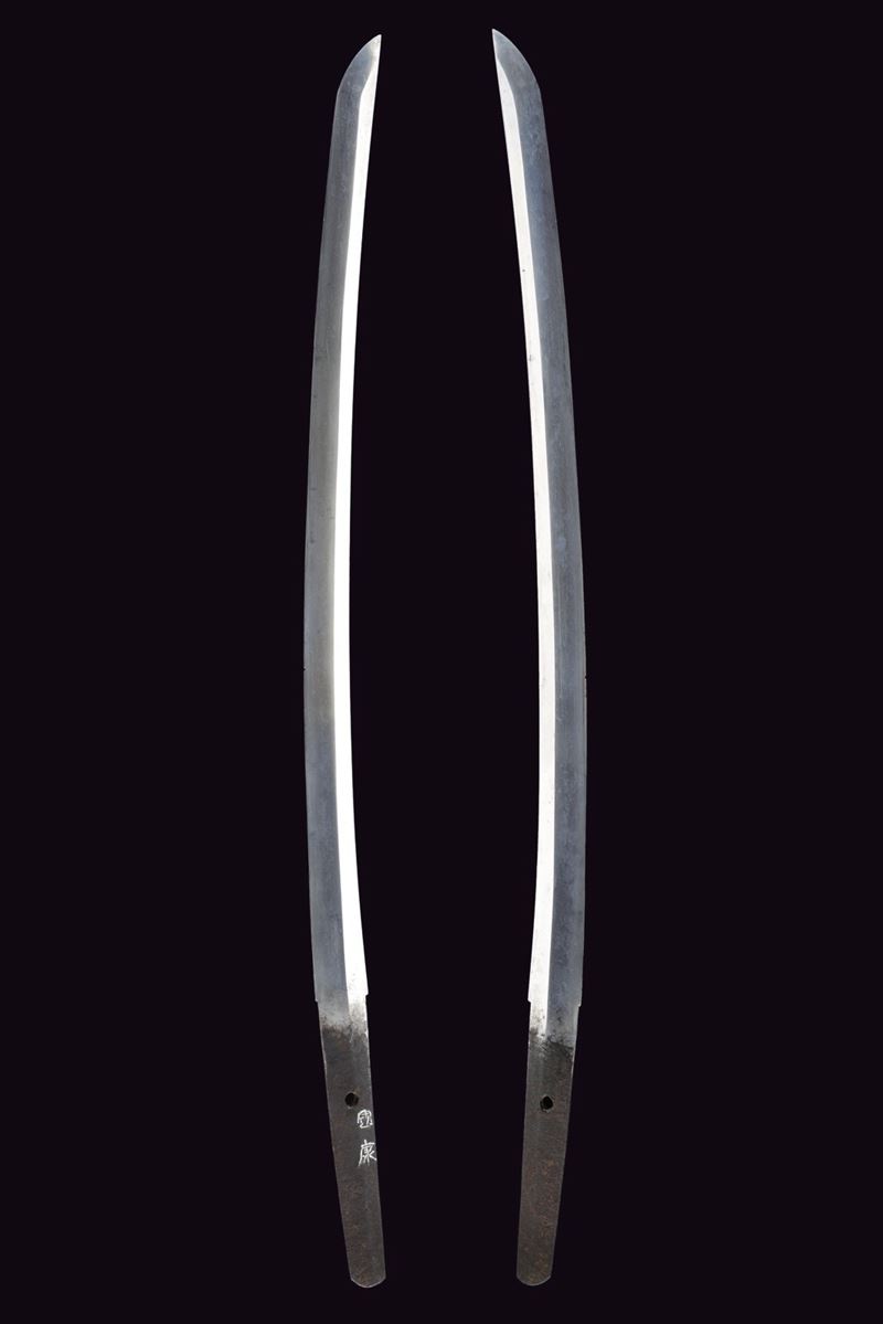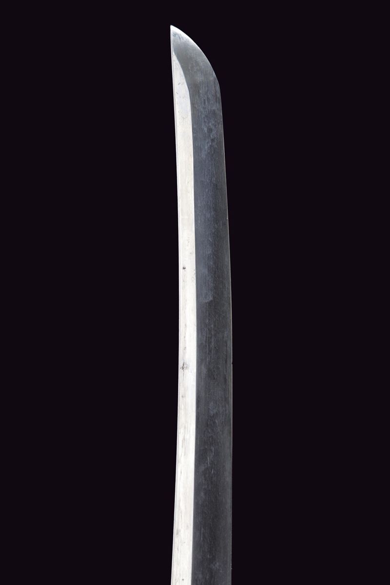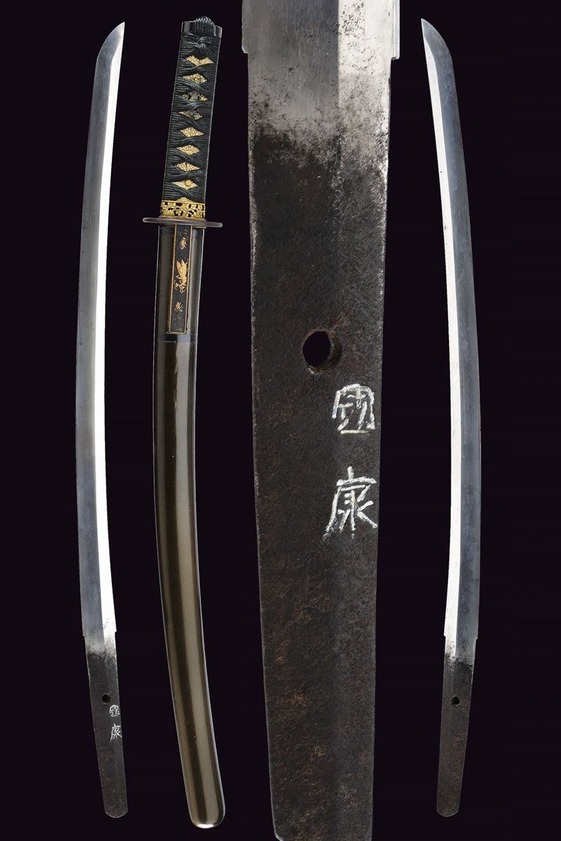 Shinogi-zukuri blade, Iori-mune (Nagasa 45.8 cm) with slight traces of hamon and hada. Some Kizu, including a large dent on the edge. Nakago with a Mekugi-ana. Mei (characters repainted in white). Habaki in two elements, one in copper covered with silver foil, one in gilded metal. Composite Koshirae, partly nineteenth-century and probably supplemented with later elements (twentieth century). Maru Gata Tsuba in iron with openwork decoration featuring cranes and sea foam. Fuchi in irogane with gold flowers in relief. Simple smooth lacquered kashira, non-metallic. Tsuka-ito in brown-green fabric. Tsuka with Samè in stingray leather. Menuki in irogane depicting insects and fruit, with oxidation. Saya in mottled brown lacquer. Signed Kogatana, Kozuka with mantis in relief and other insects.