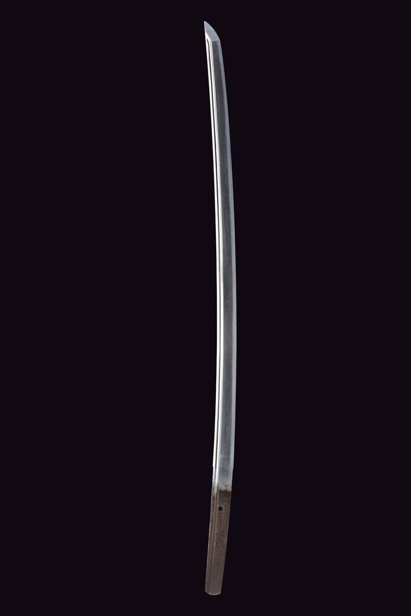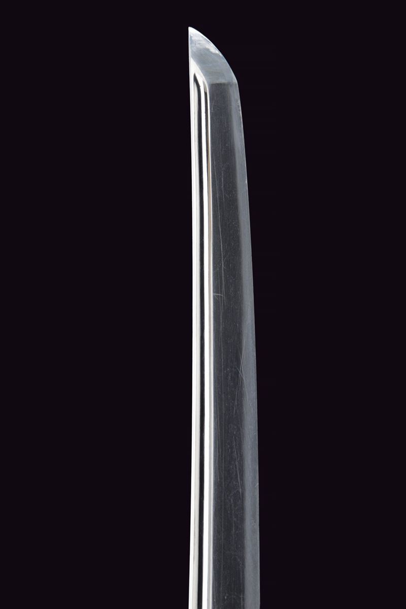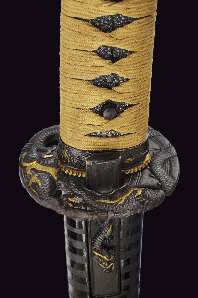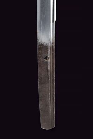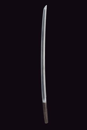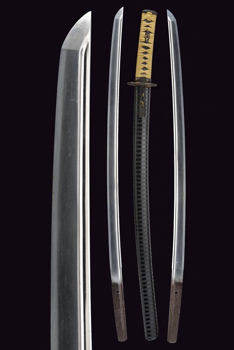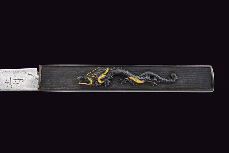 Nagasa (length 52.2 cm), with hi on both sides that continues onto the nakago. Copper habaki. Nakago mumei with a mekugi-ana. Koshirae with iron tsuba, sukashi-bori, maru-bori depicting a dragon. The gold parts are restored. Fuchi-kashira and menuki blackened and partially gilded (restored). Modern saya in painted wood with Kogai and Kozuka (blade mei). With NBTHK certificate.